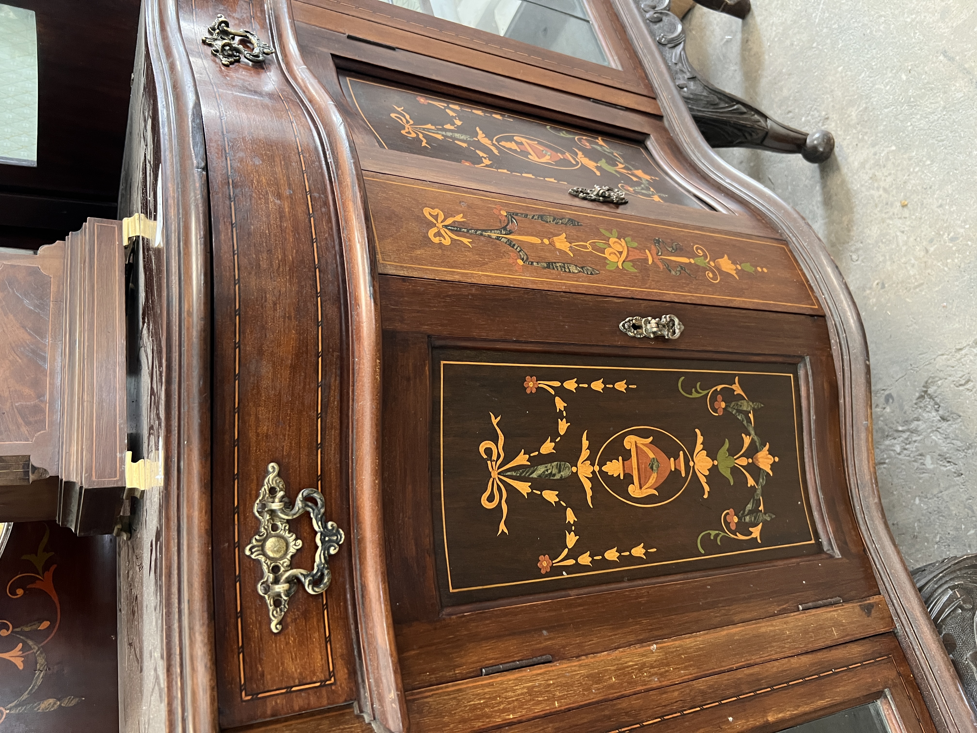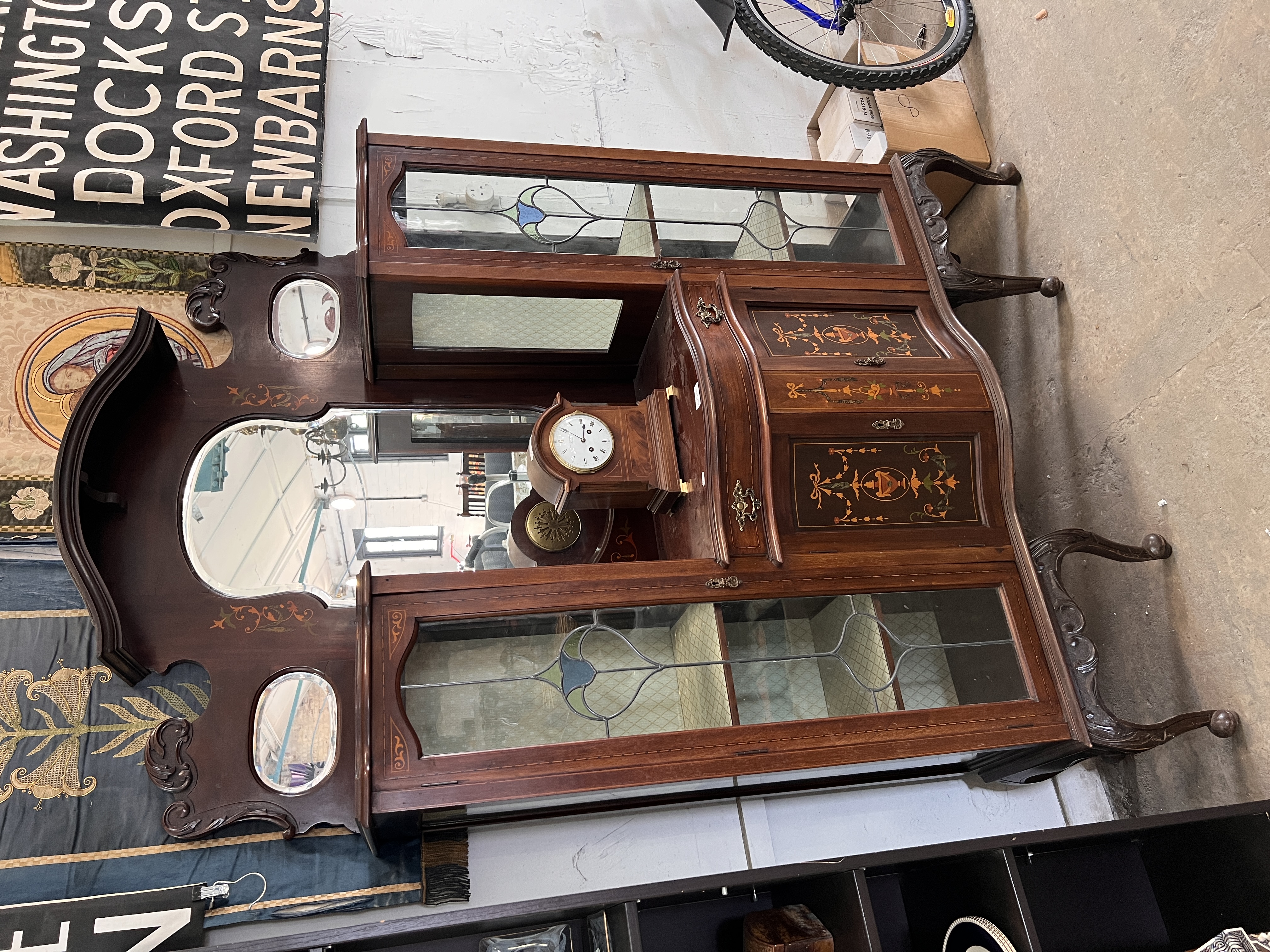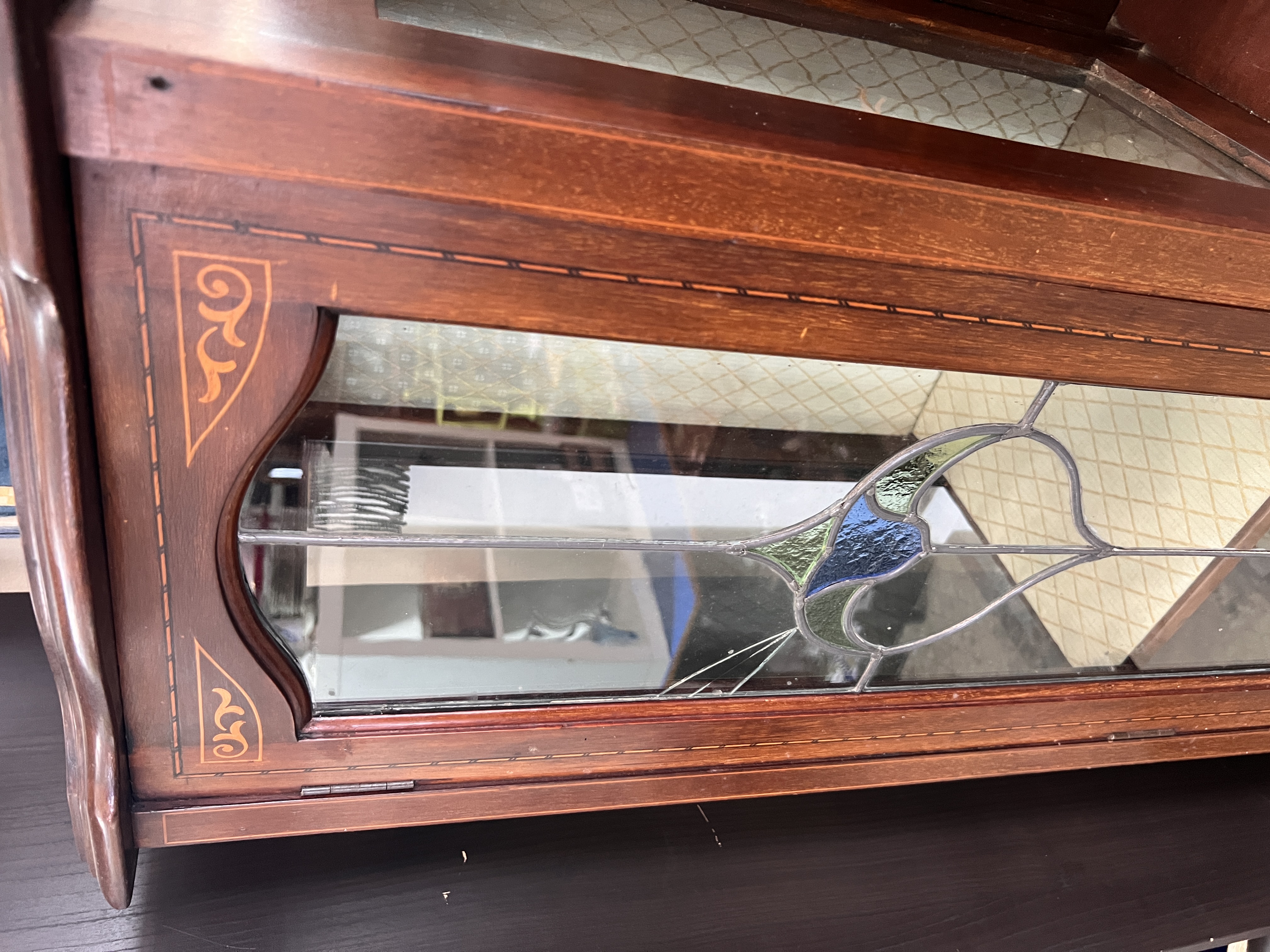 An Art Nouveau display case with leaded light and silk lined cupboards.