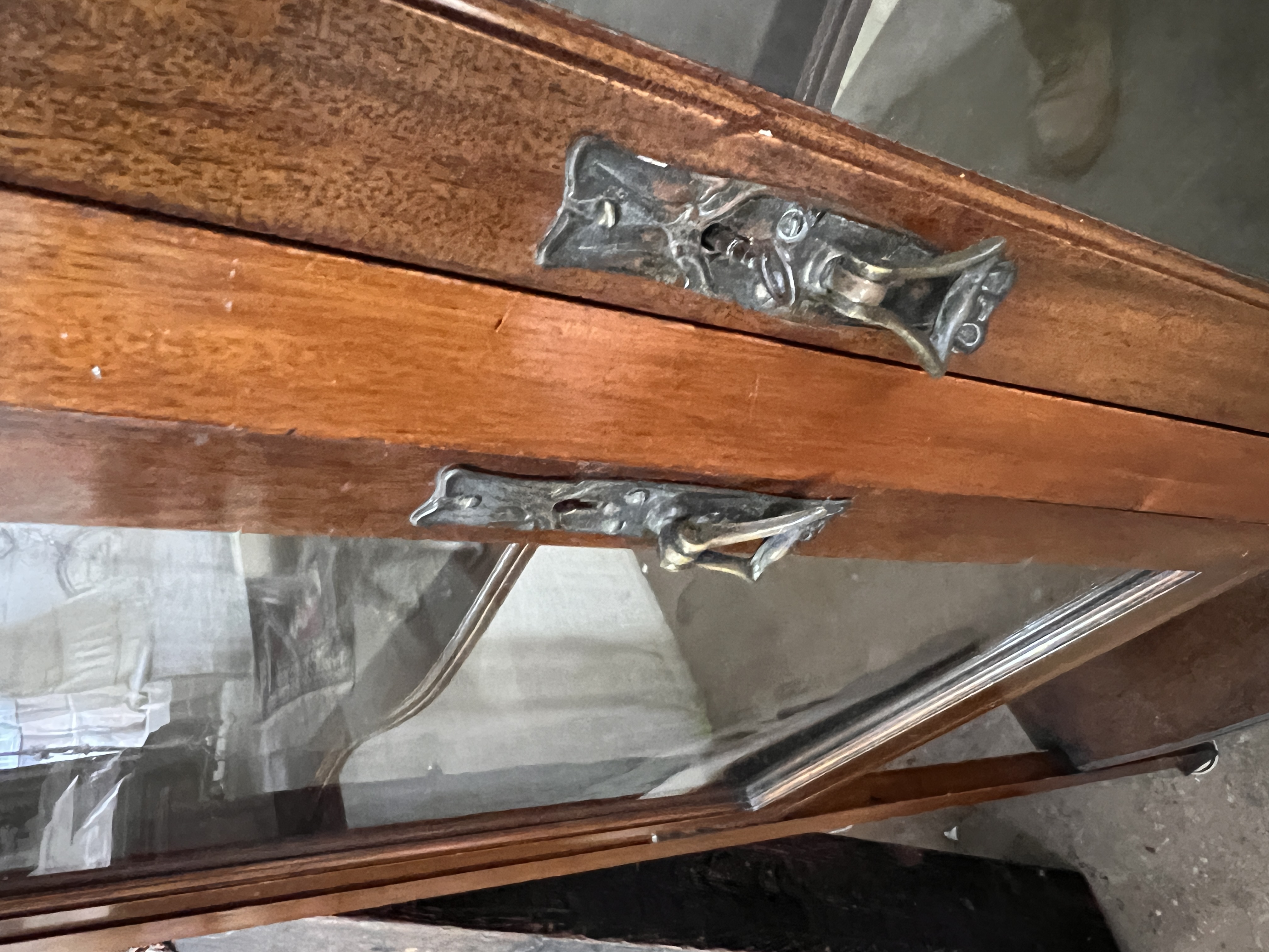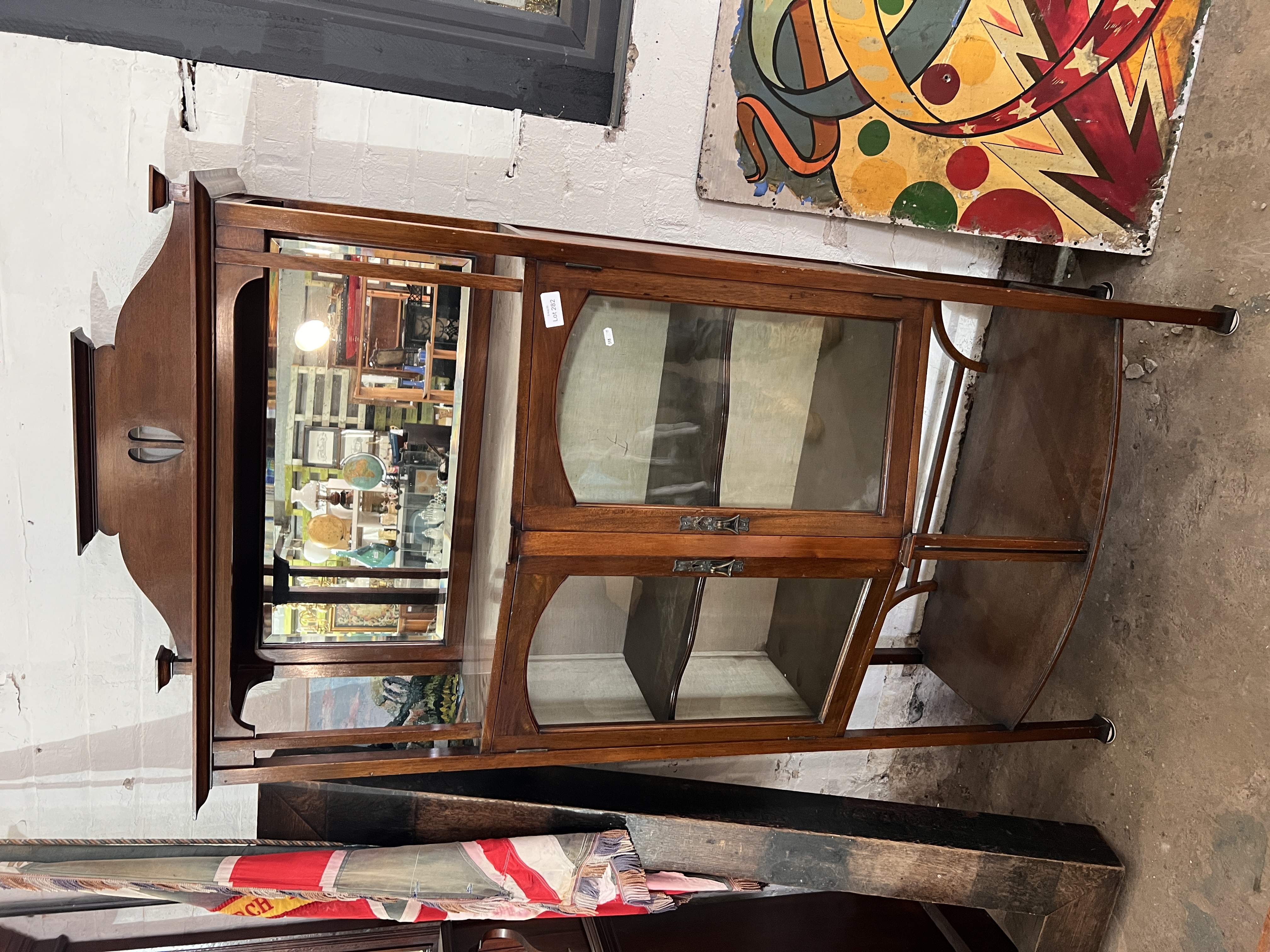 A Victorian Art Nouveau display case with mirror back and rolled glass doors.