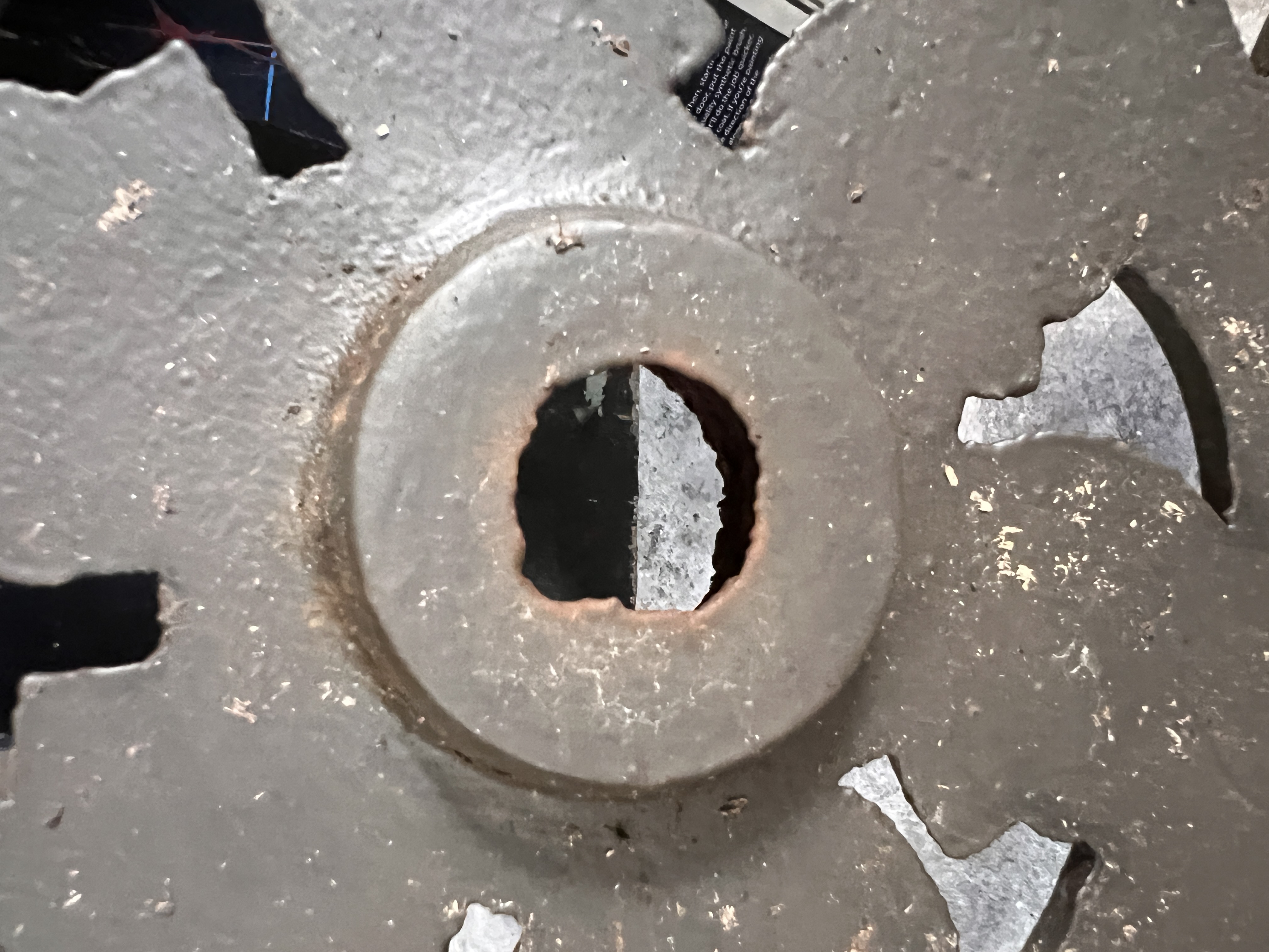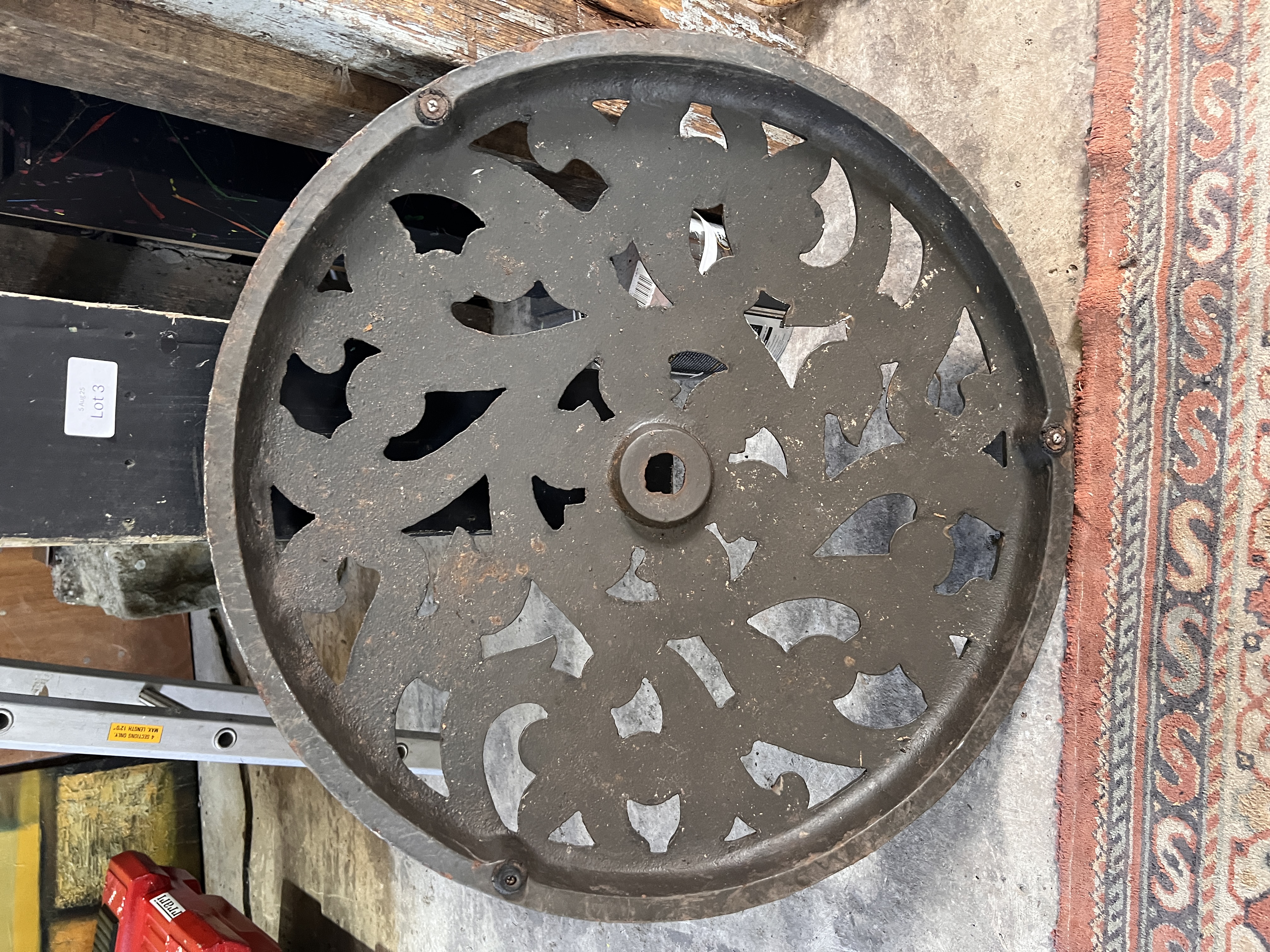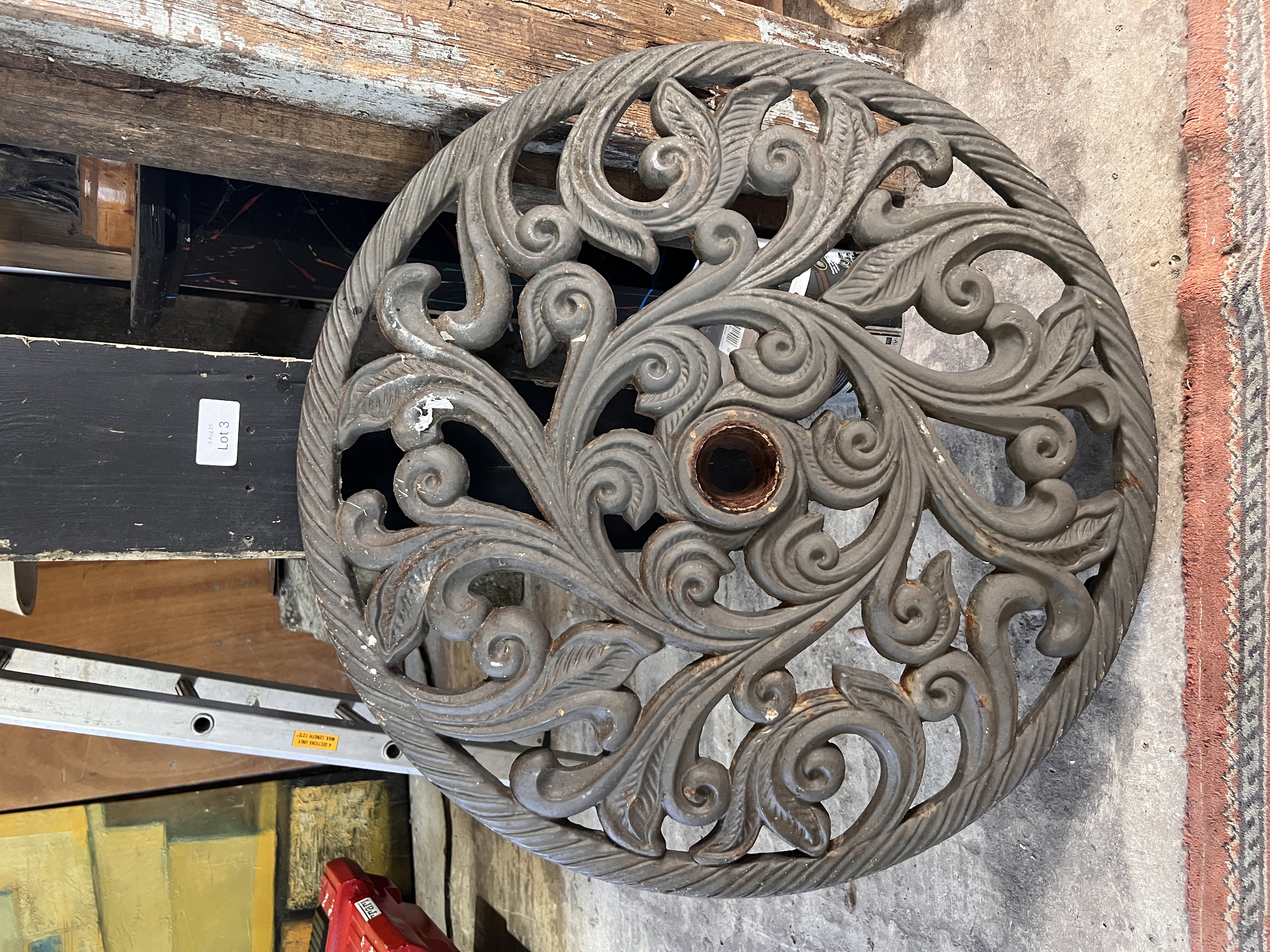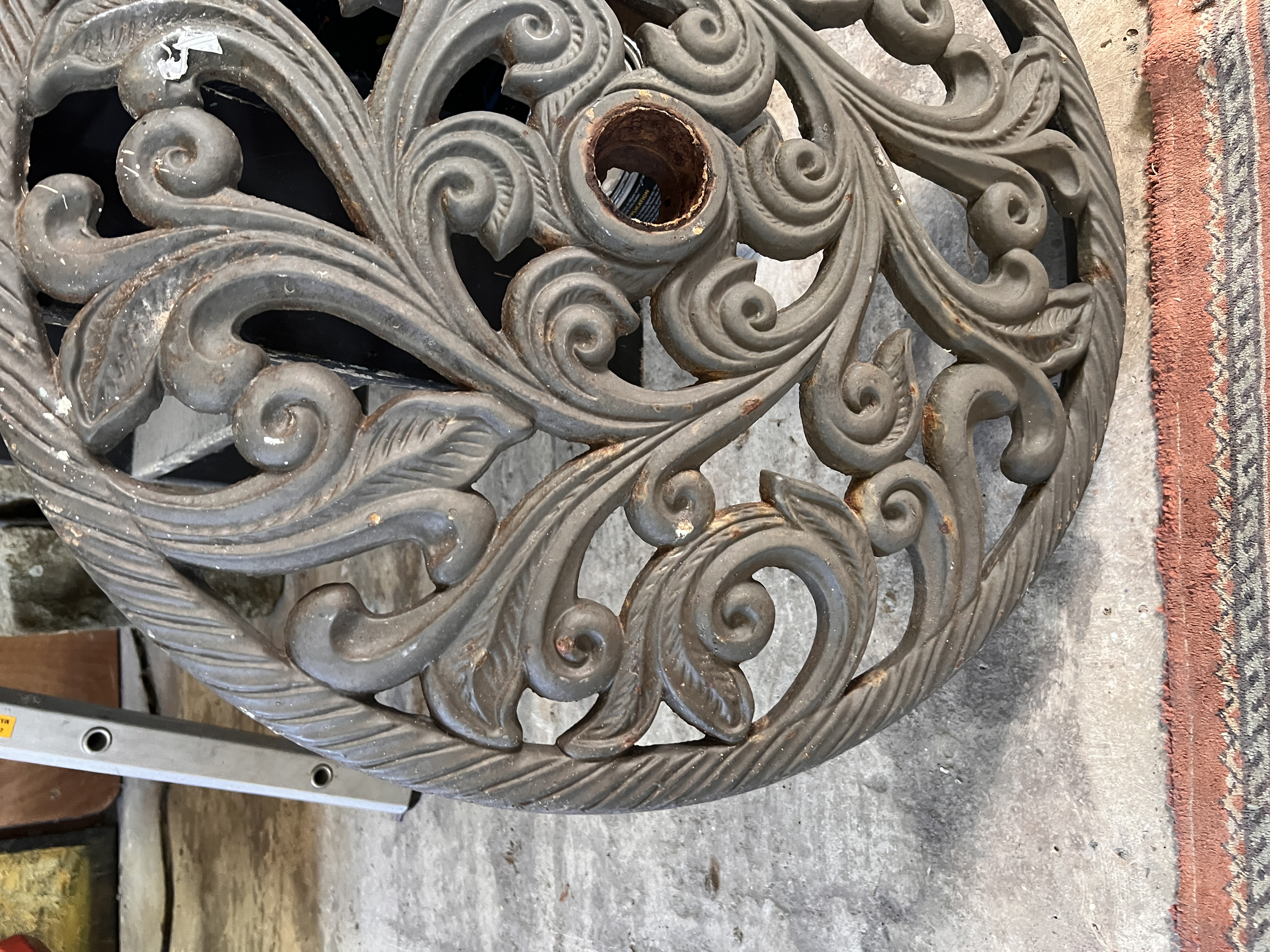 A large heavy cast base for parasol or similar with scroll work pattern. 62cm wide.