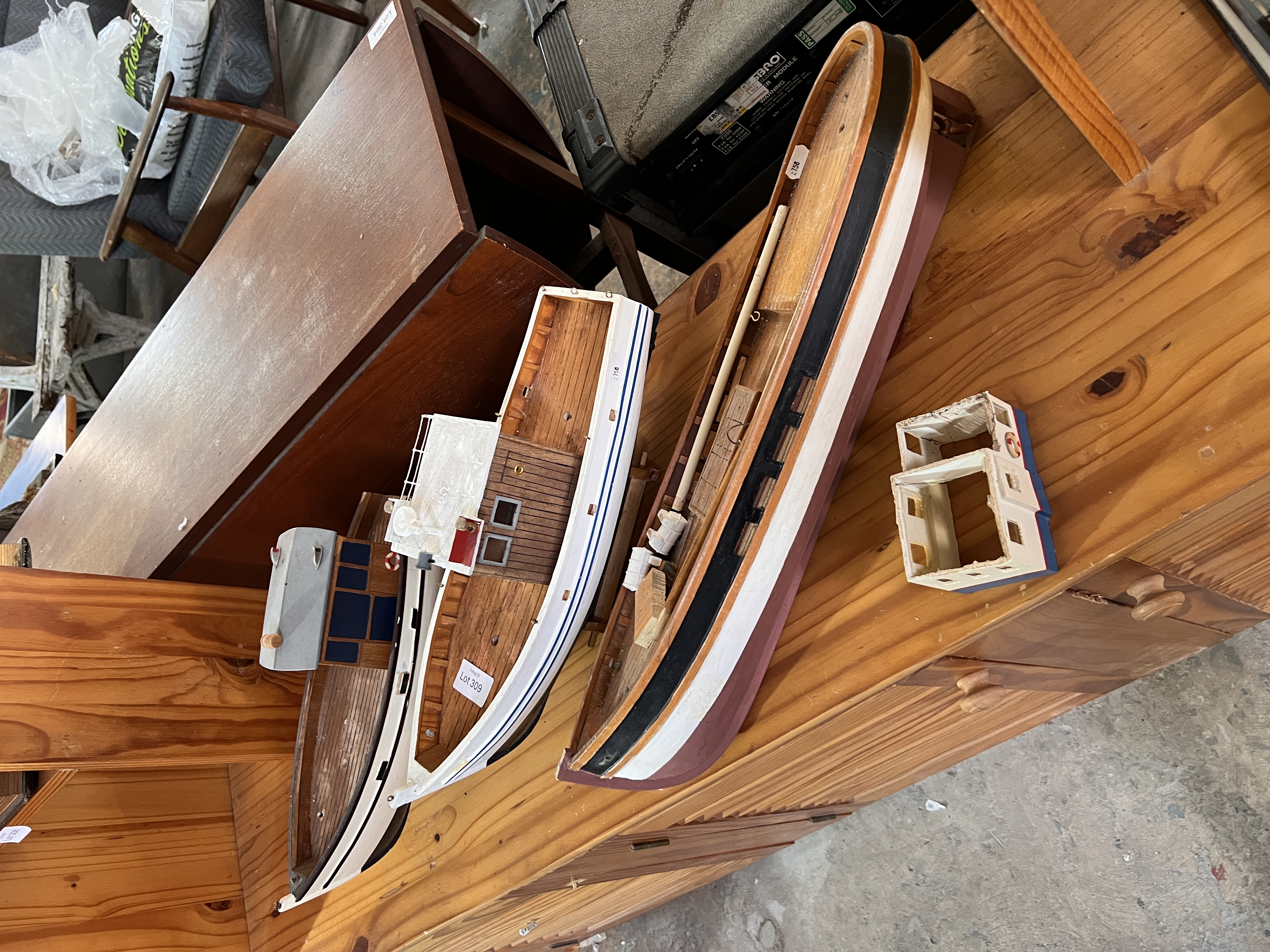 Three hand-built model boats.