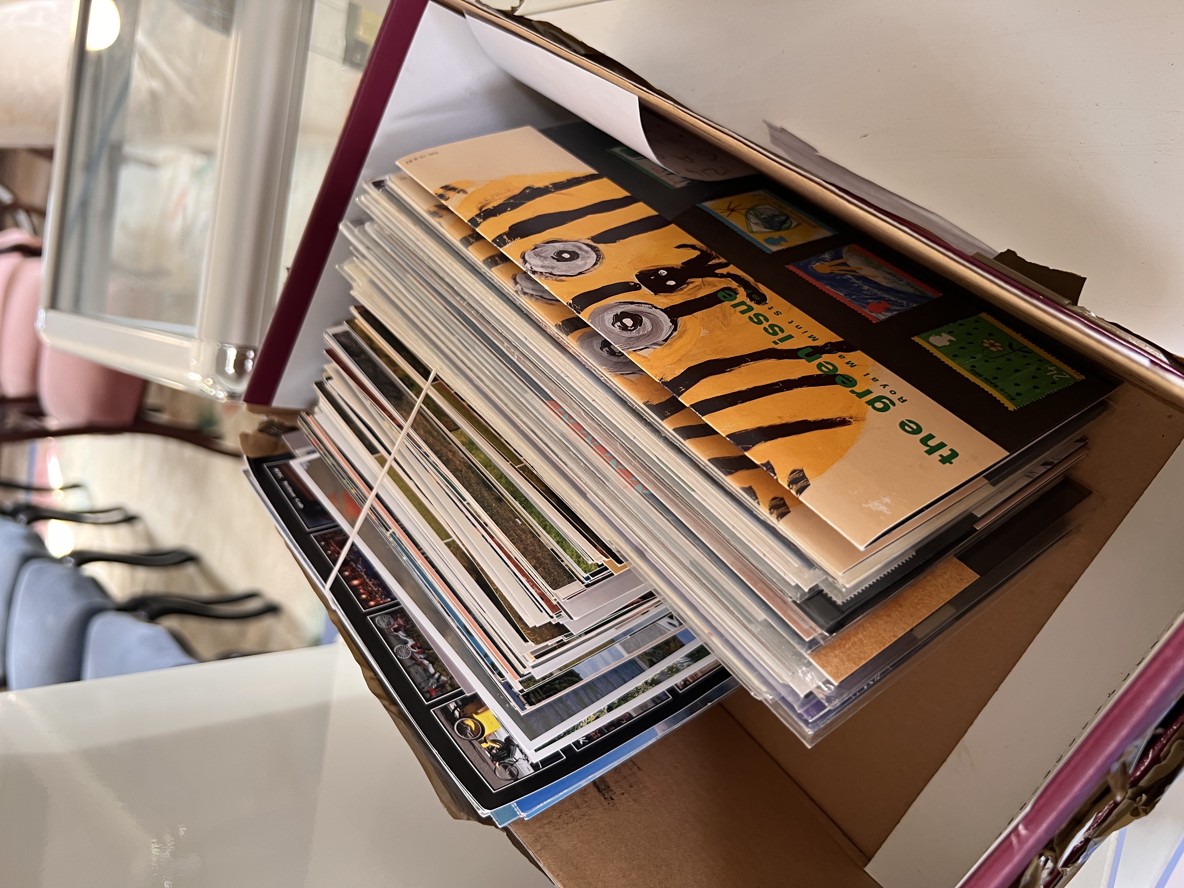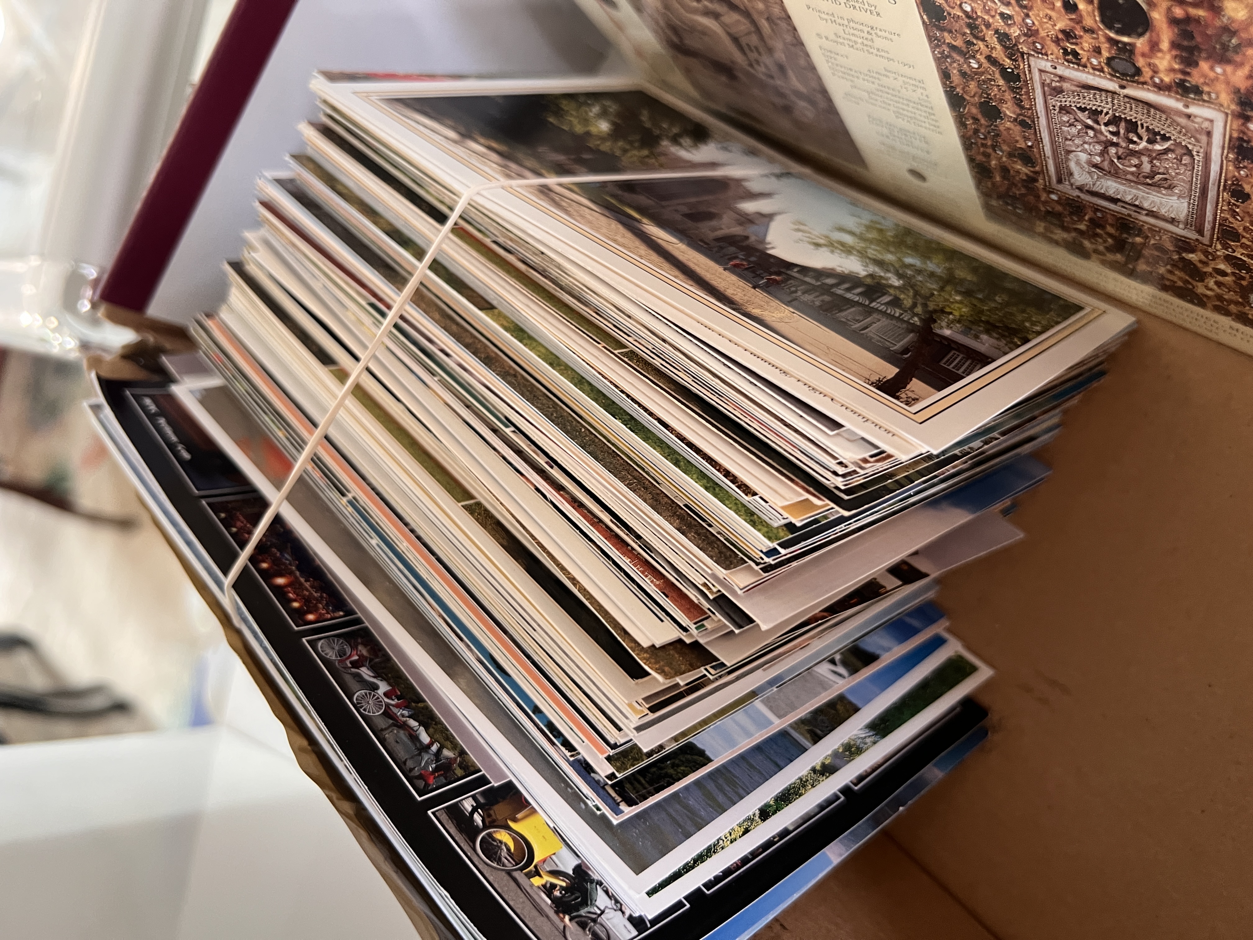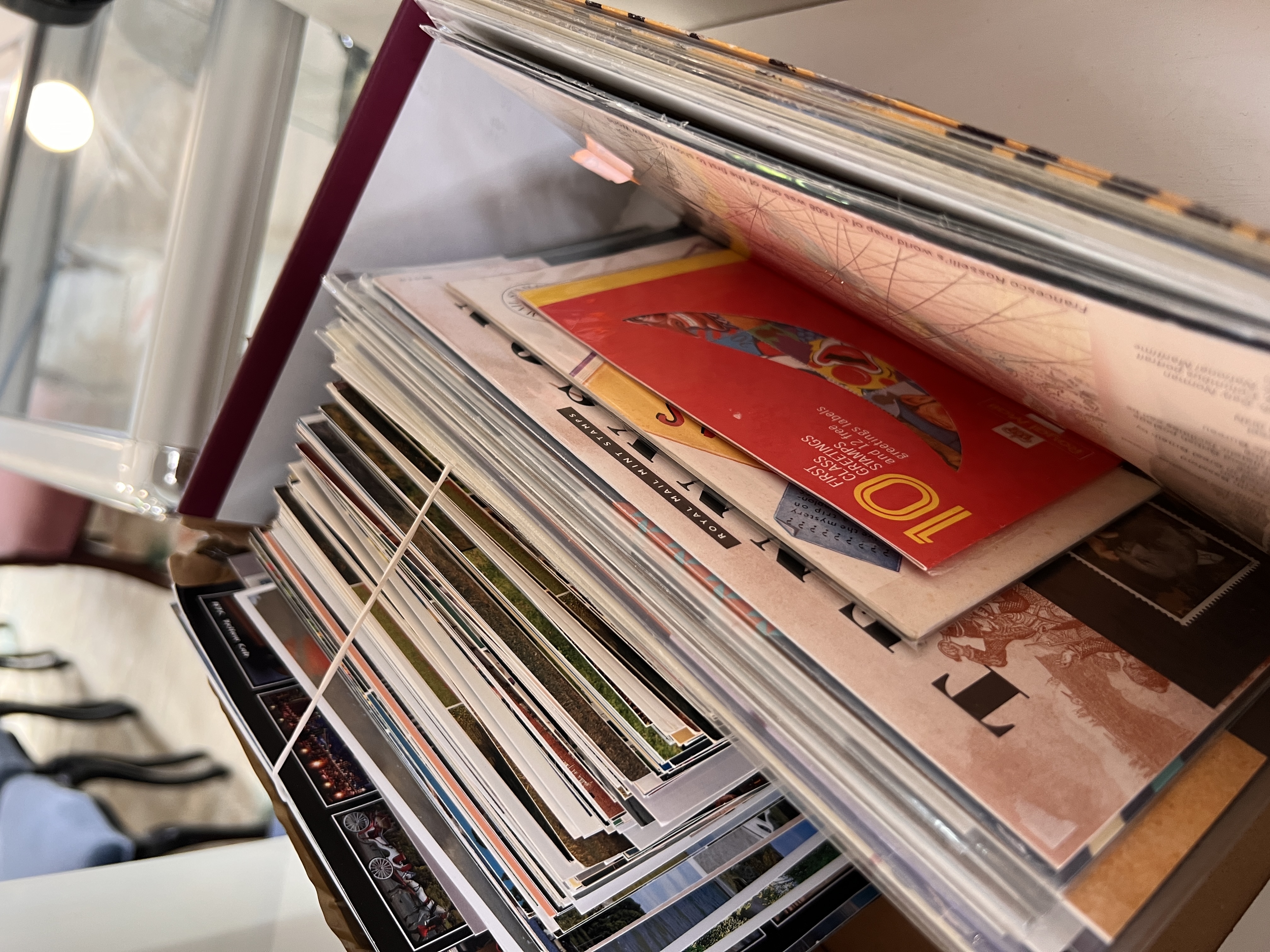 A selection of vintage postcards and first day cover stamp sets.
