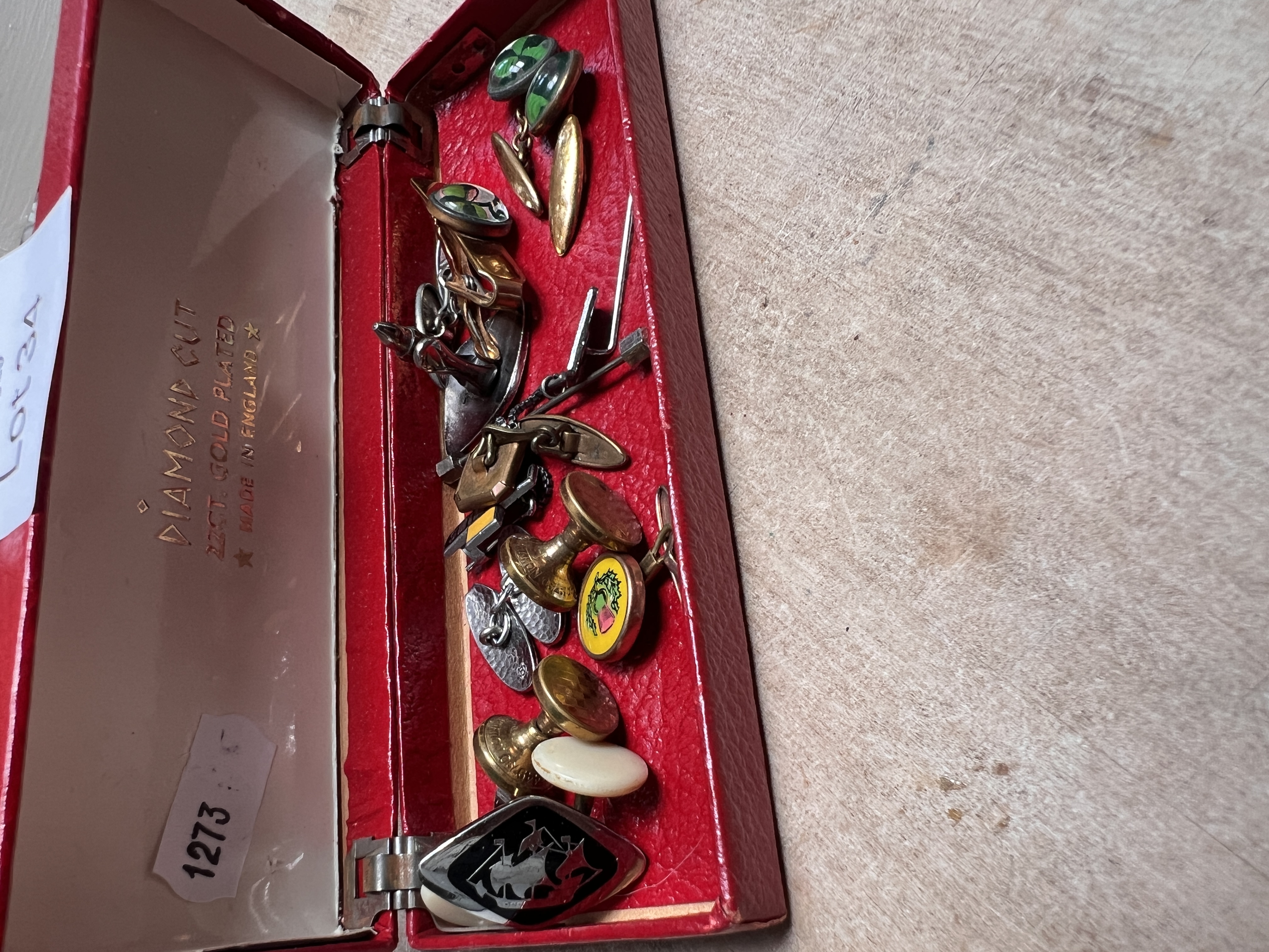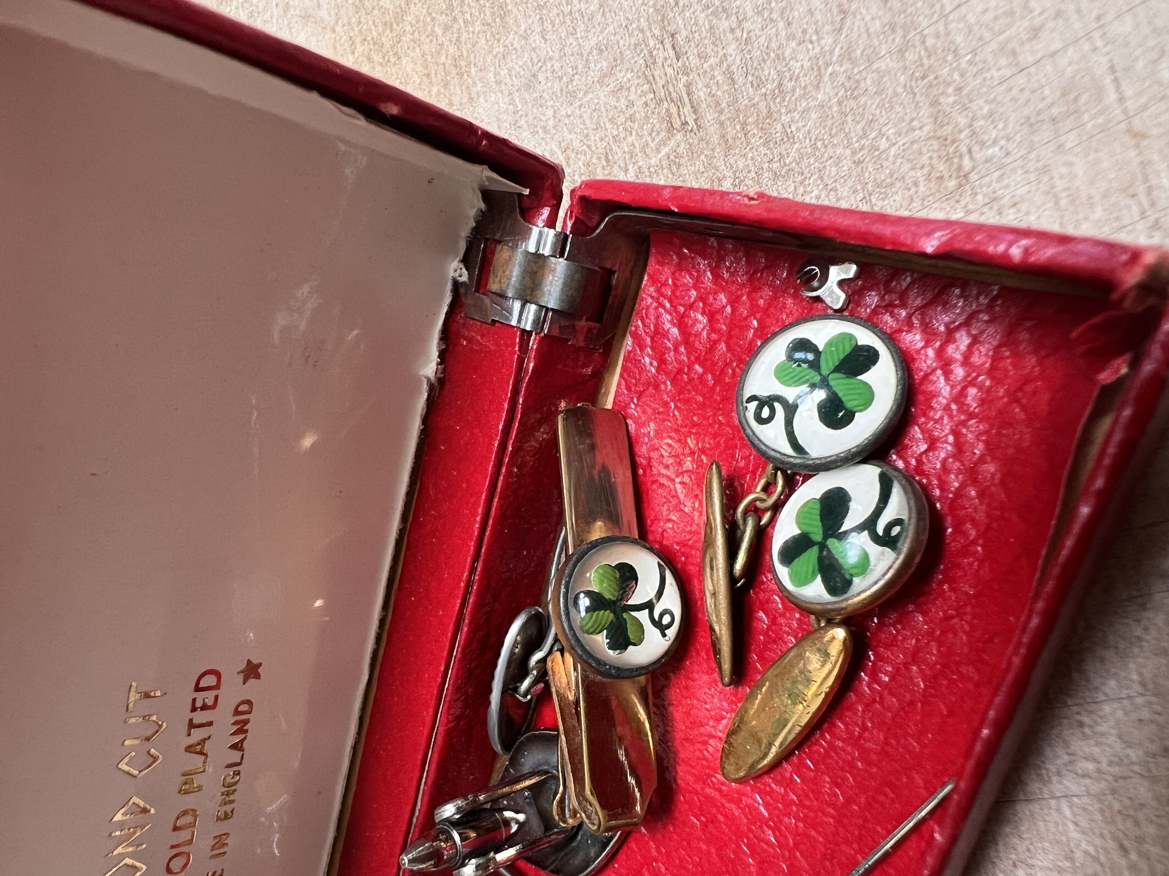 A selection of vintage cufflinks, including Shamrock pair and tie pin.