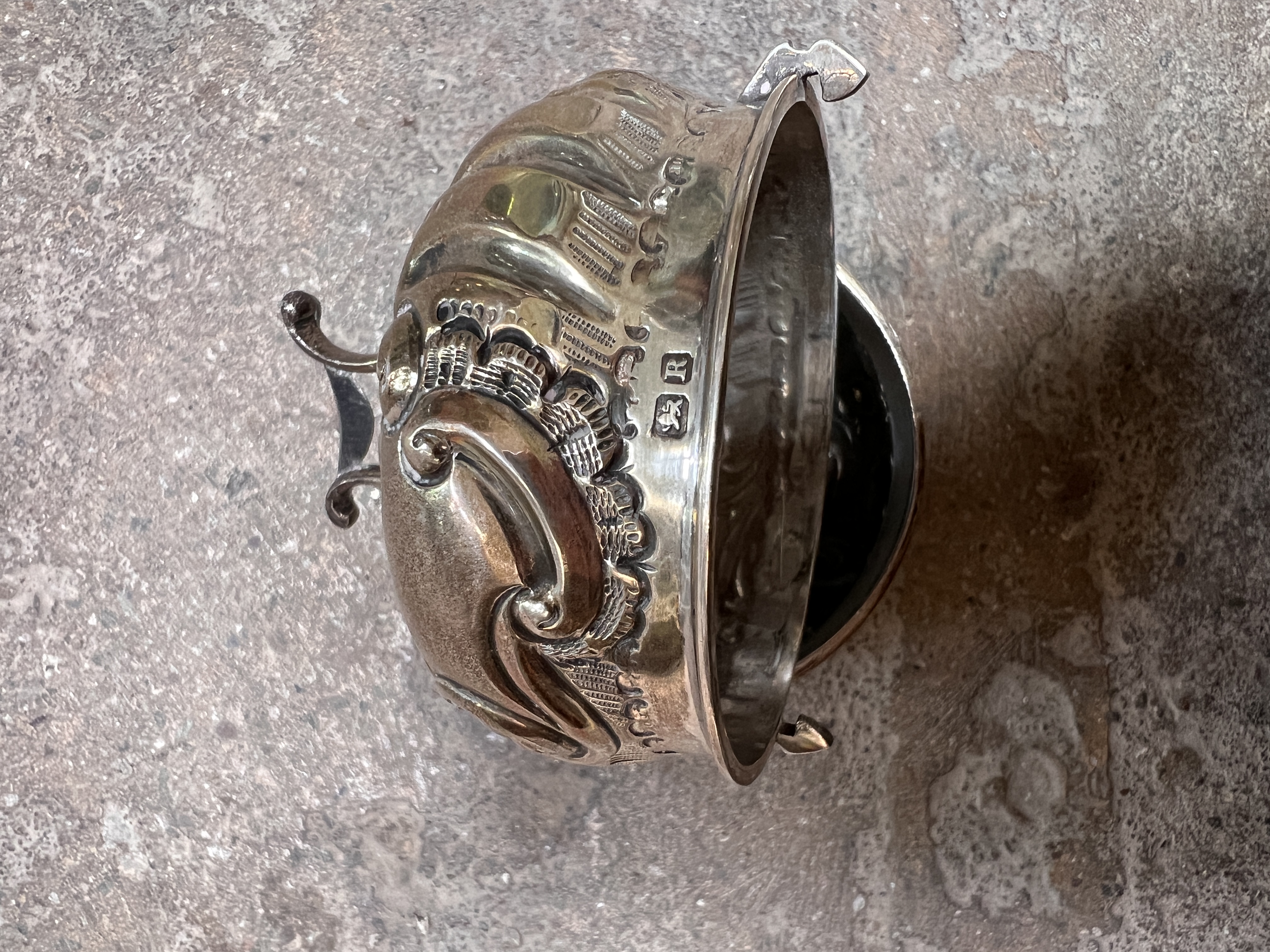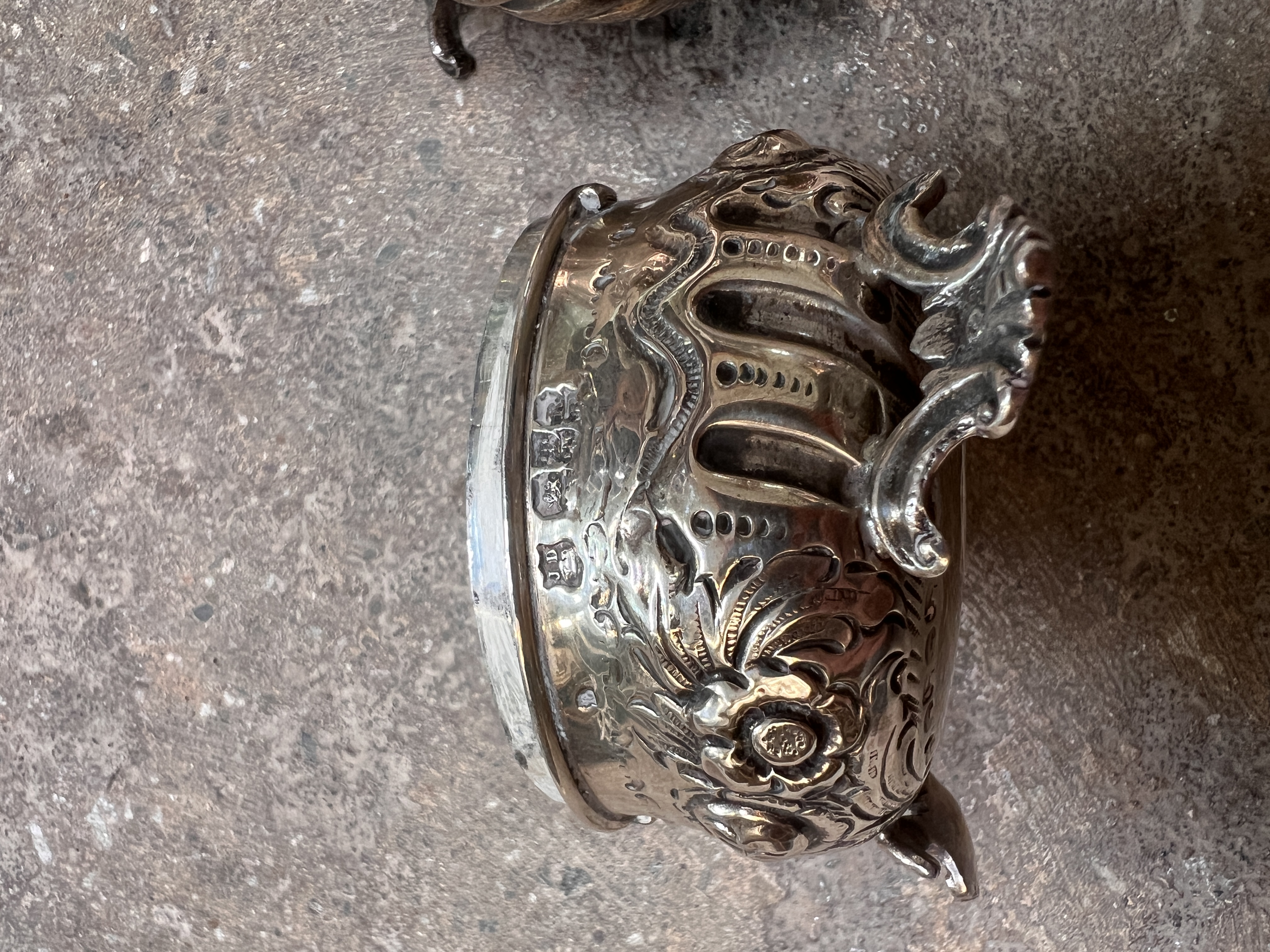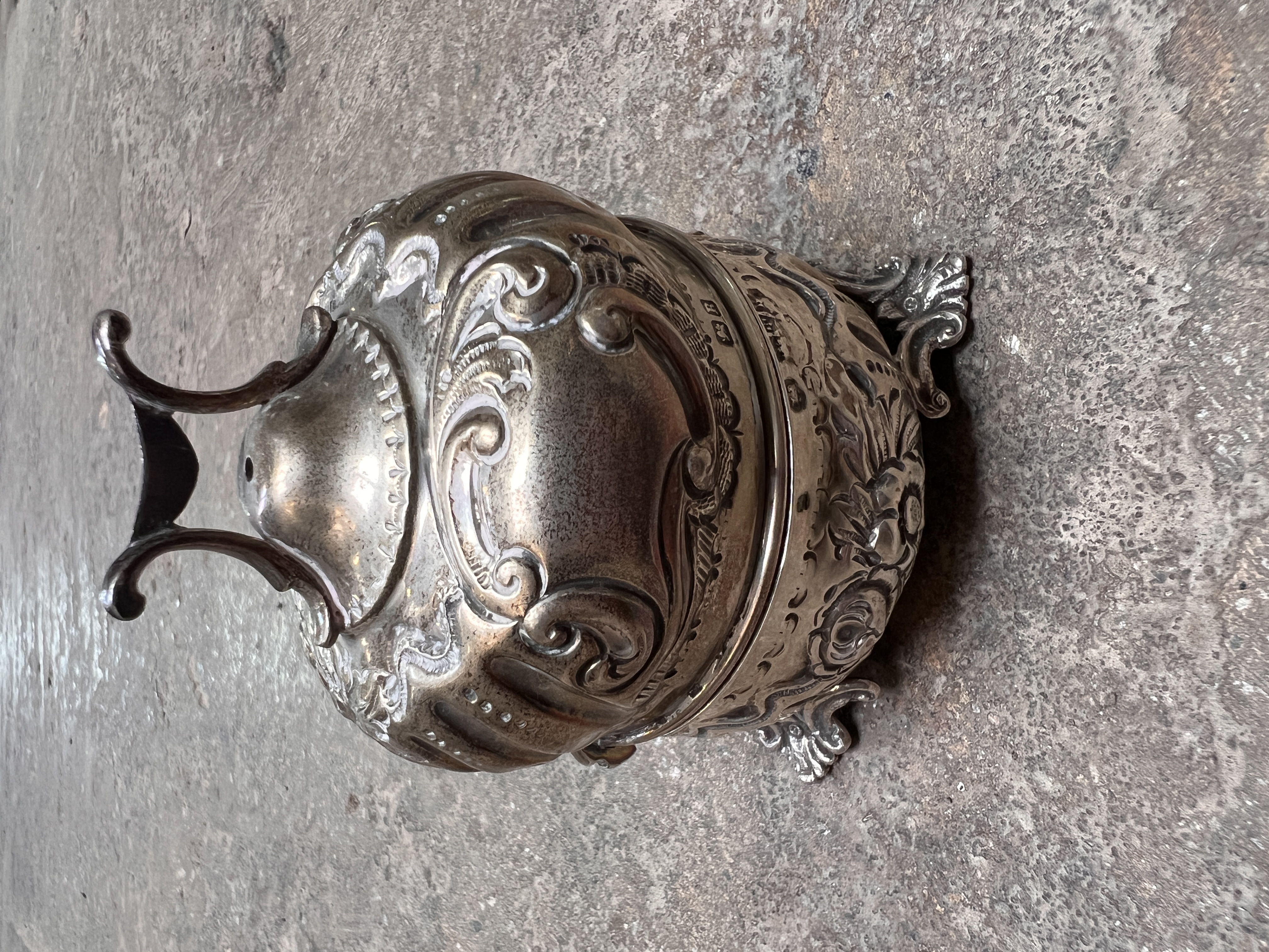 A Victorian HM silver string box, having chase work and floral decoration on tripod base. 101g total.