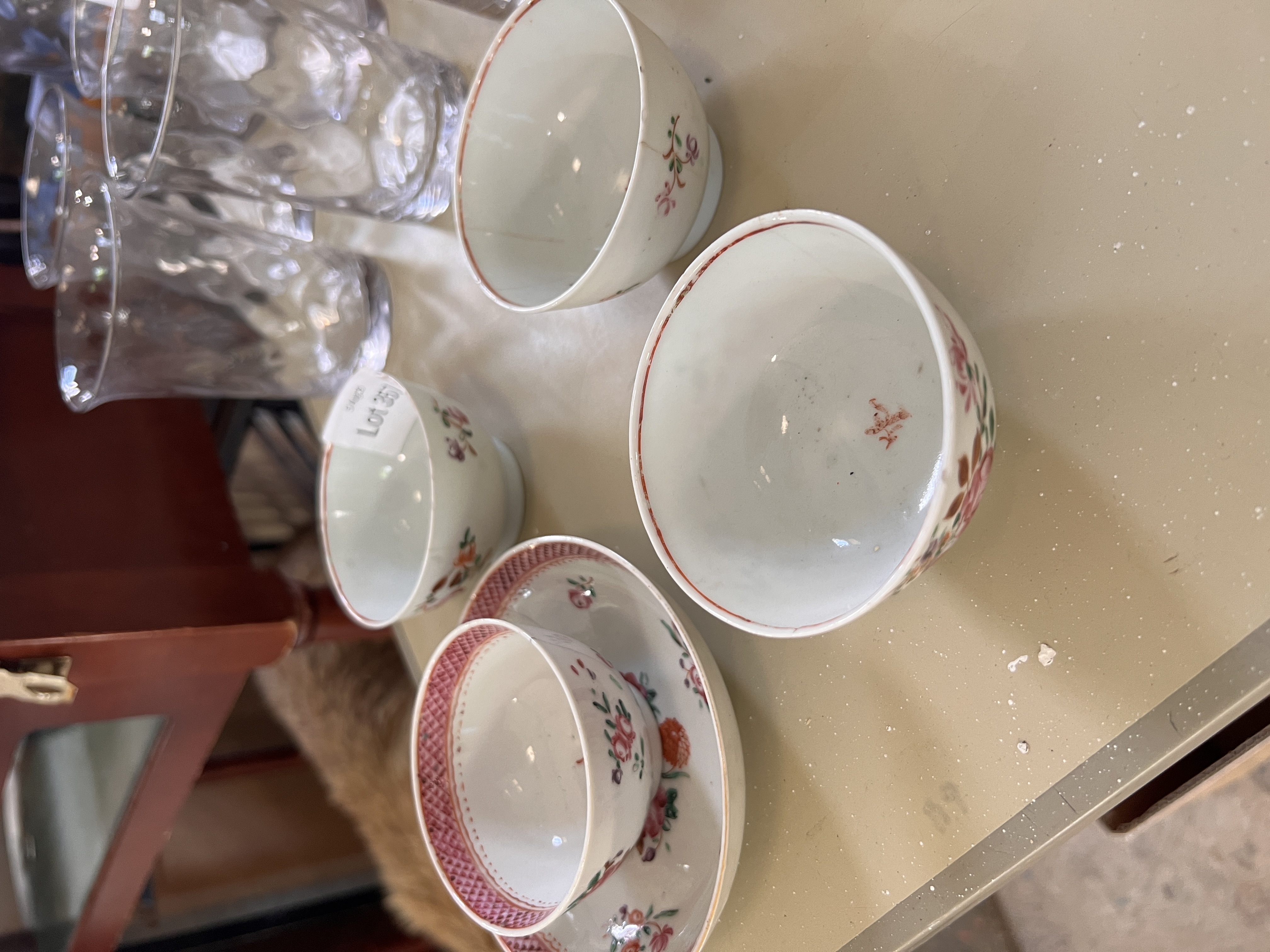 Four Chinese export tea bowls hand decorated with floral motif, bowl AF.