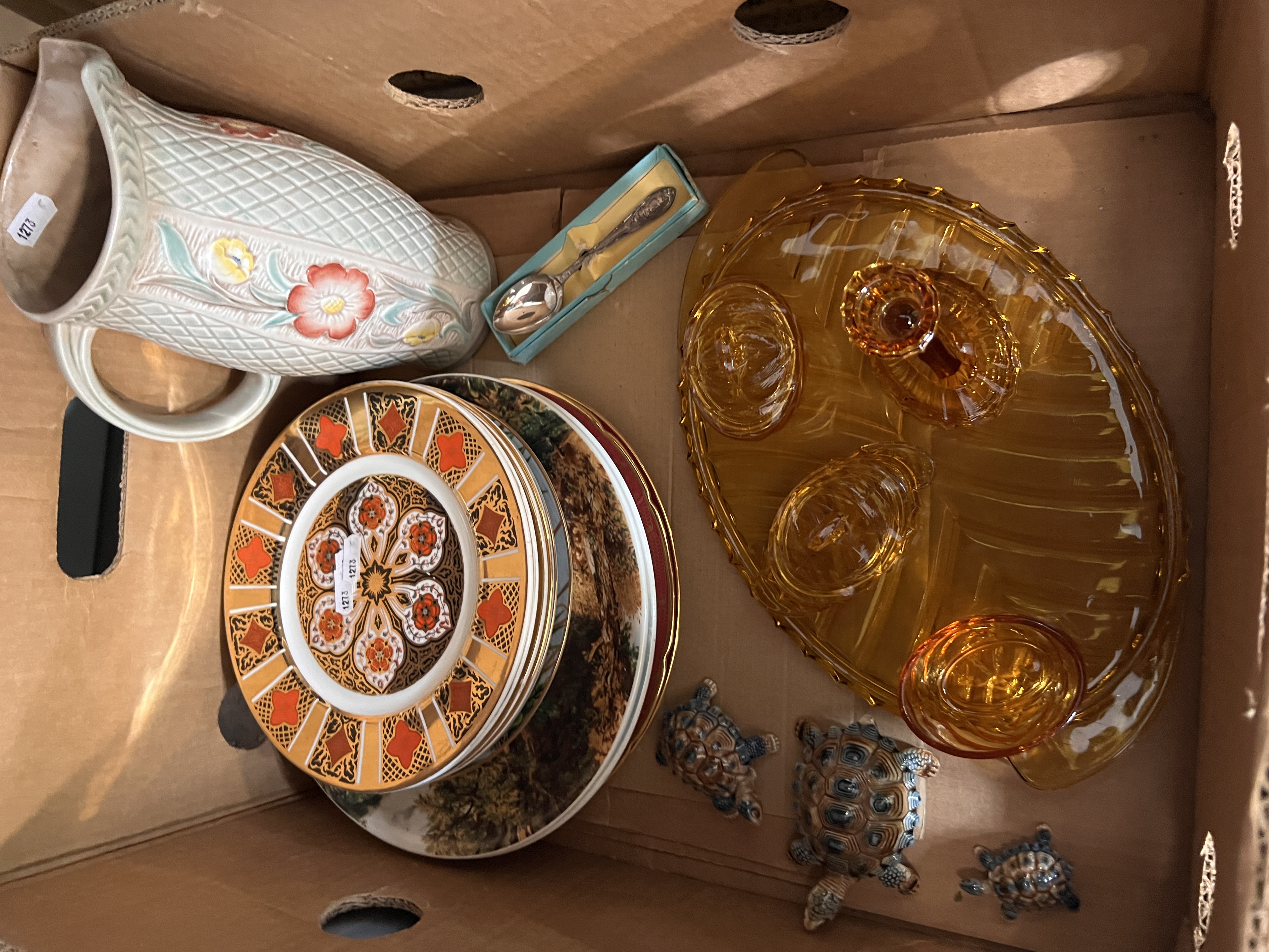 A selection of ceramics including Darby-style plates and amber glass dressing table set.
