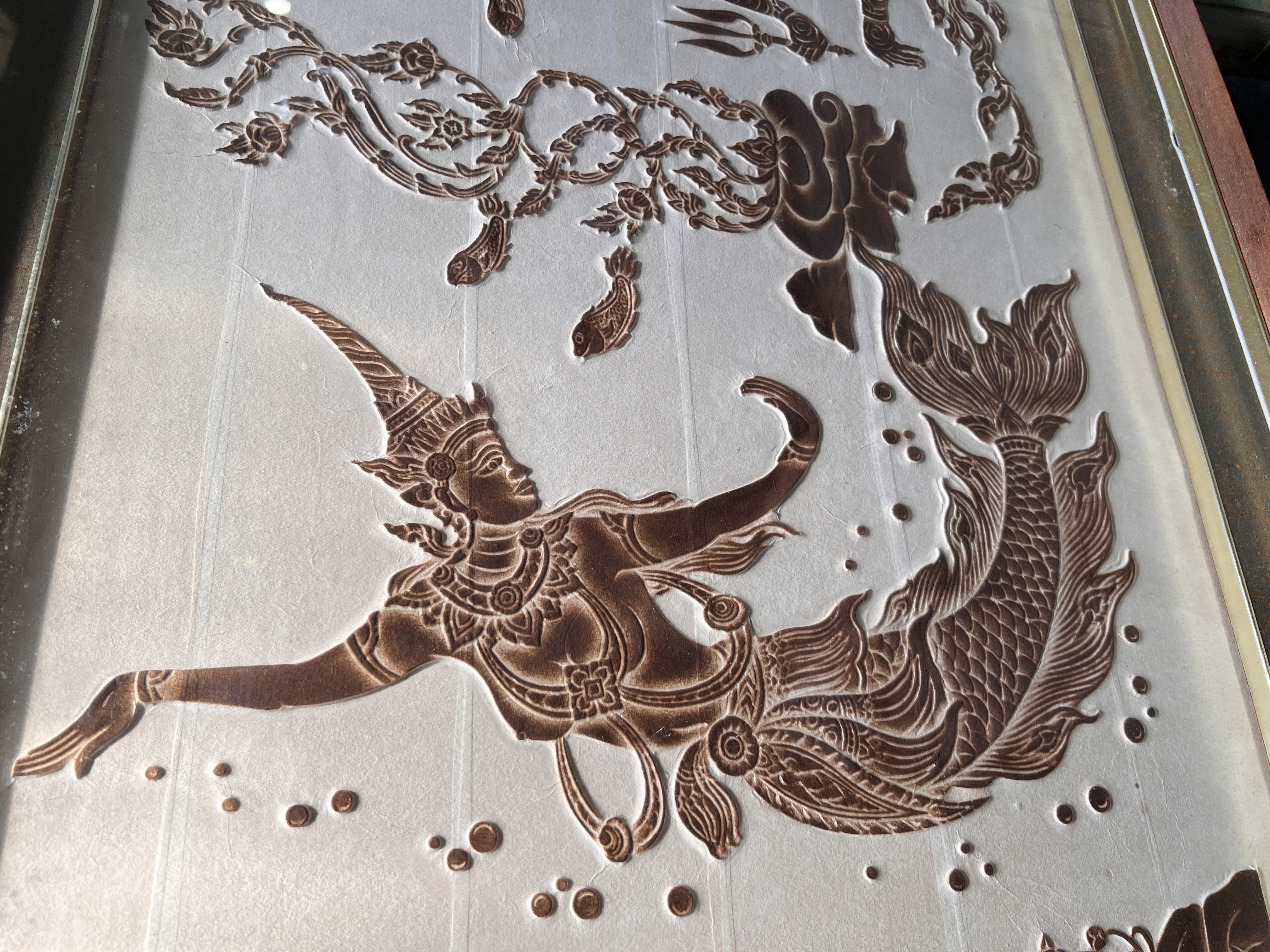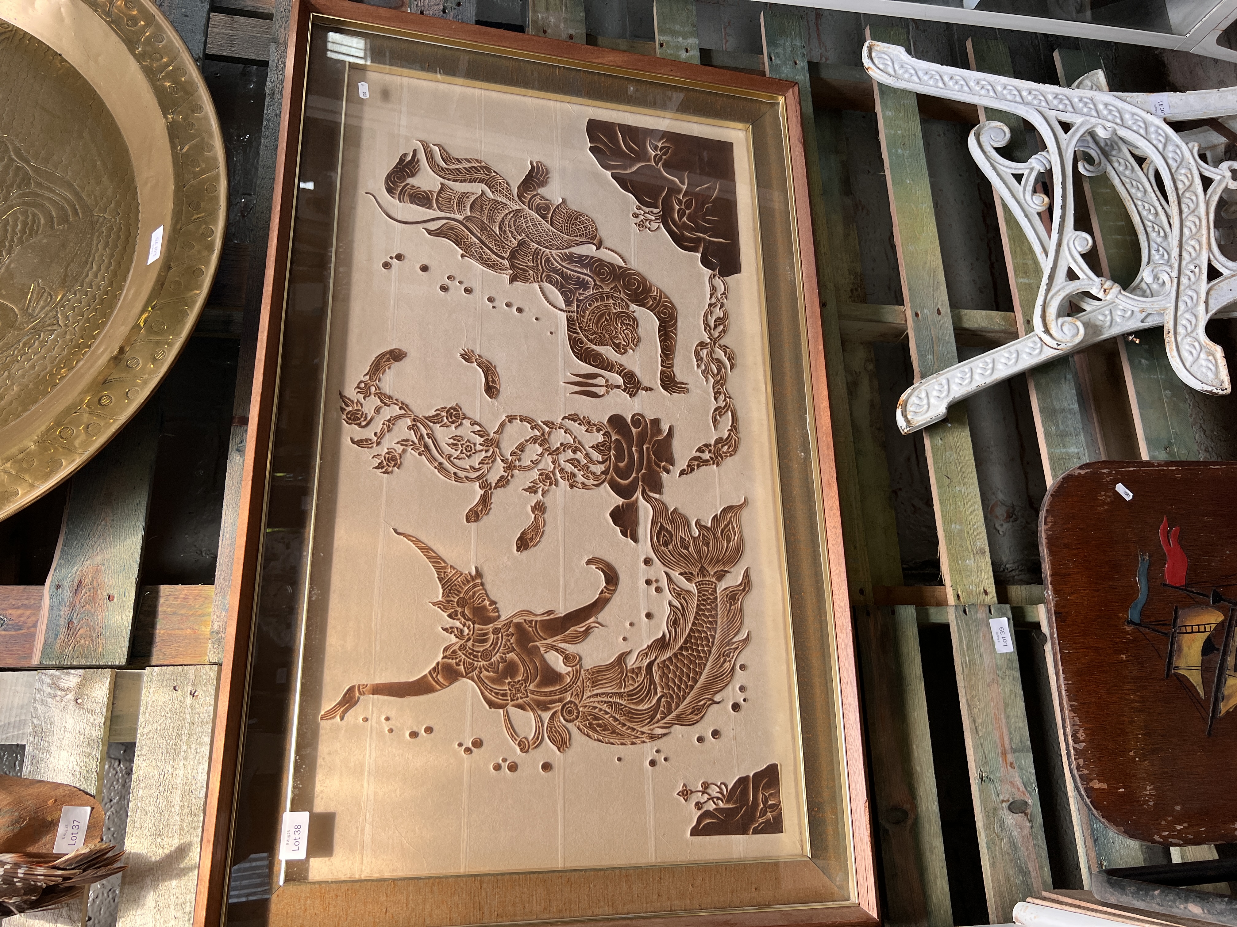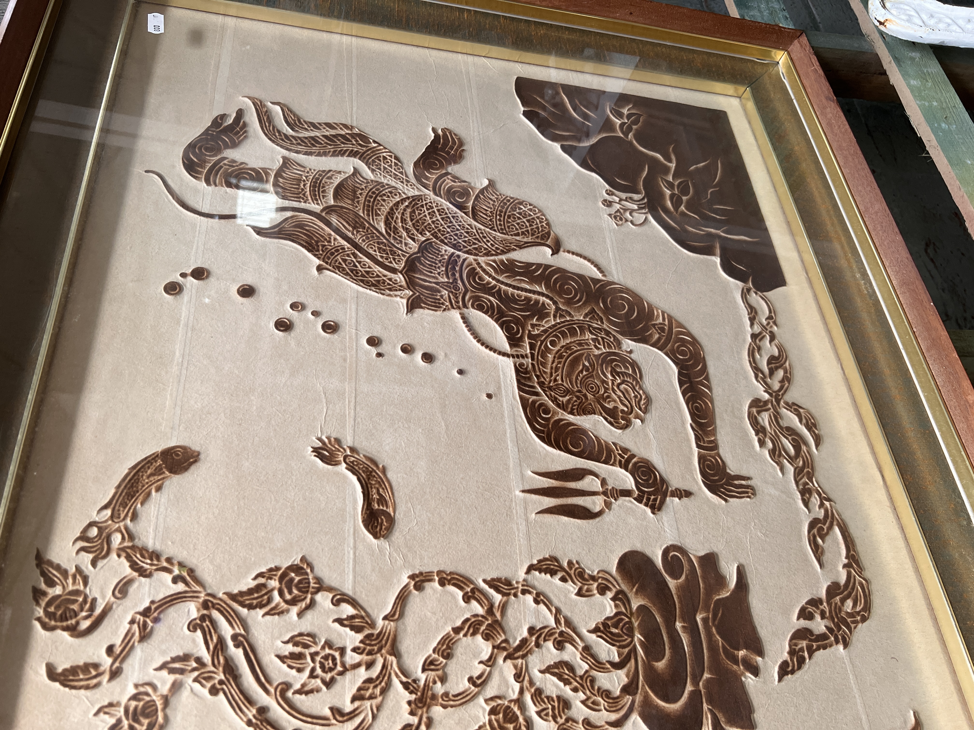 A mid-century Tibetan rubbing artwork of mythical sea creatures. 117cm x 75cm
