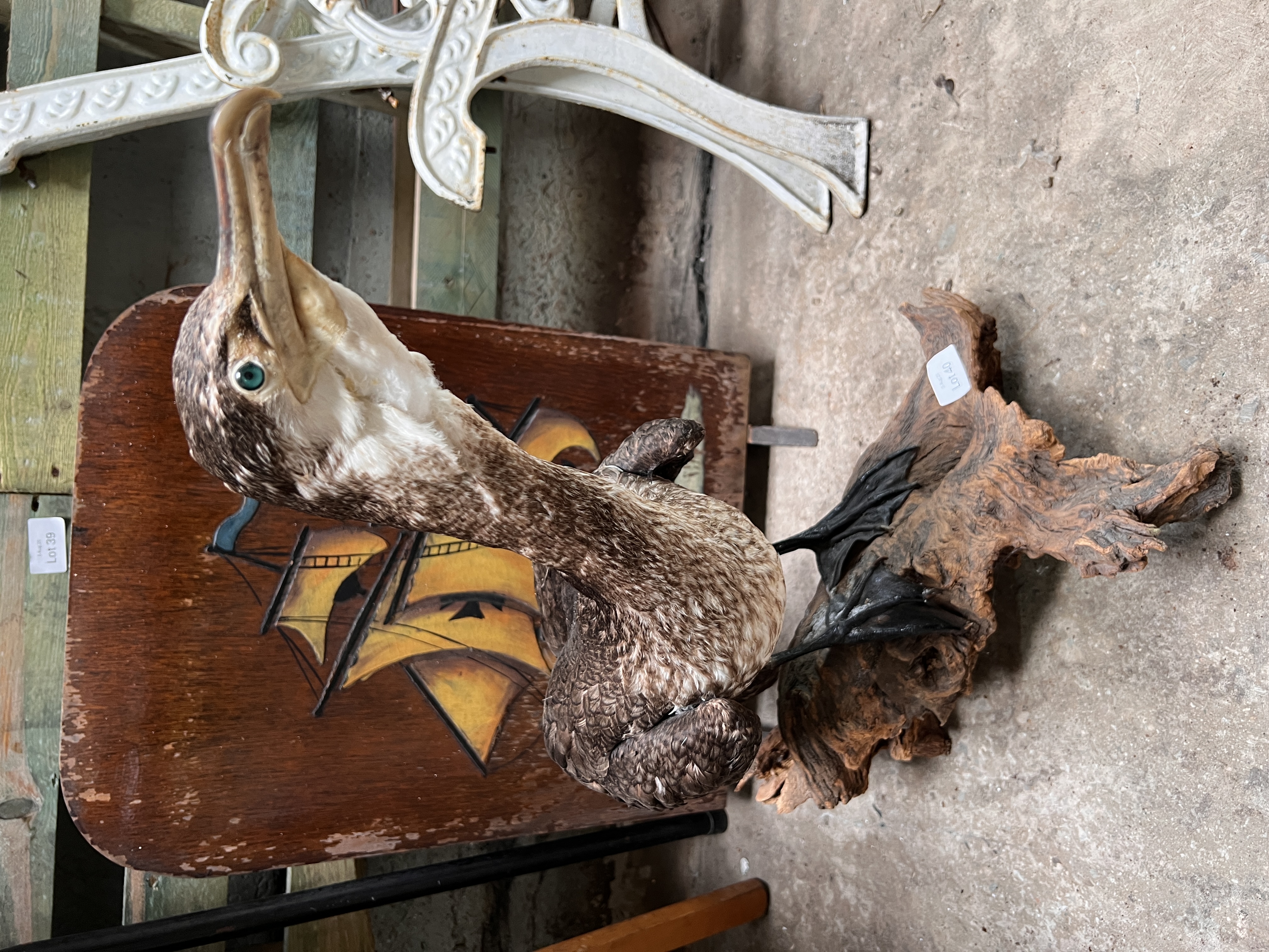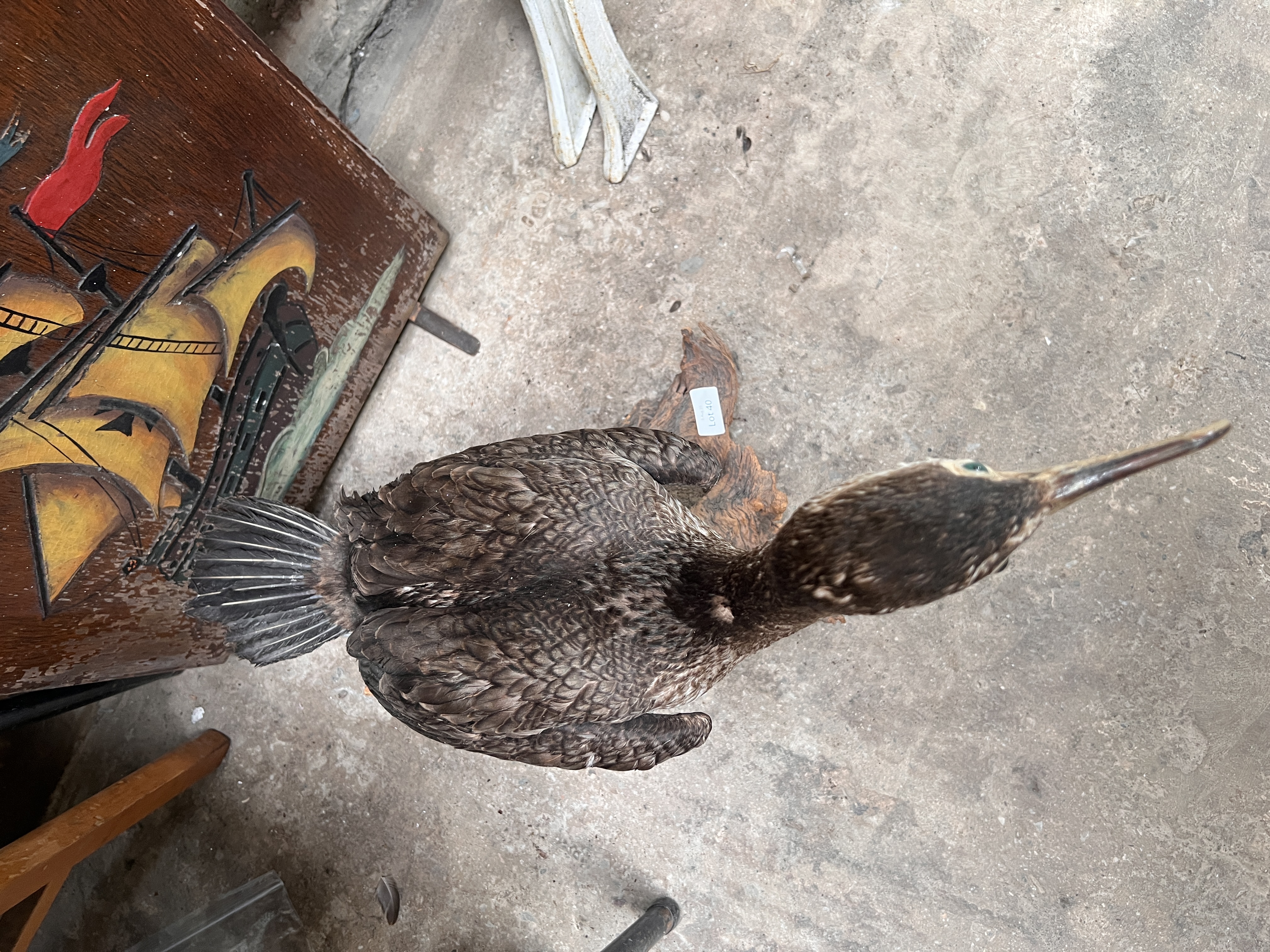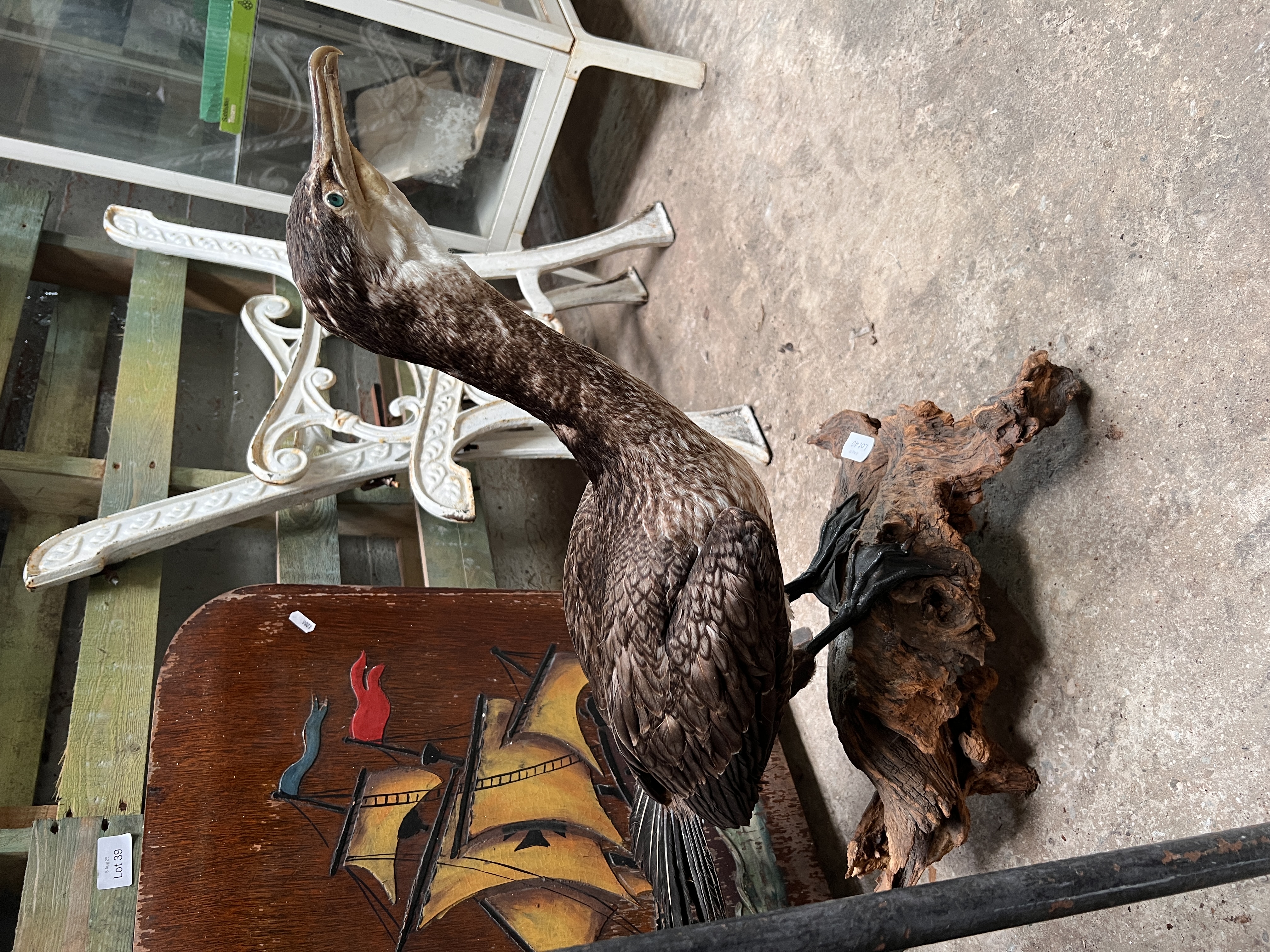 A vintage taxidermy study of a Great Cormorant with green eyes.2ft tall.