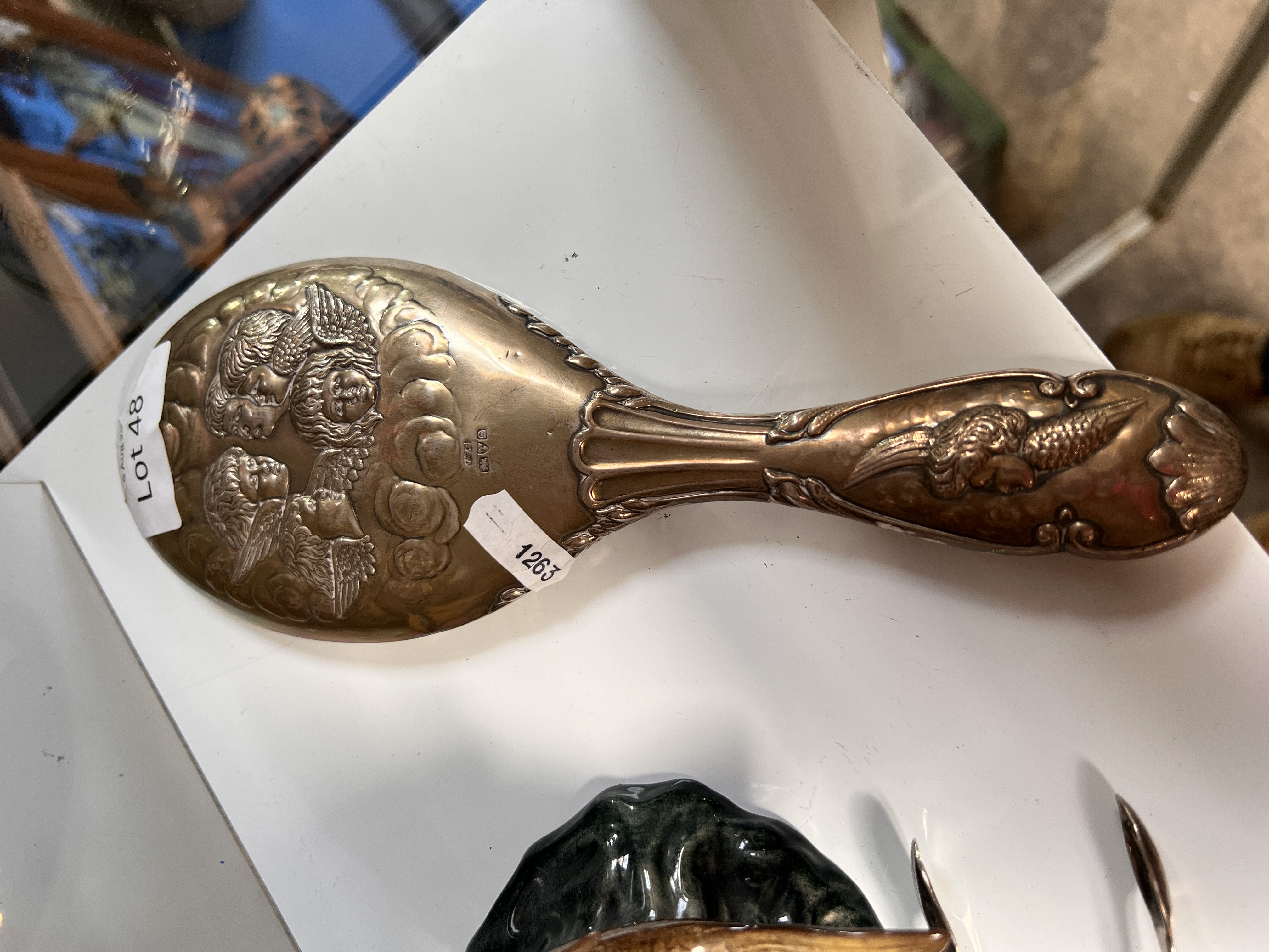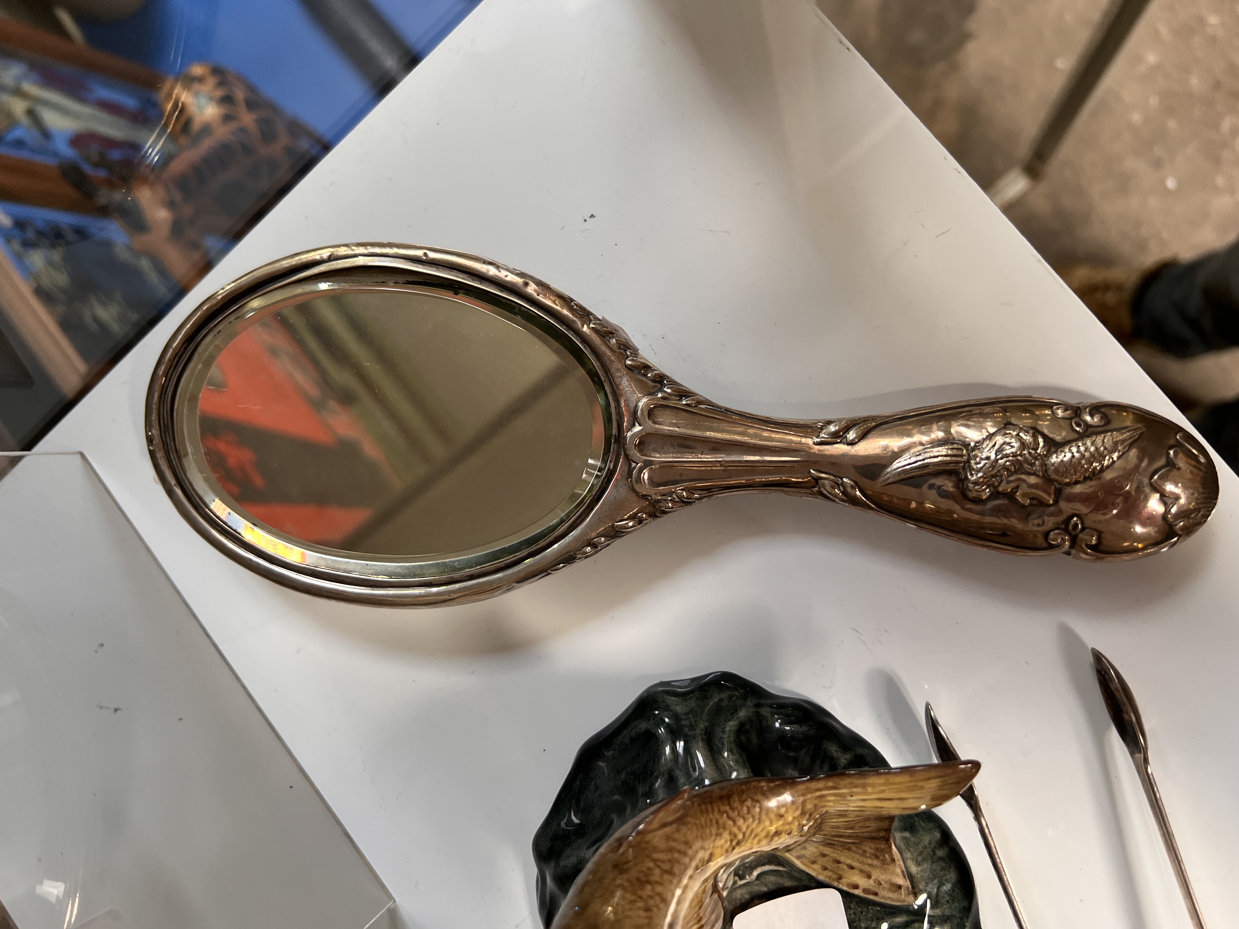An early 20th century HM silver make up mirror, decorated with embossed cherub design.