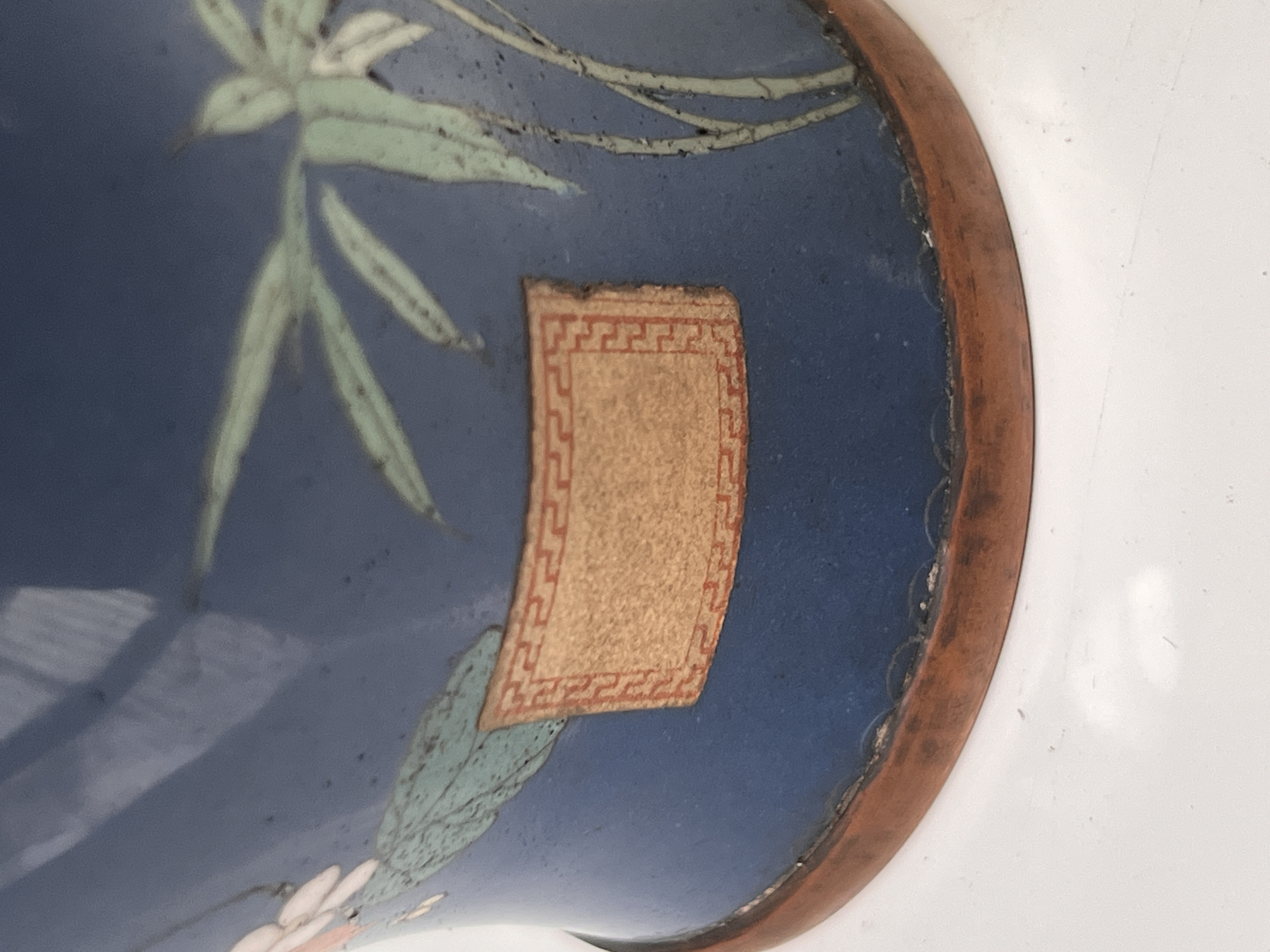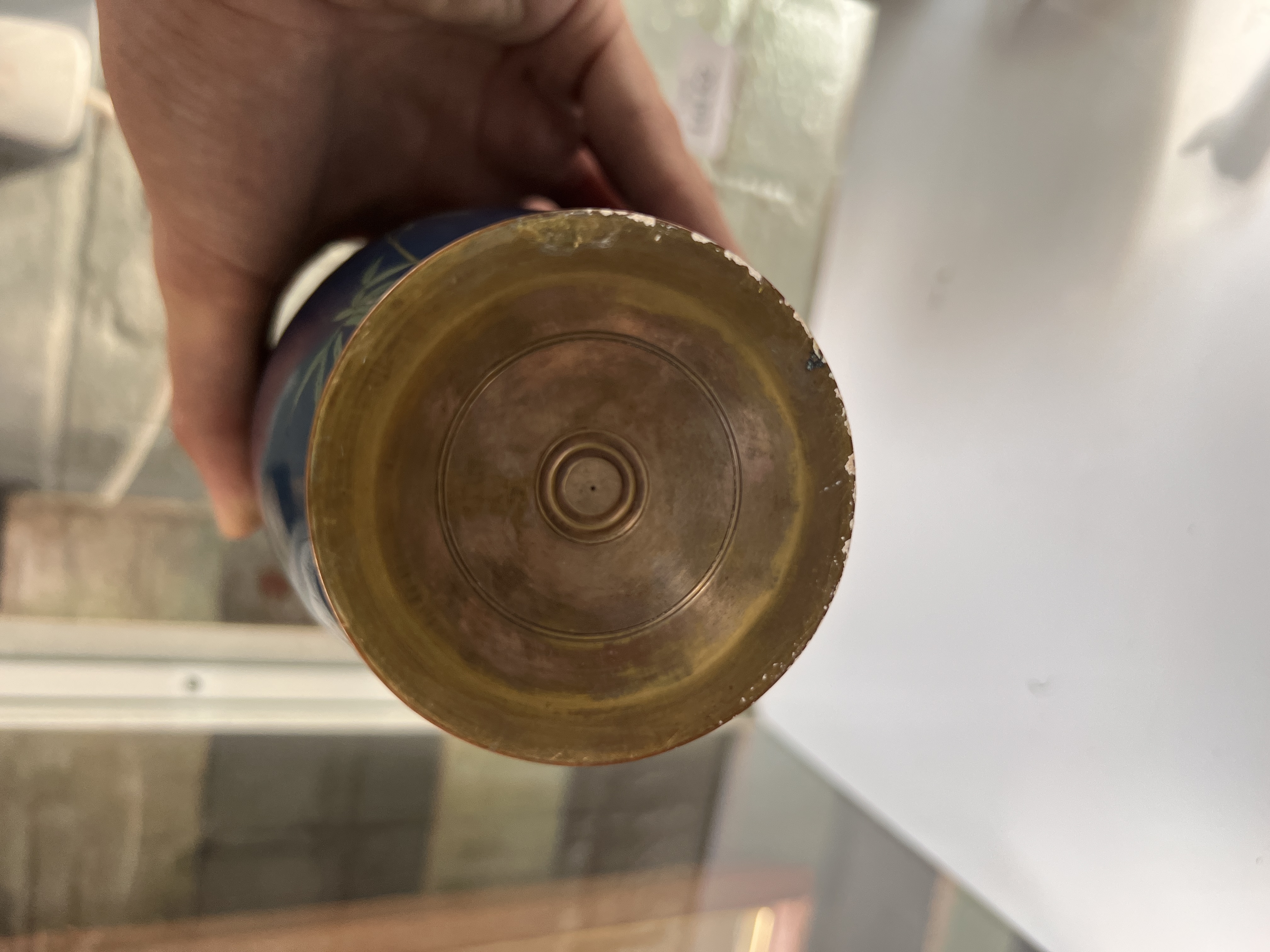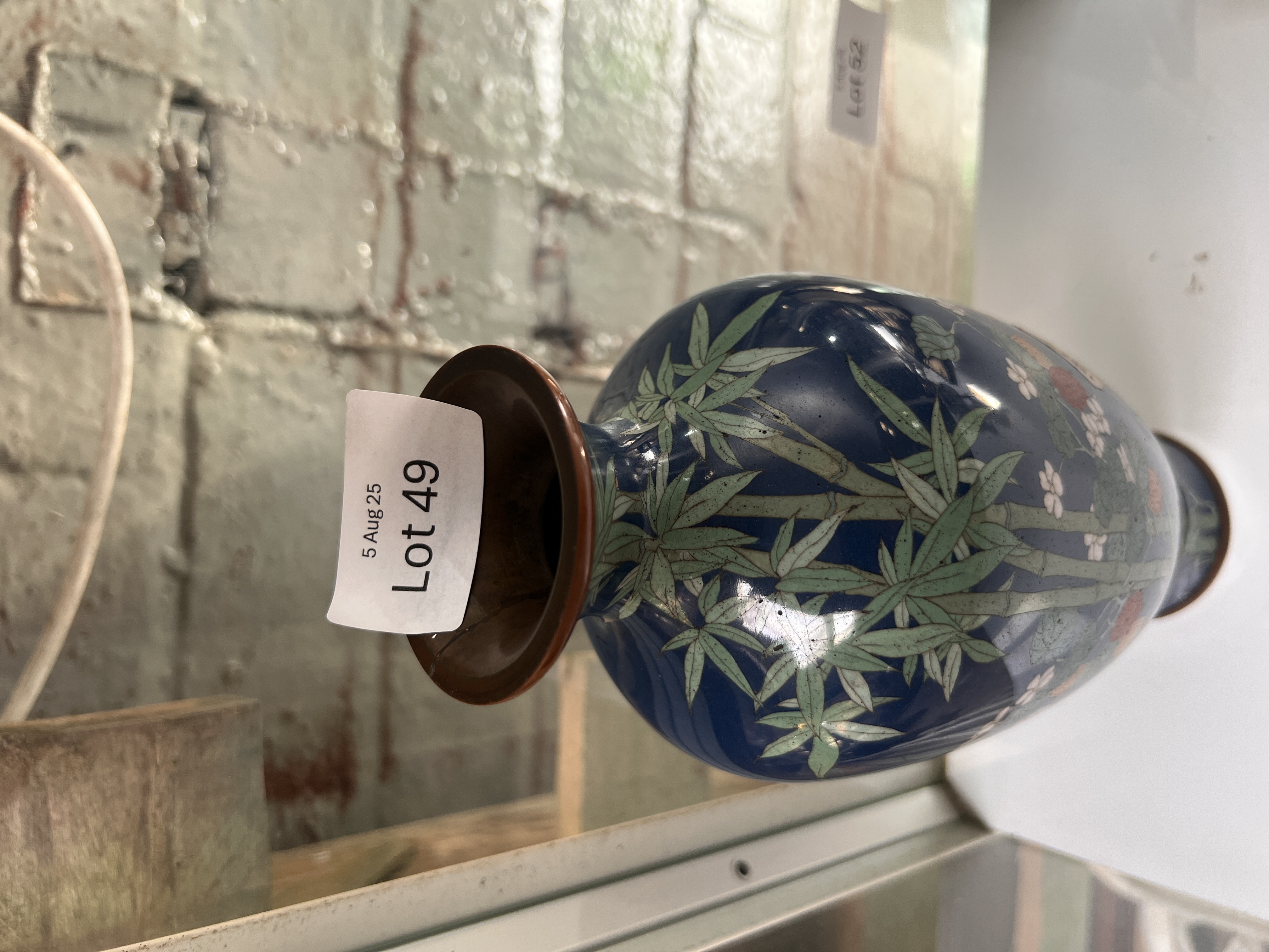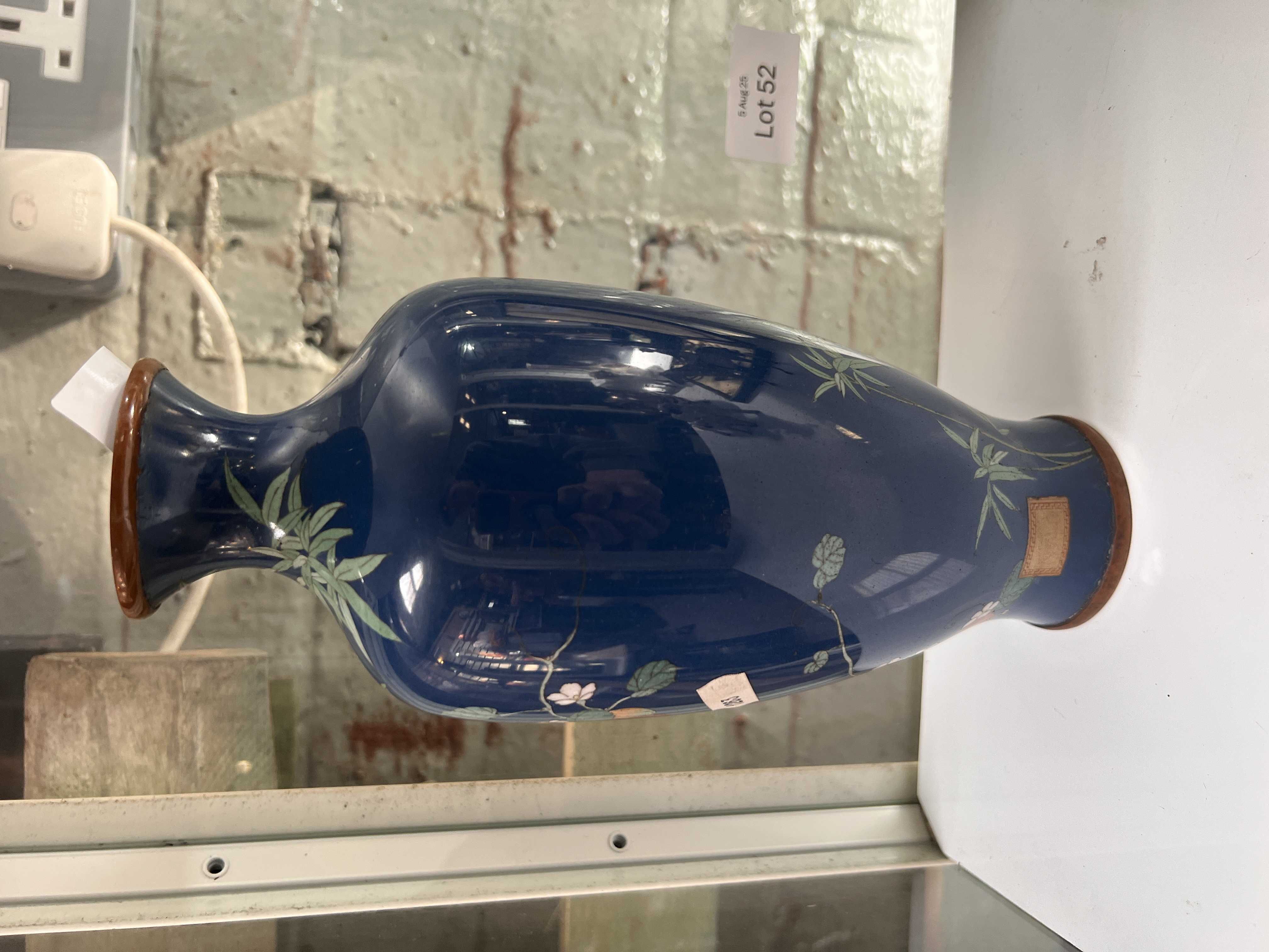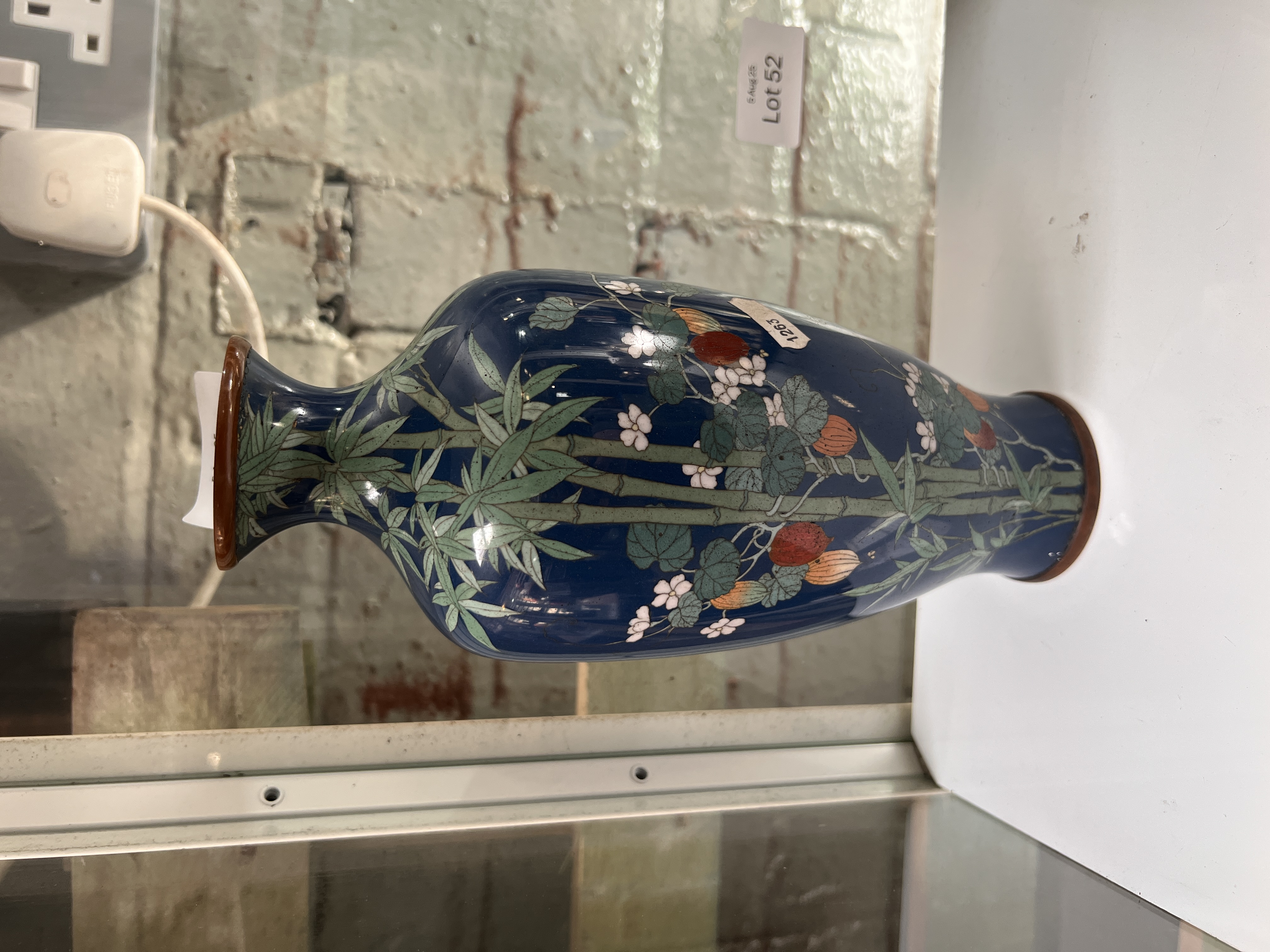 A Japanese cloisonne vase decorated with bamboo and lotus. 25cm tall. No damage.