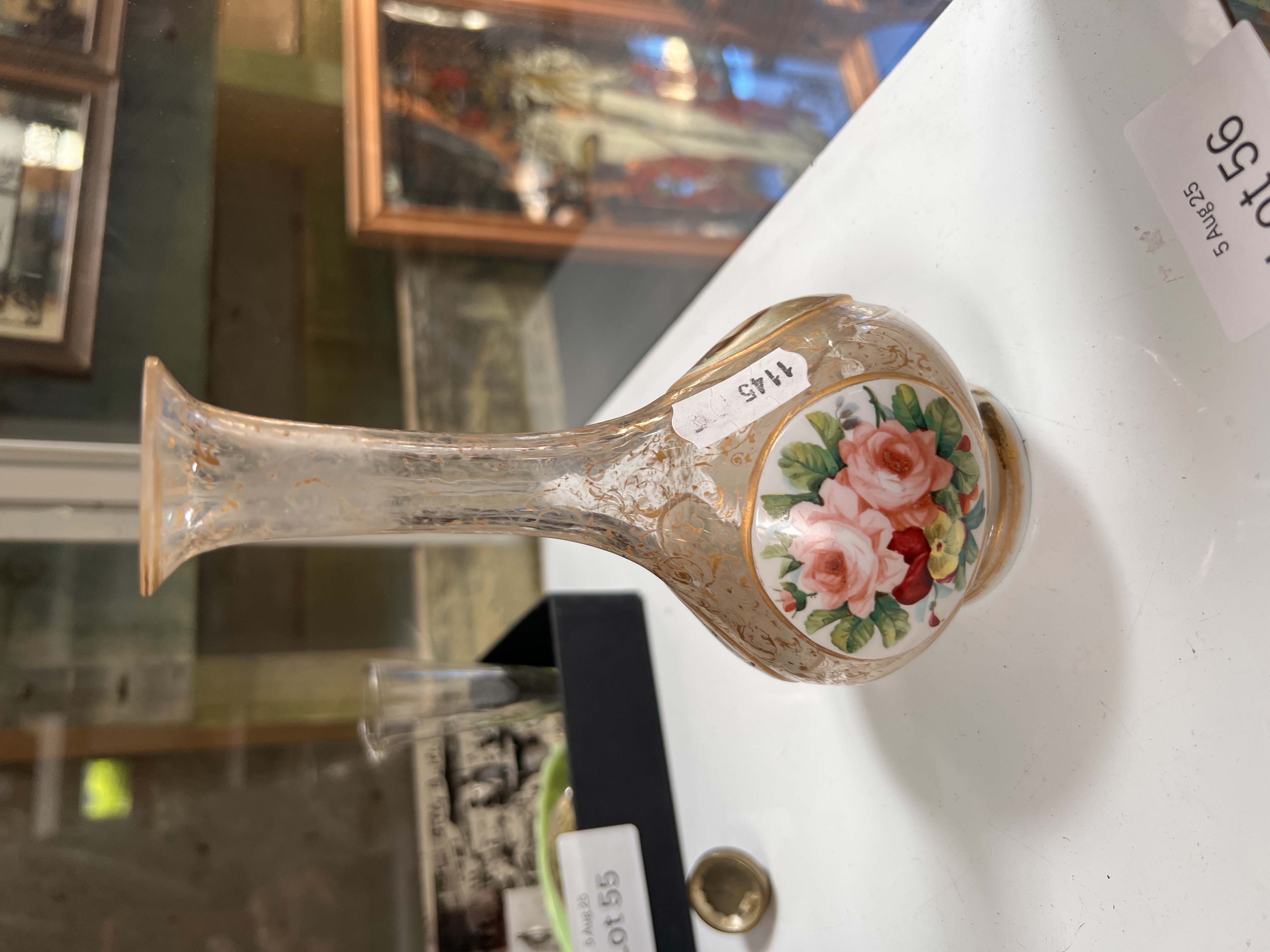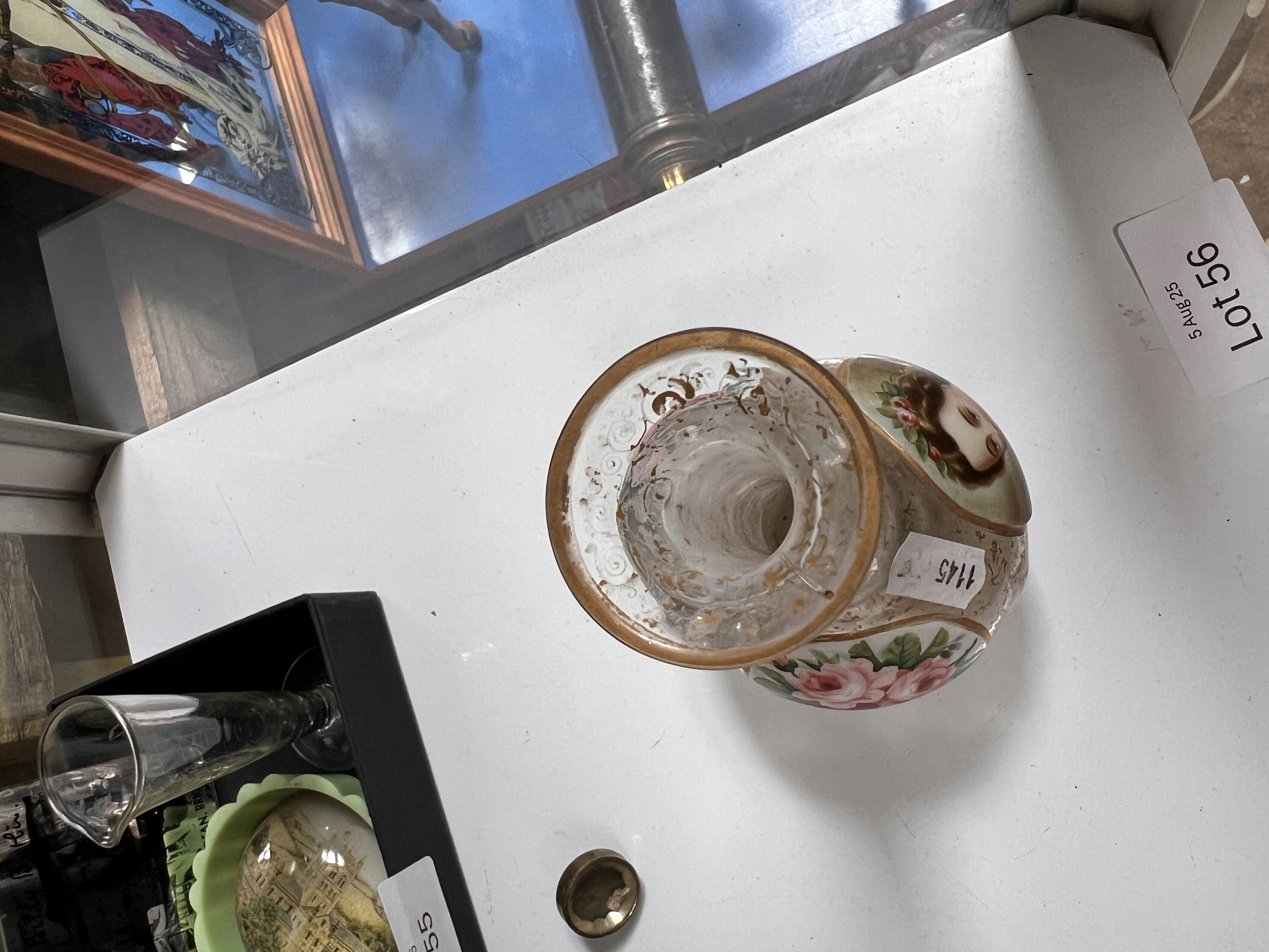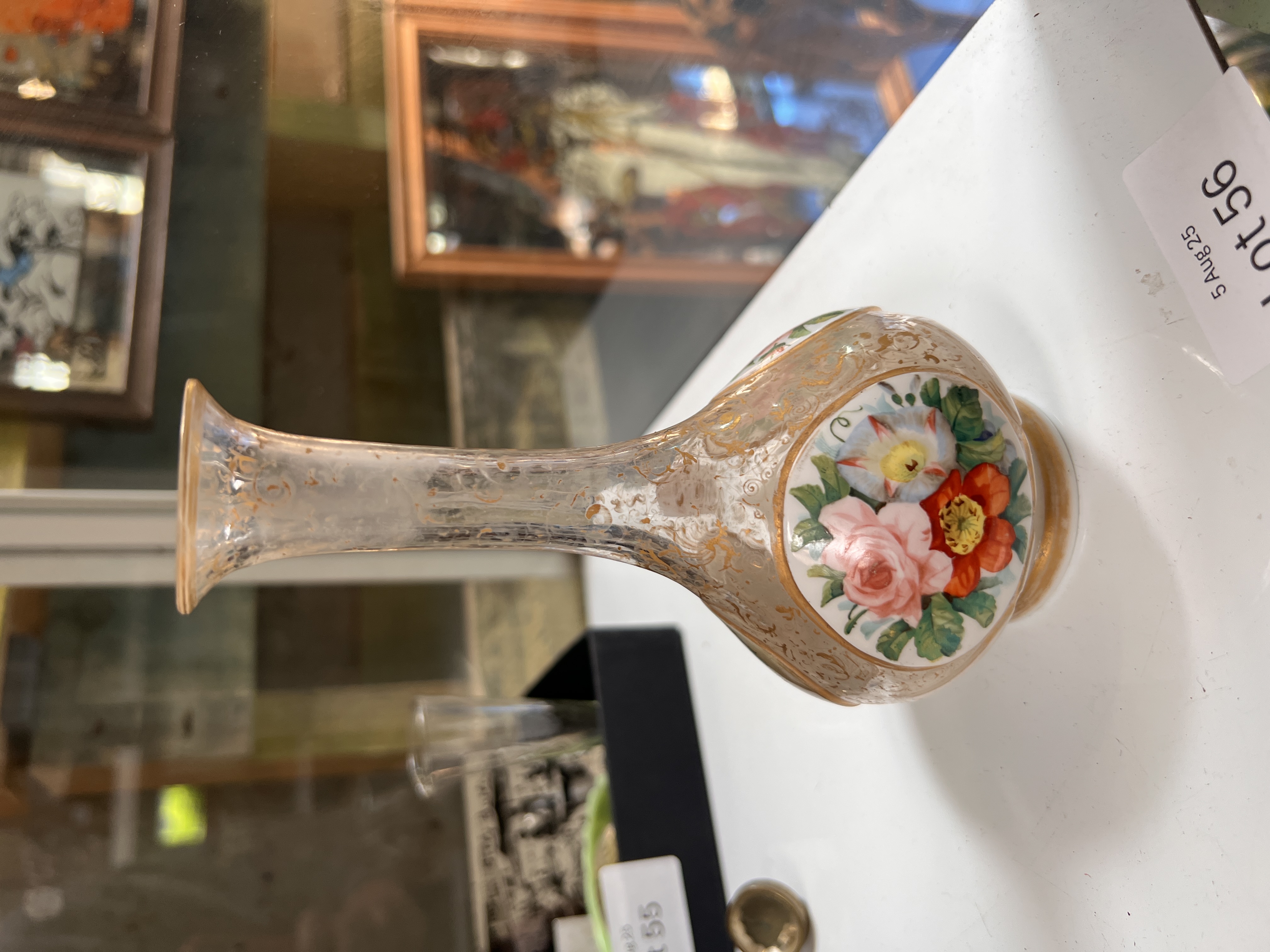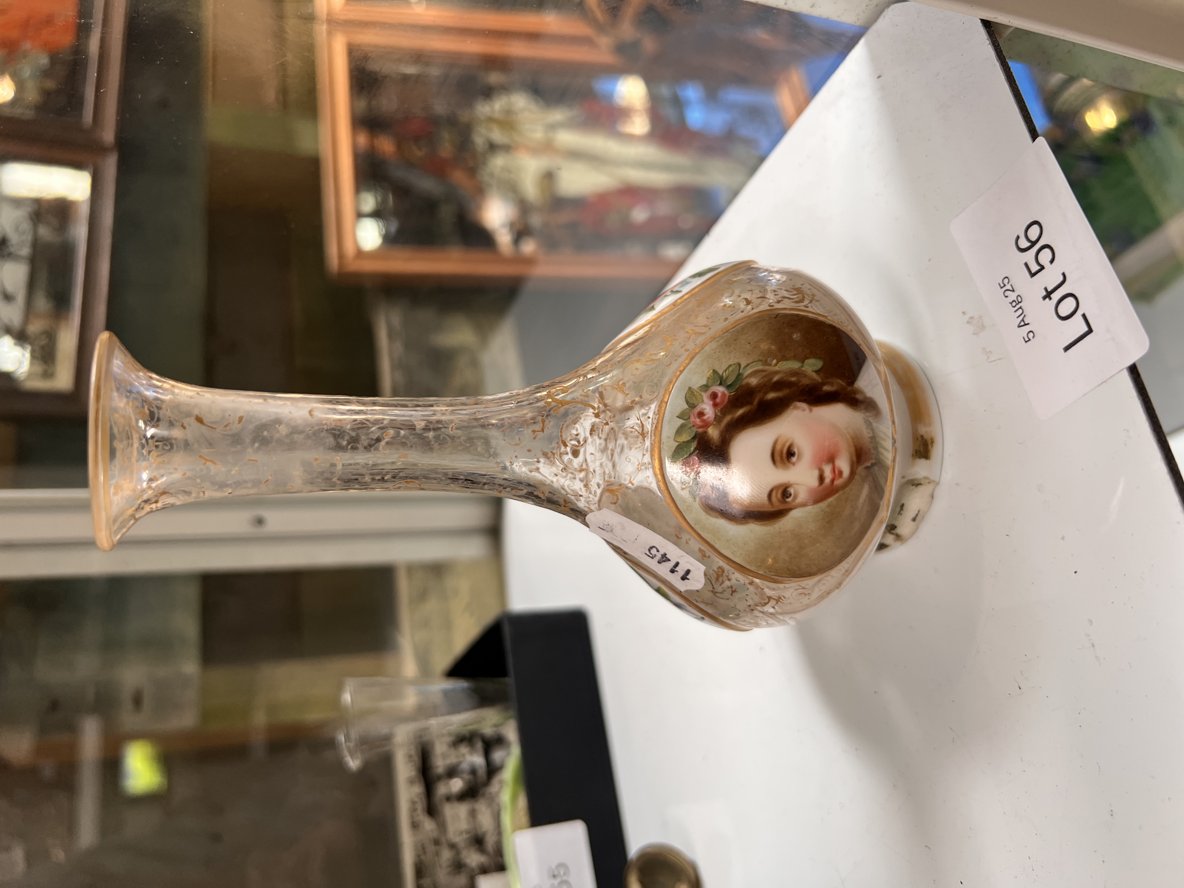 A Georgian glass bottle vase decorated with three enamel medallions two floral and one of a young lady, n a Beilby style. 15cm tall.
