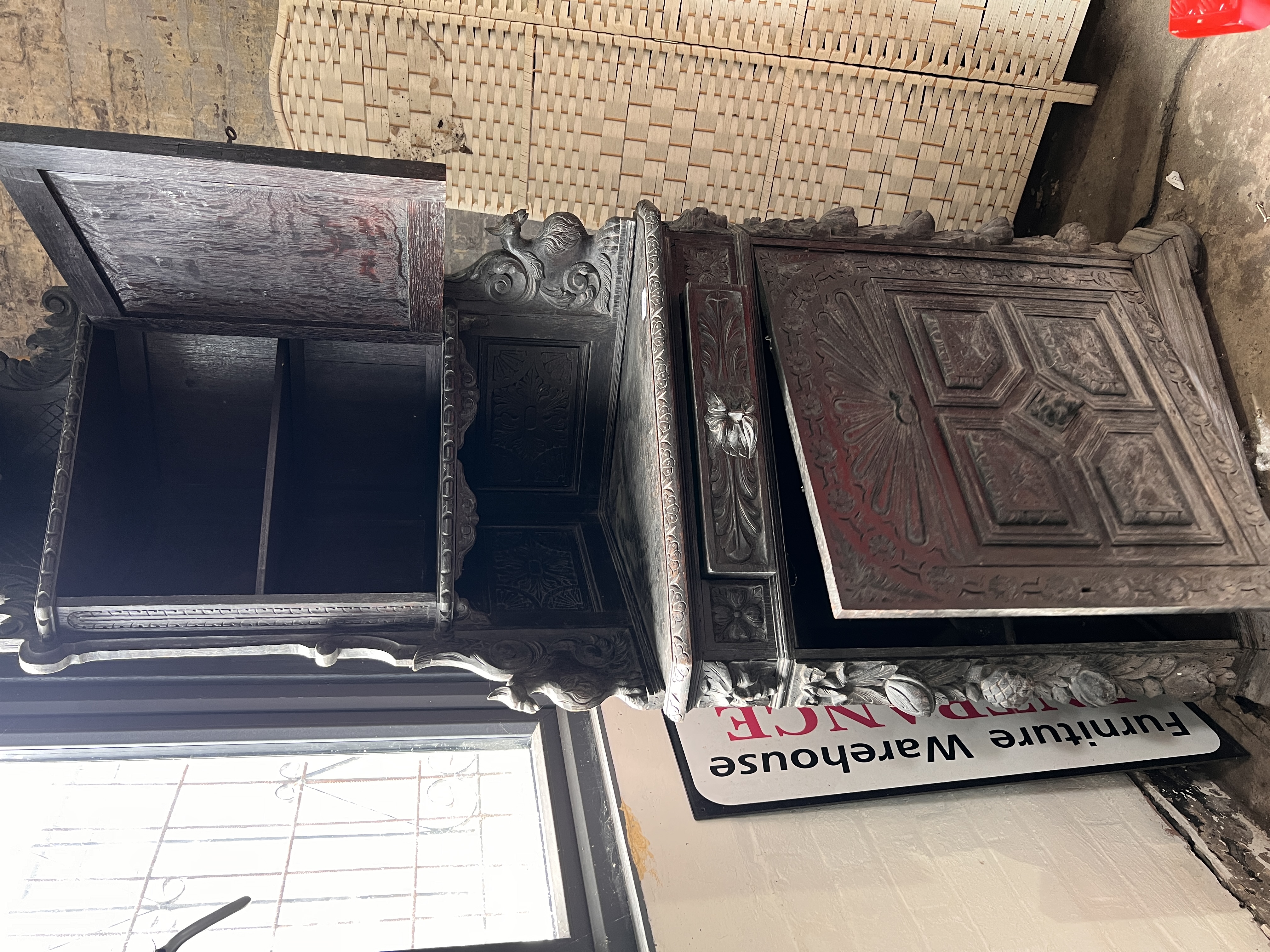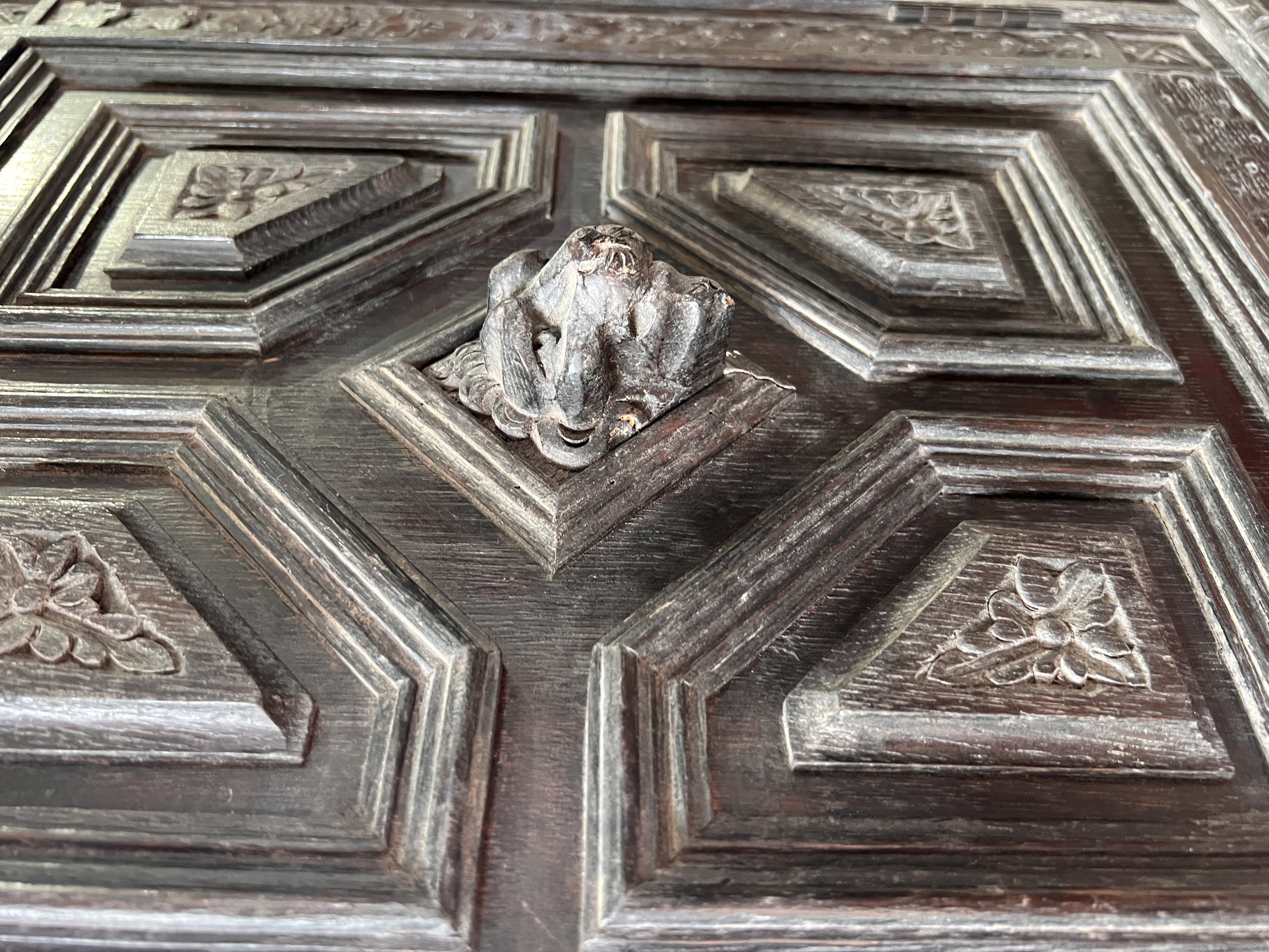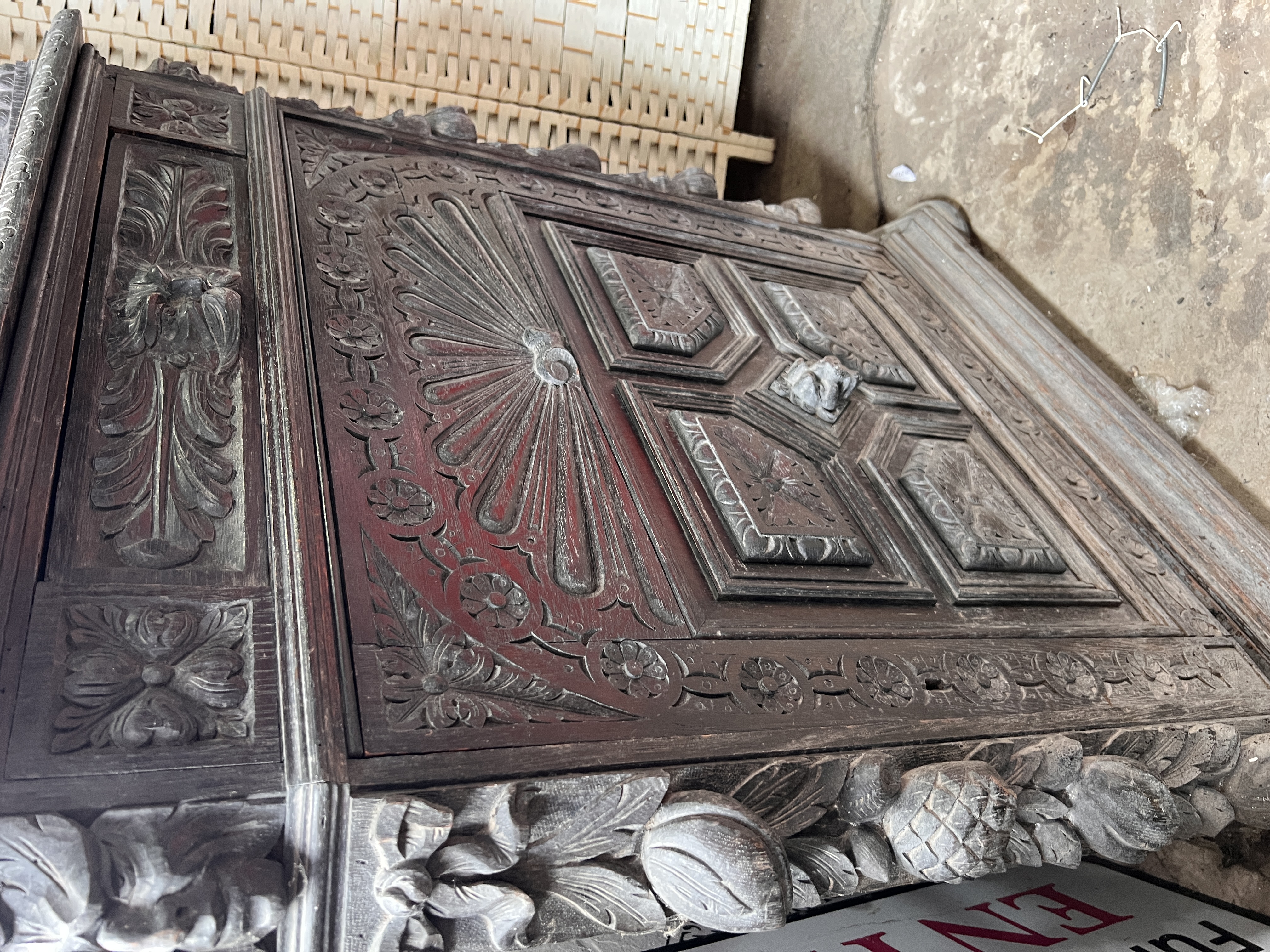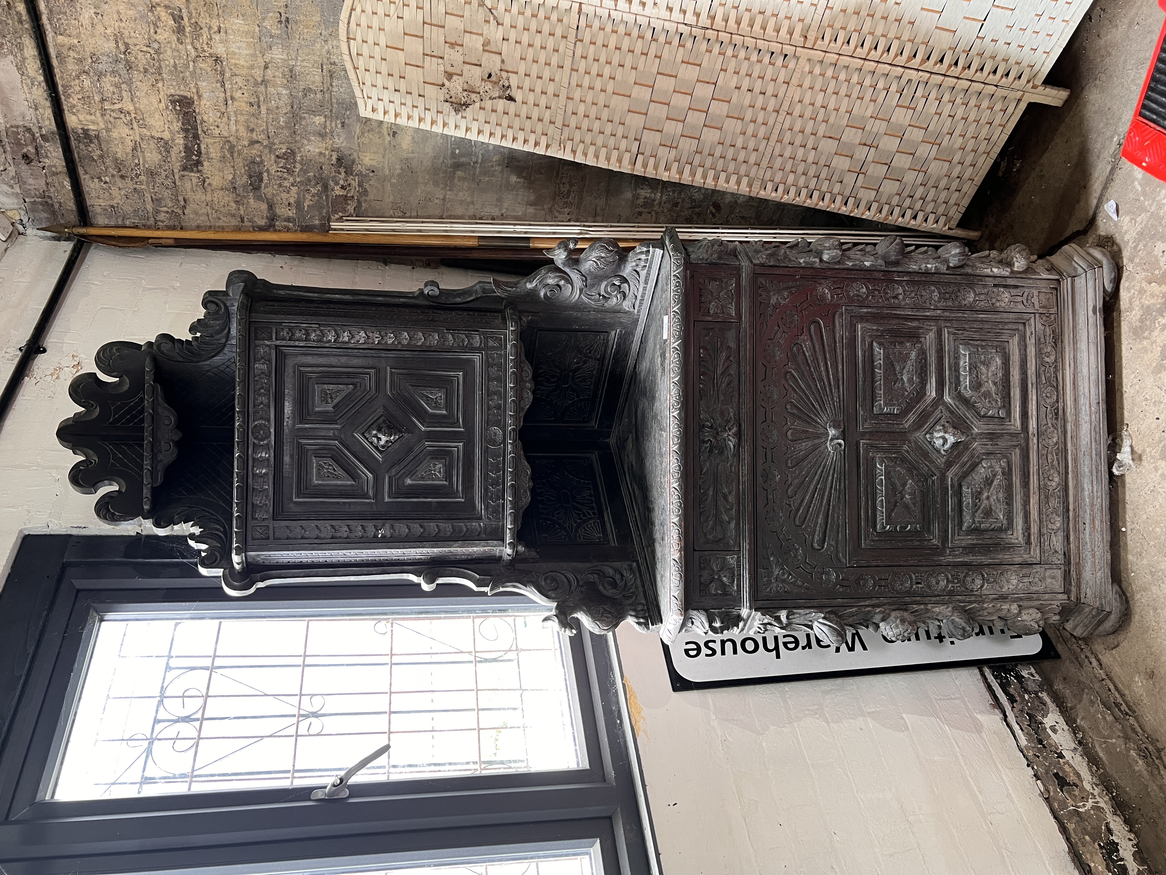 A Victorian gothic heavily carved oak corner cupboard in a Black Forest style.