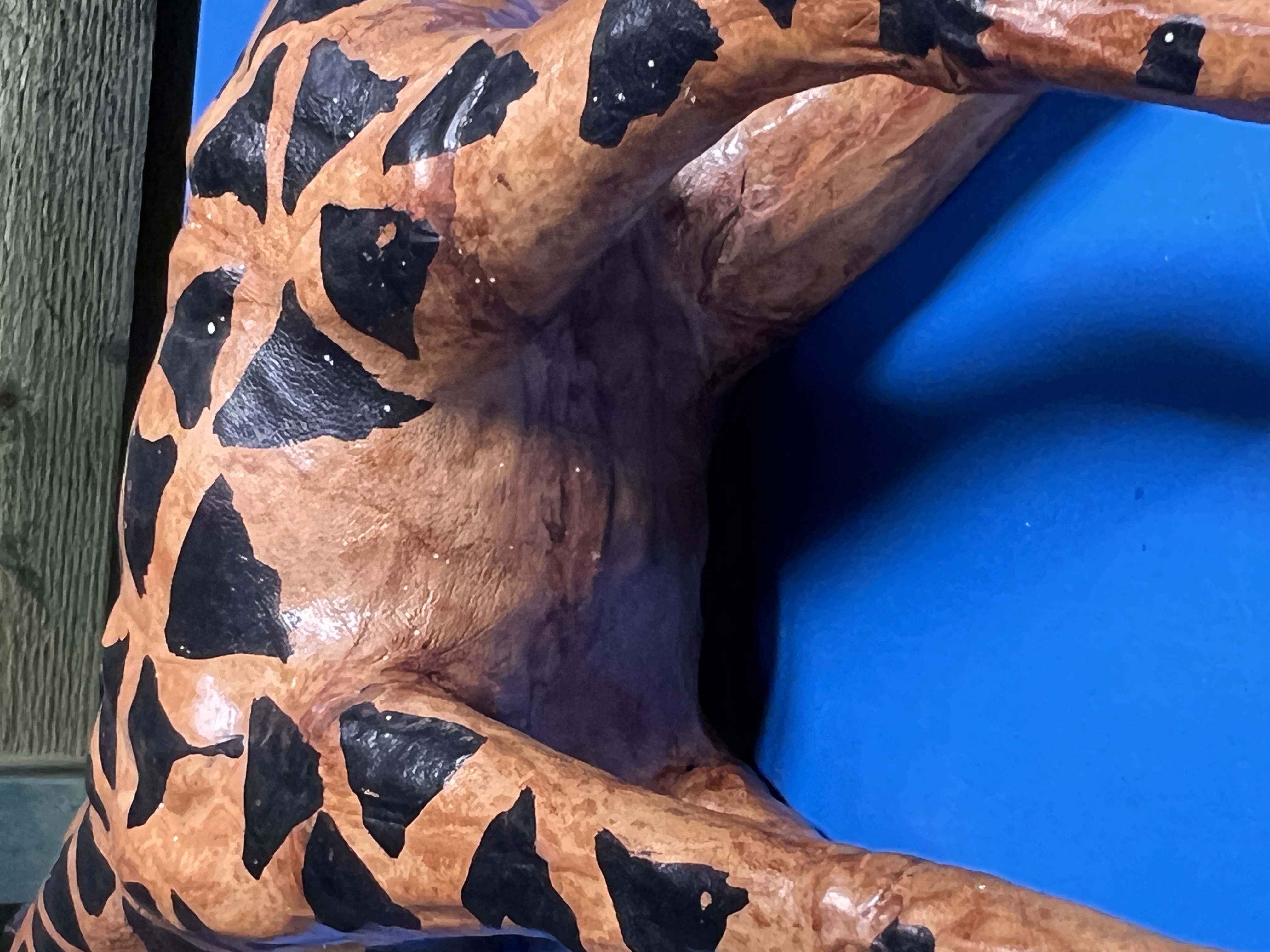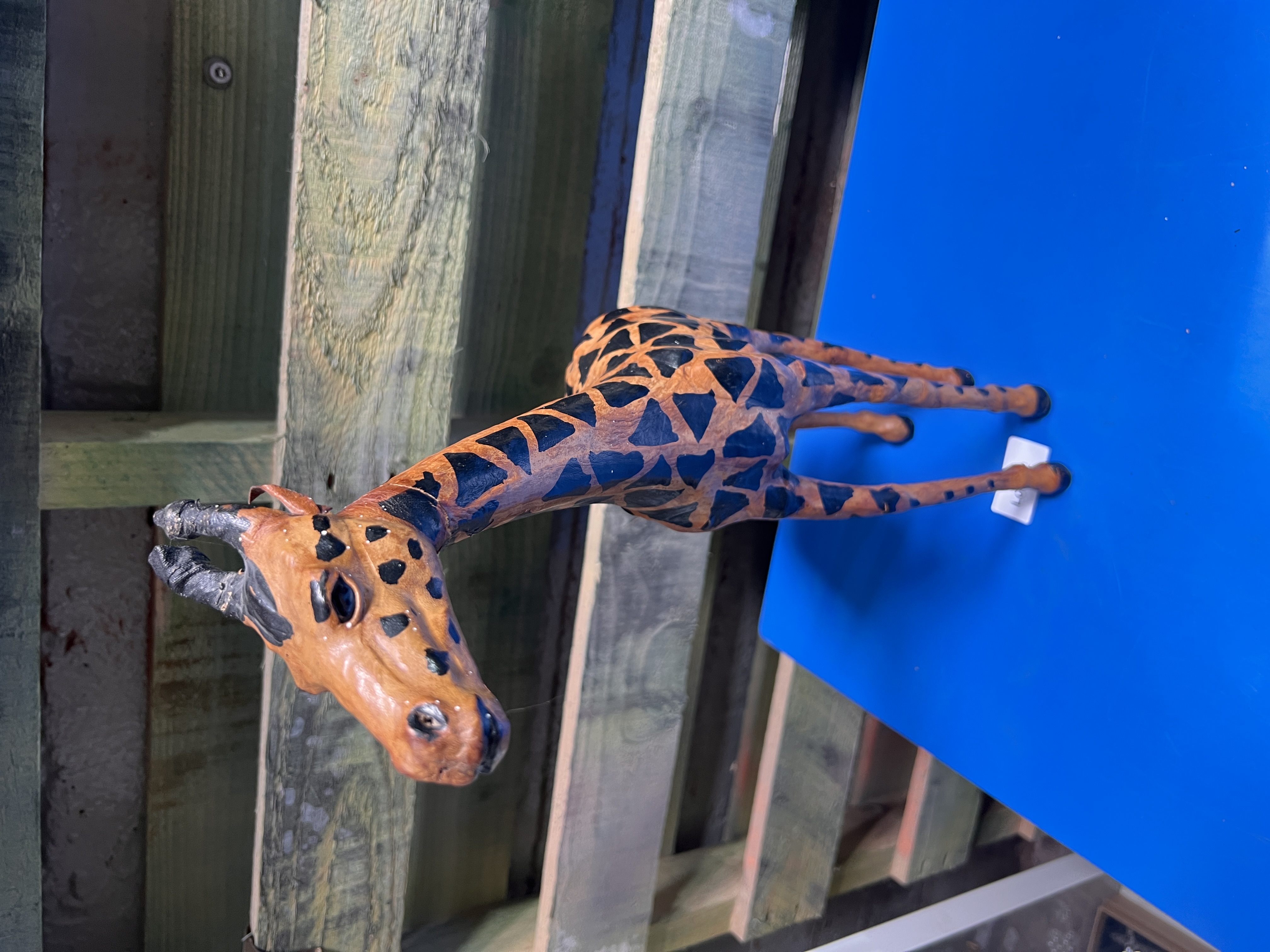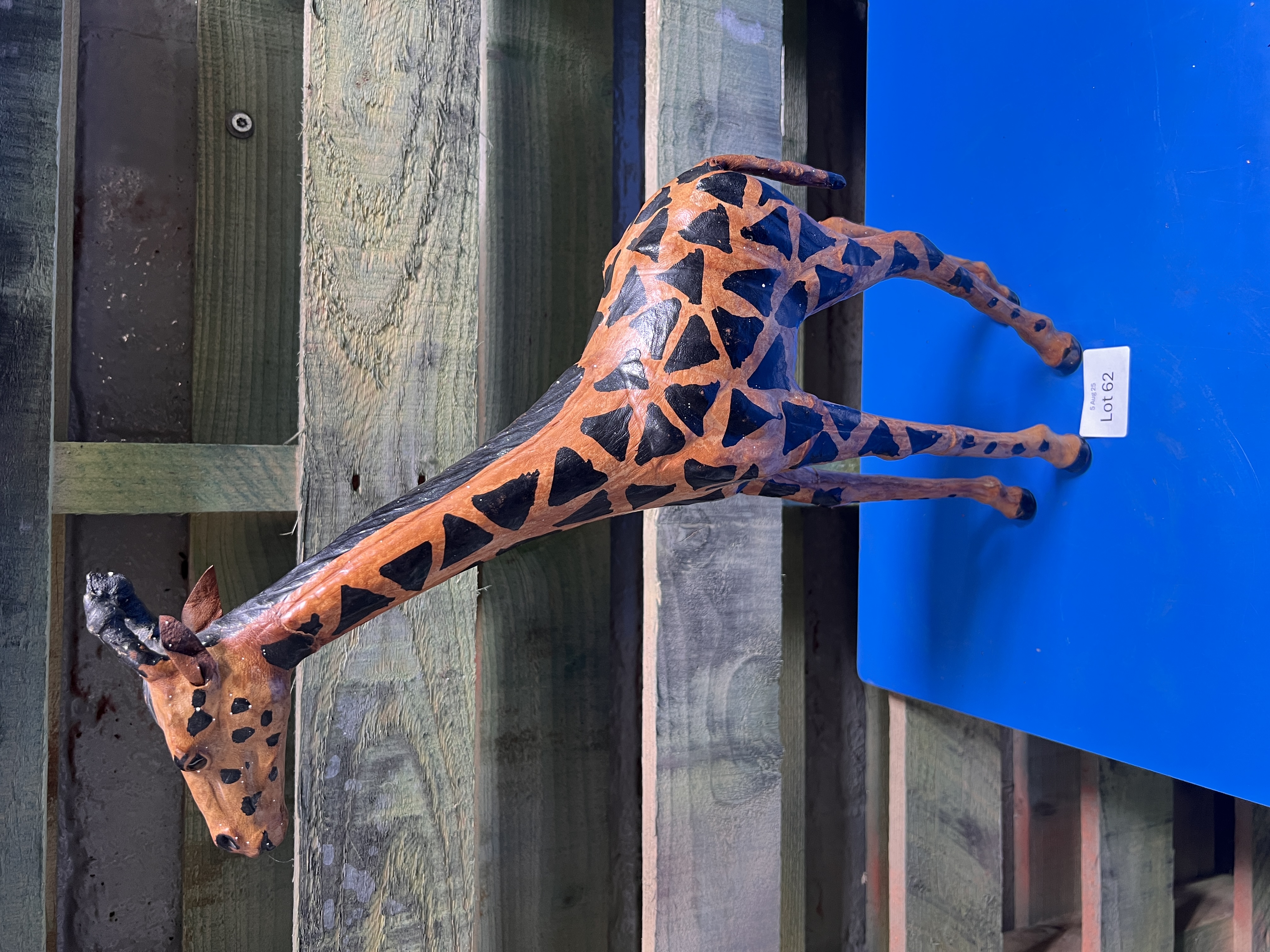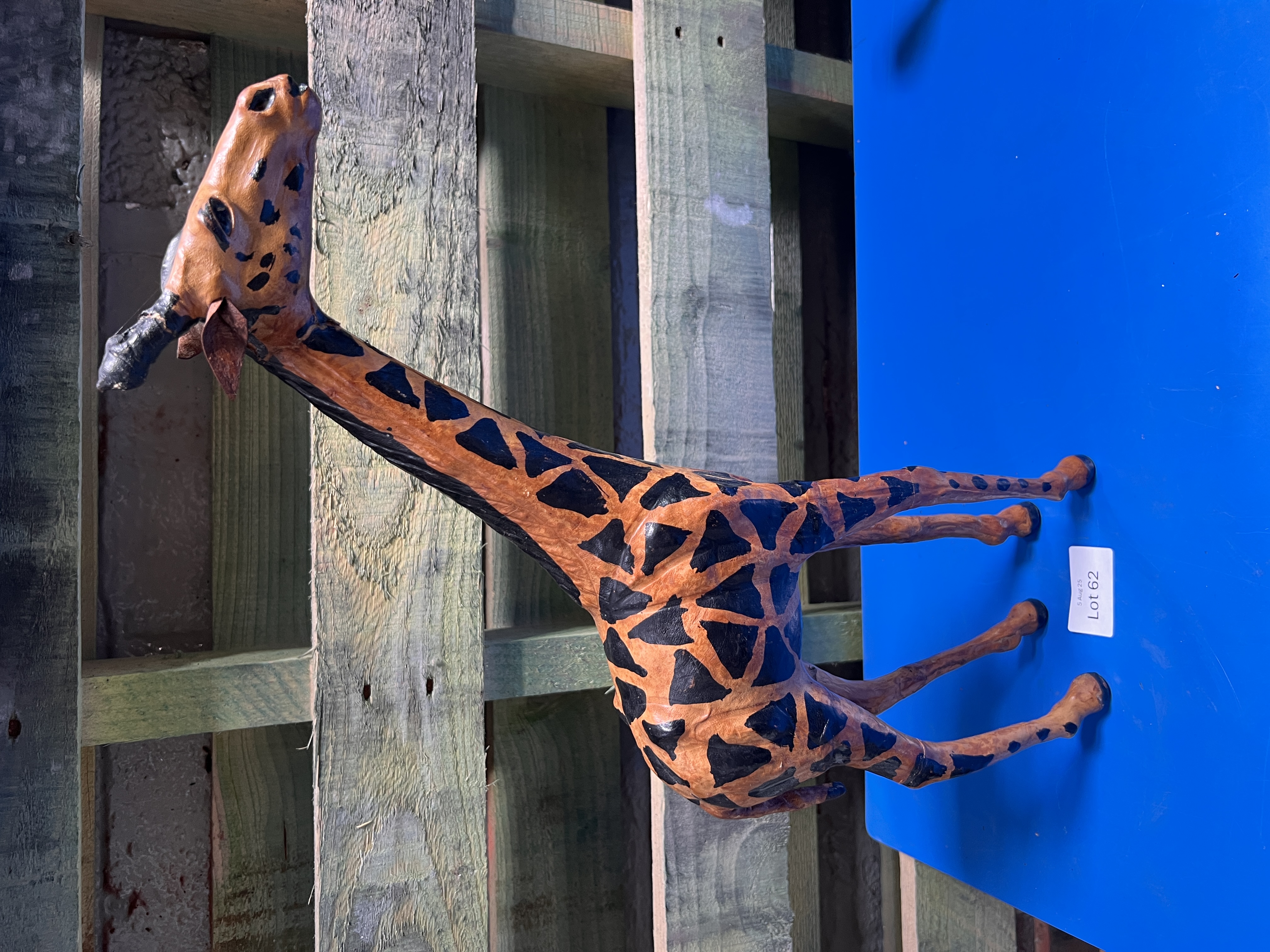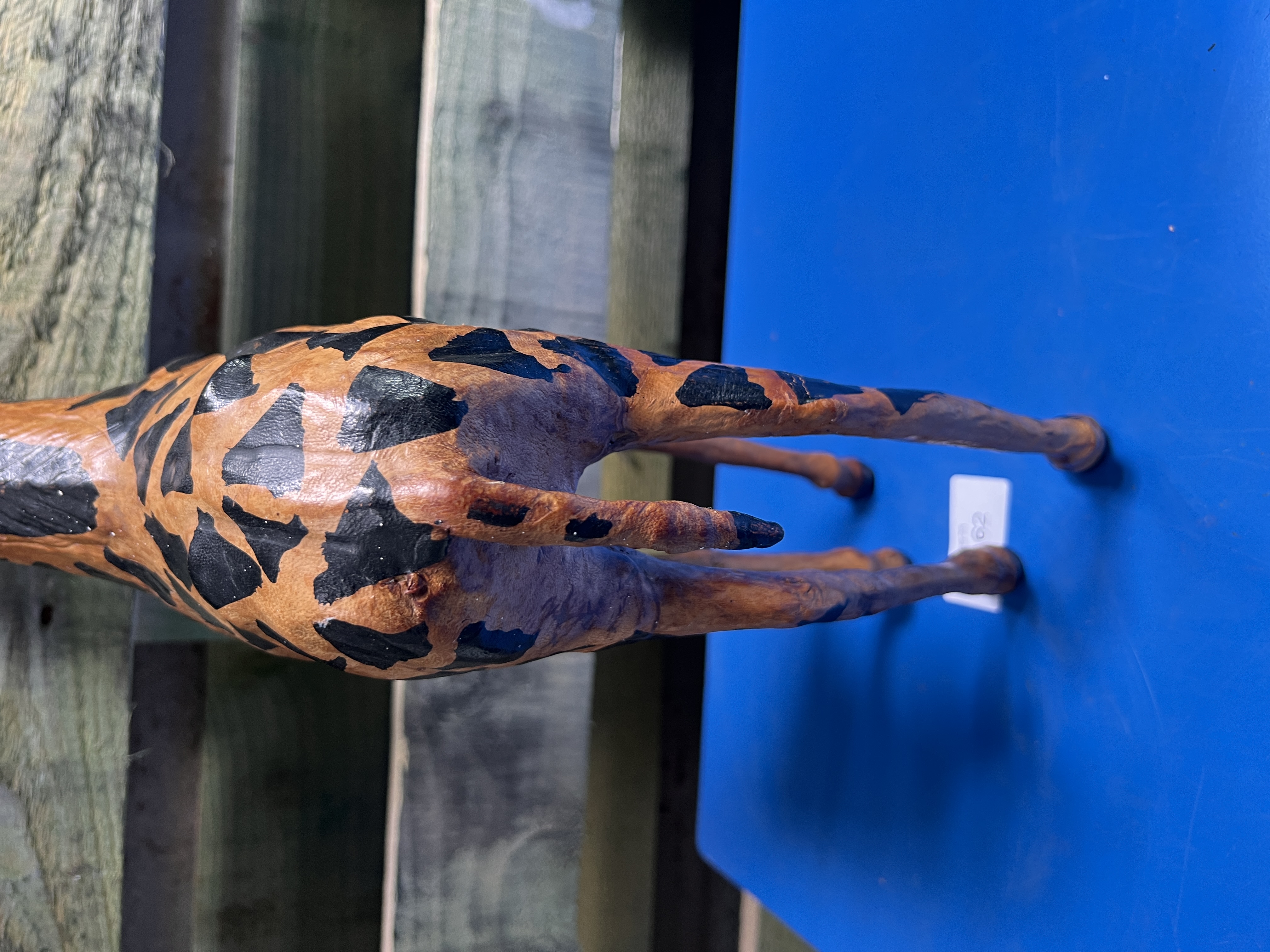 A vintage leather bound hand decorated model giraffe. 46cm tall.