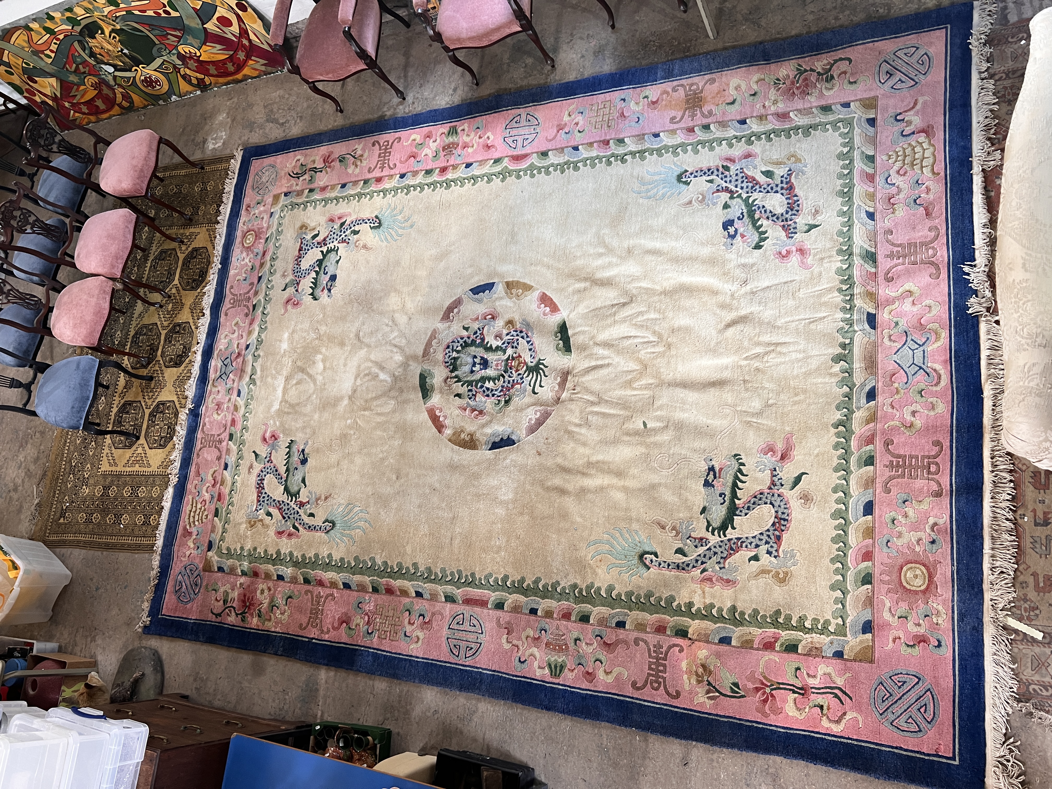 A large Chinese hand woven carpet rug with pink ground and dragon medallion design.
