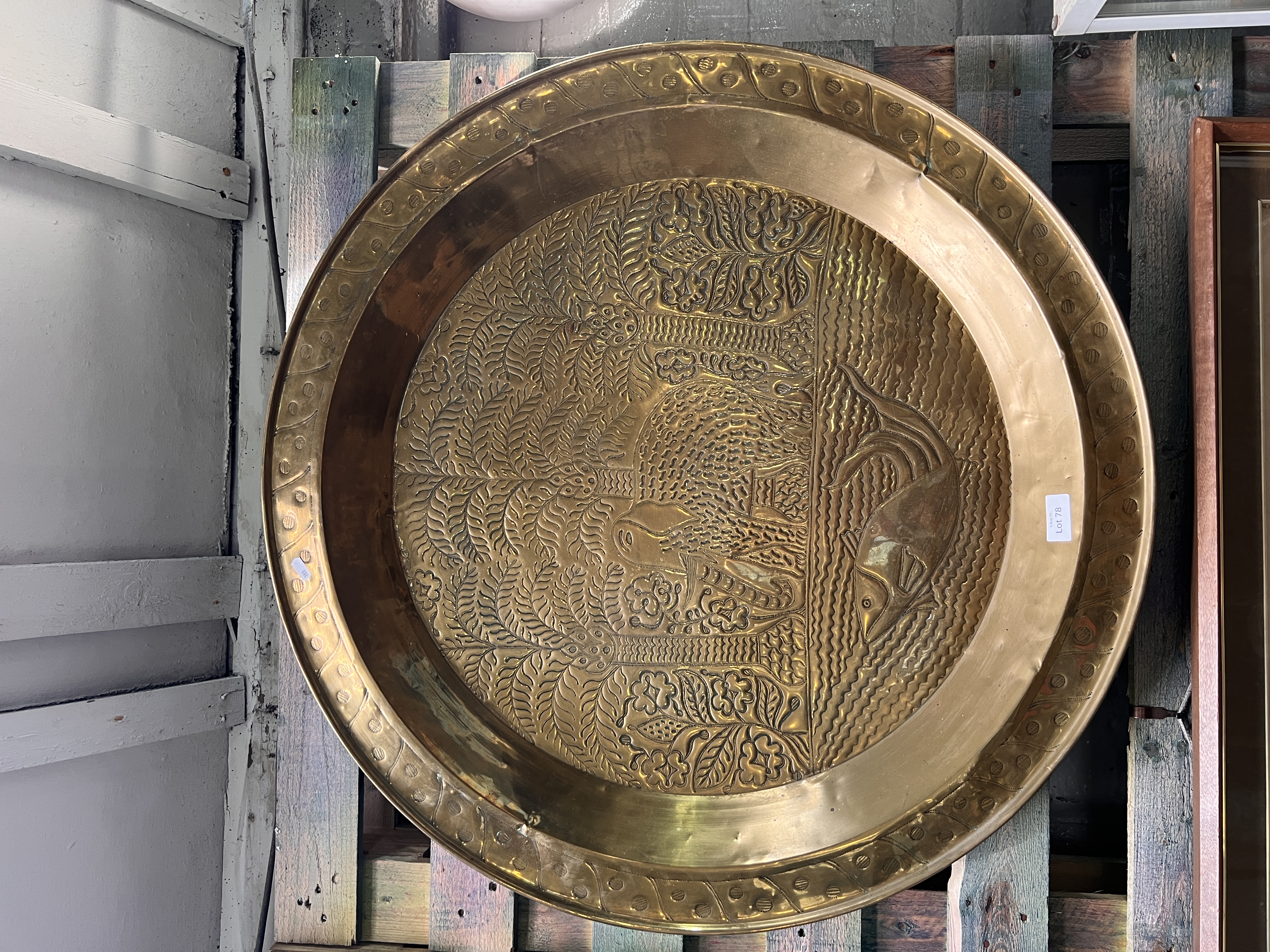 A large hand worked Indian brass tray. 90cm wide