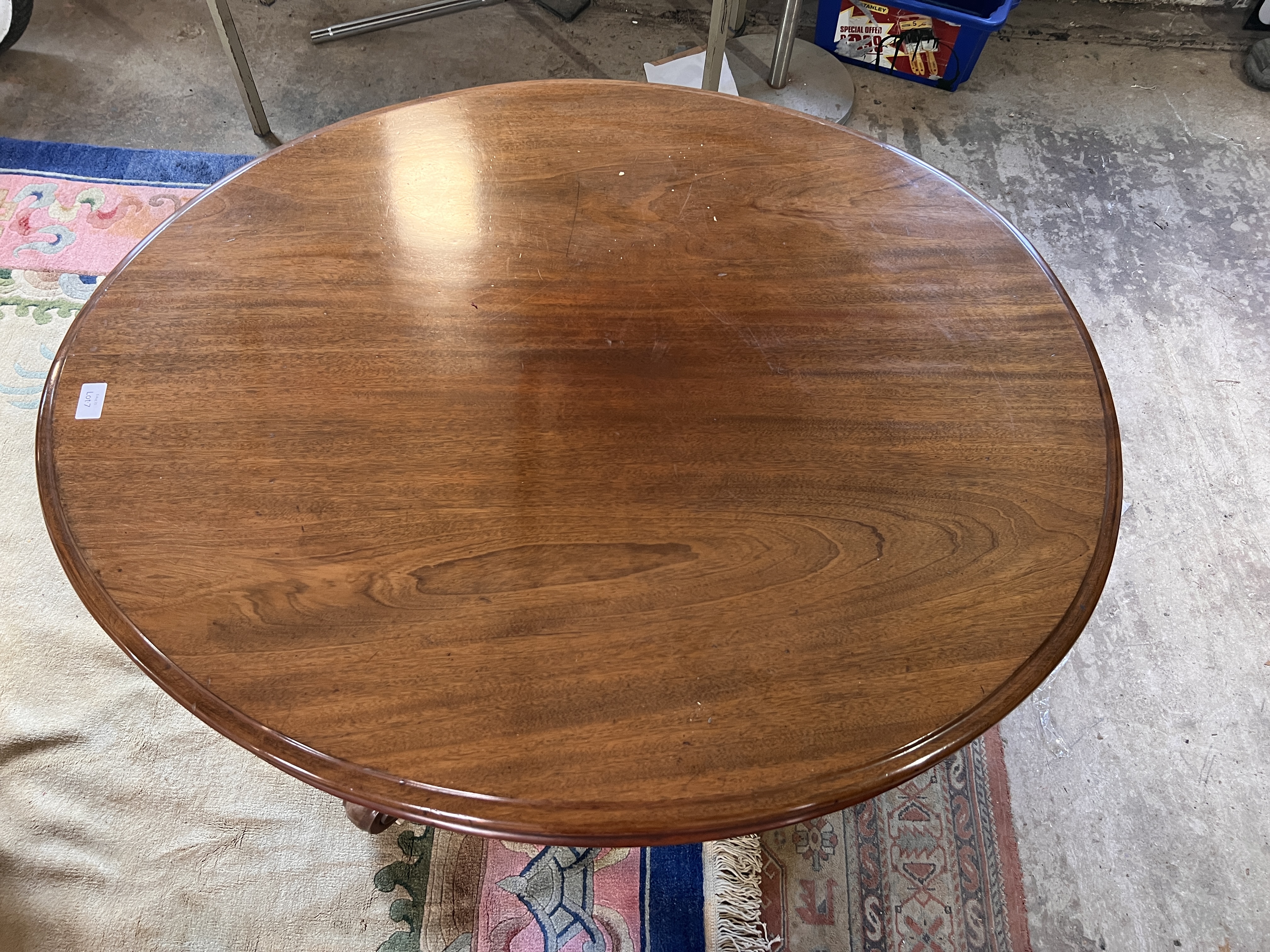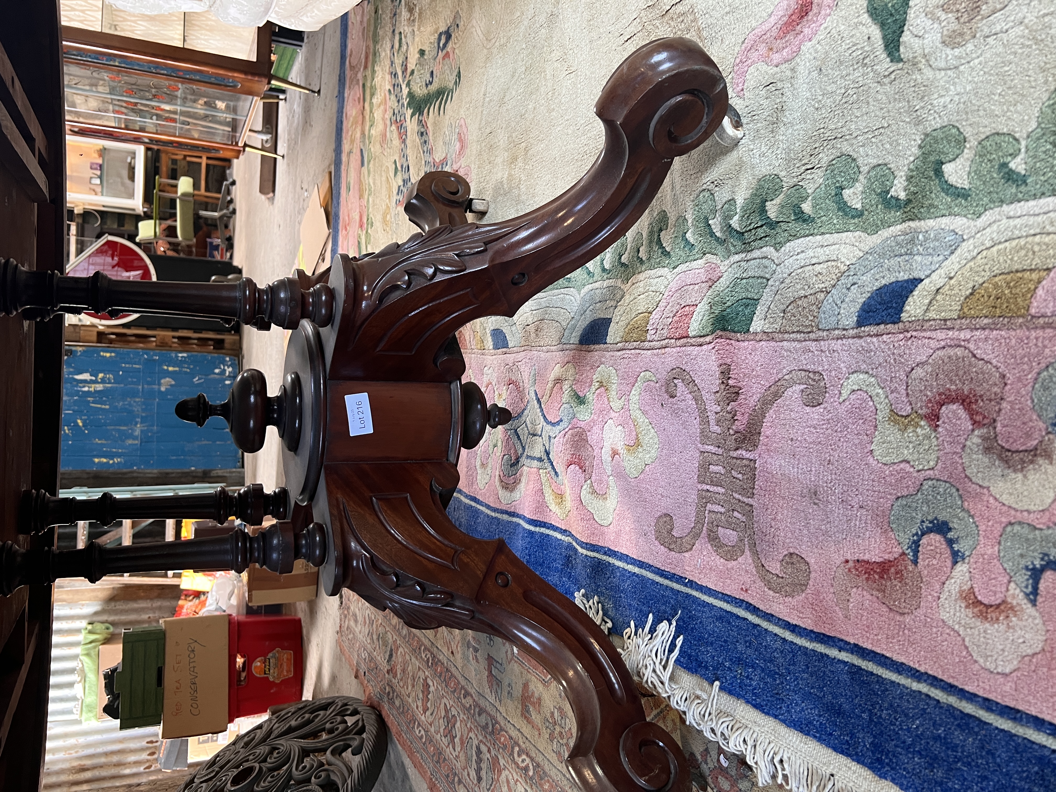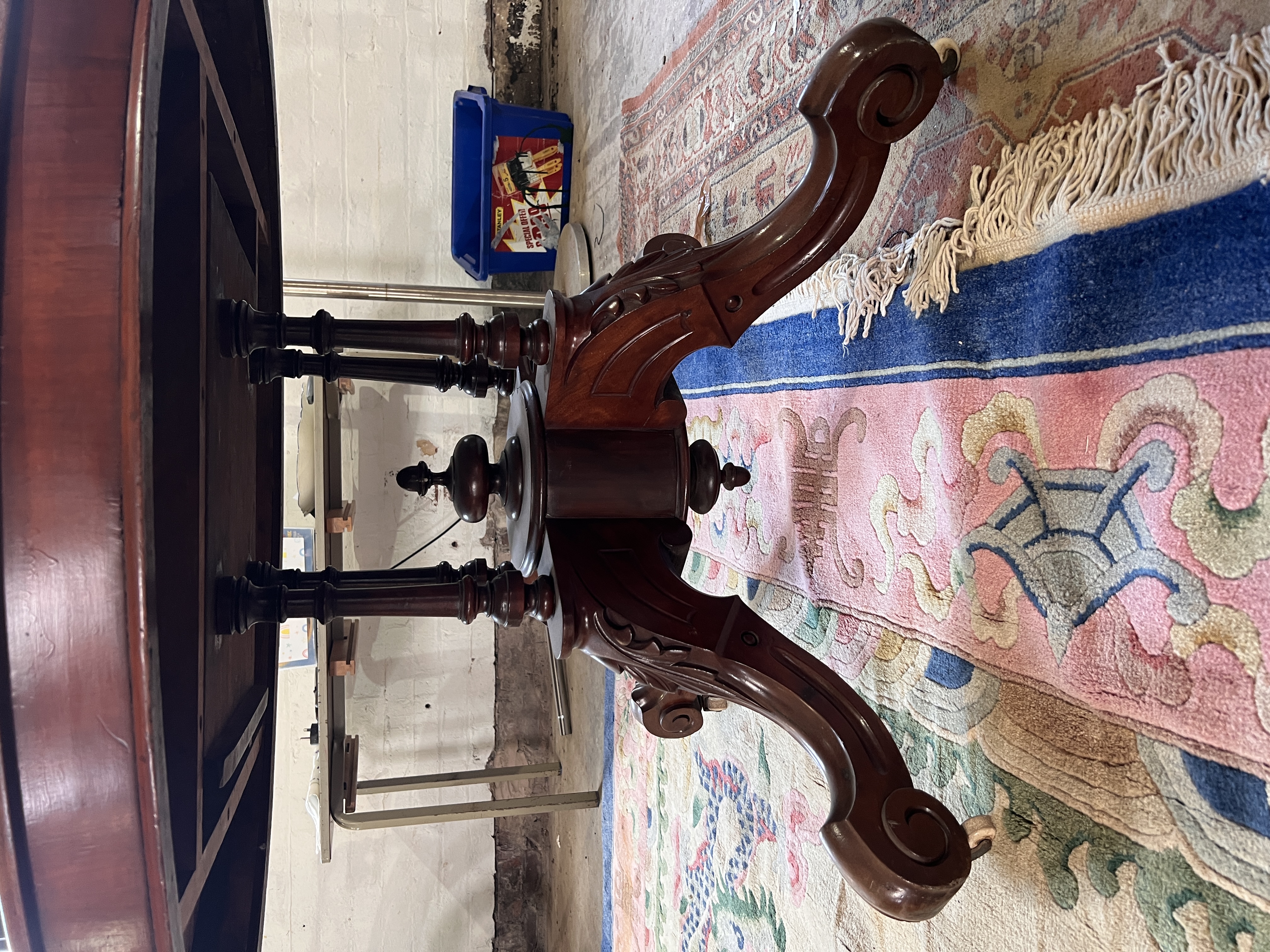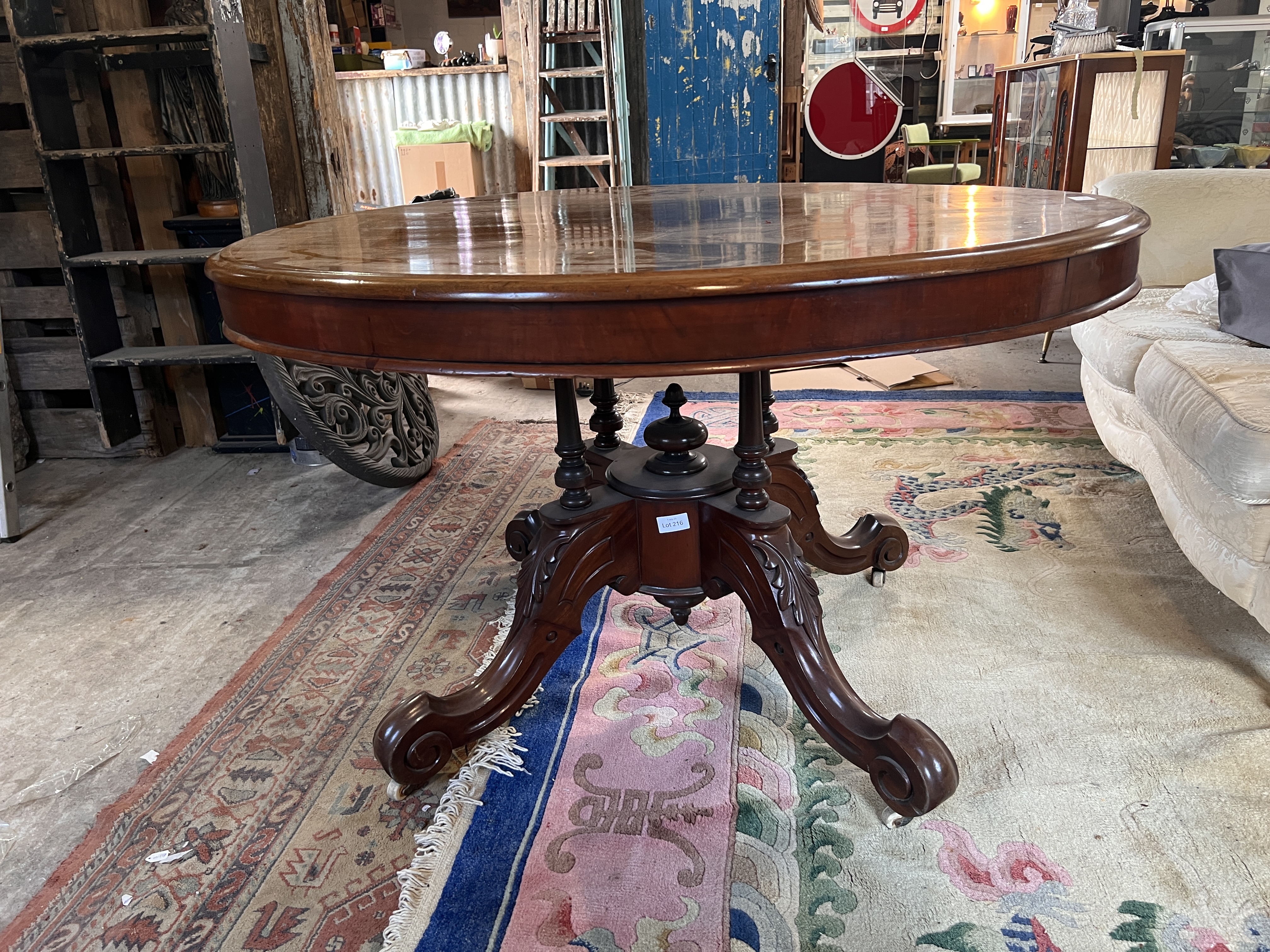 A Victorian mahogany oval tilt top table with carved legs on turned supports. 4ft long.
