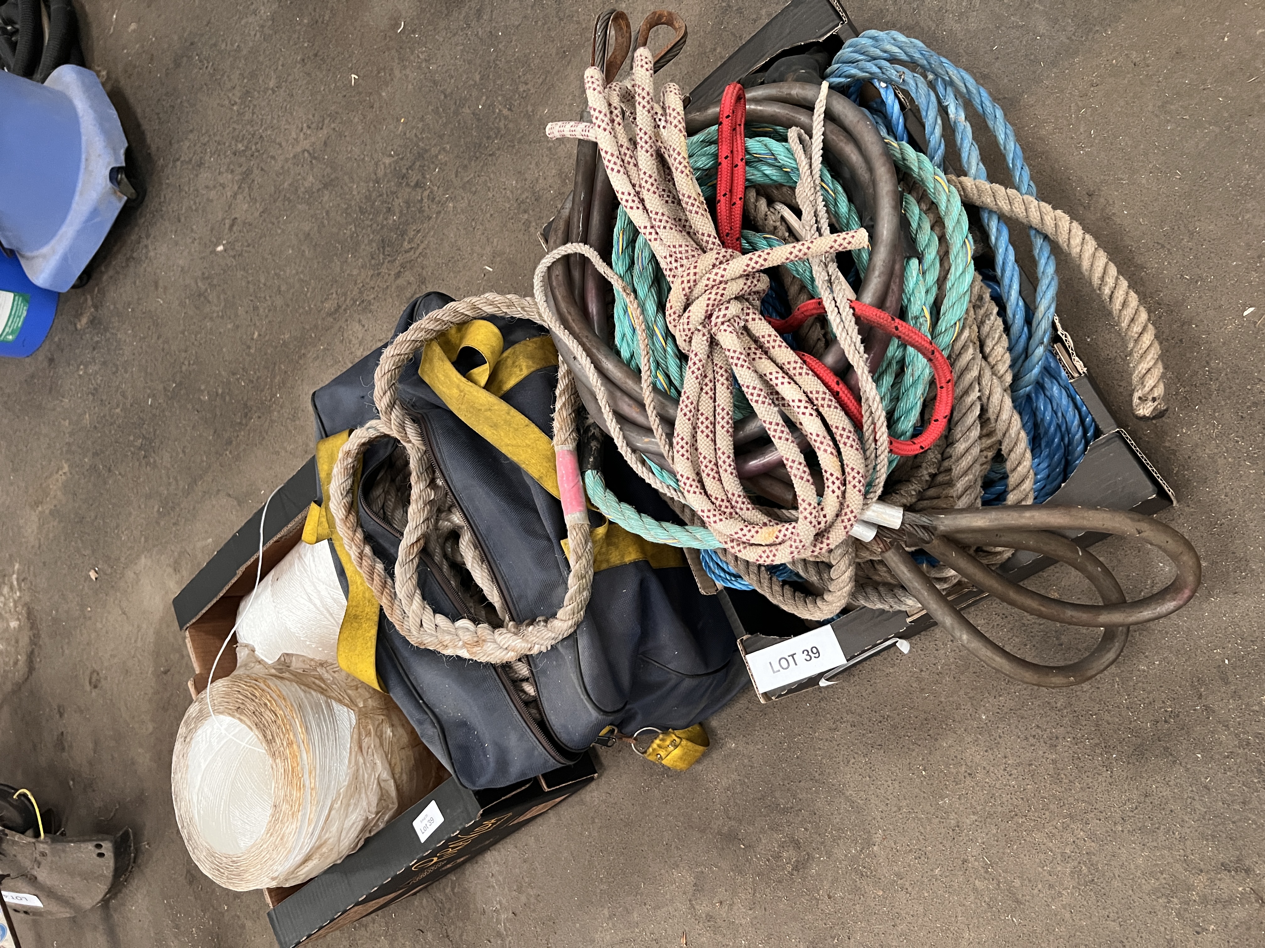 A crate of various ropes and packing string