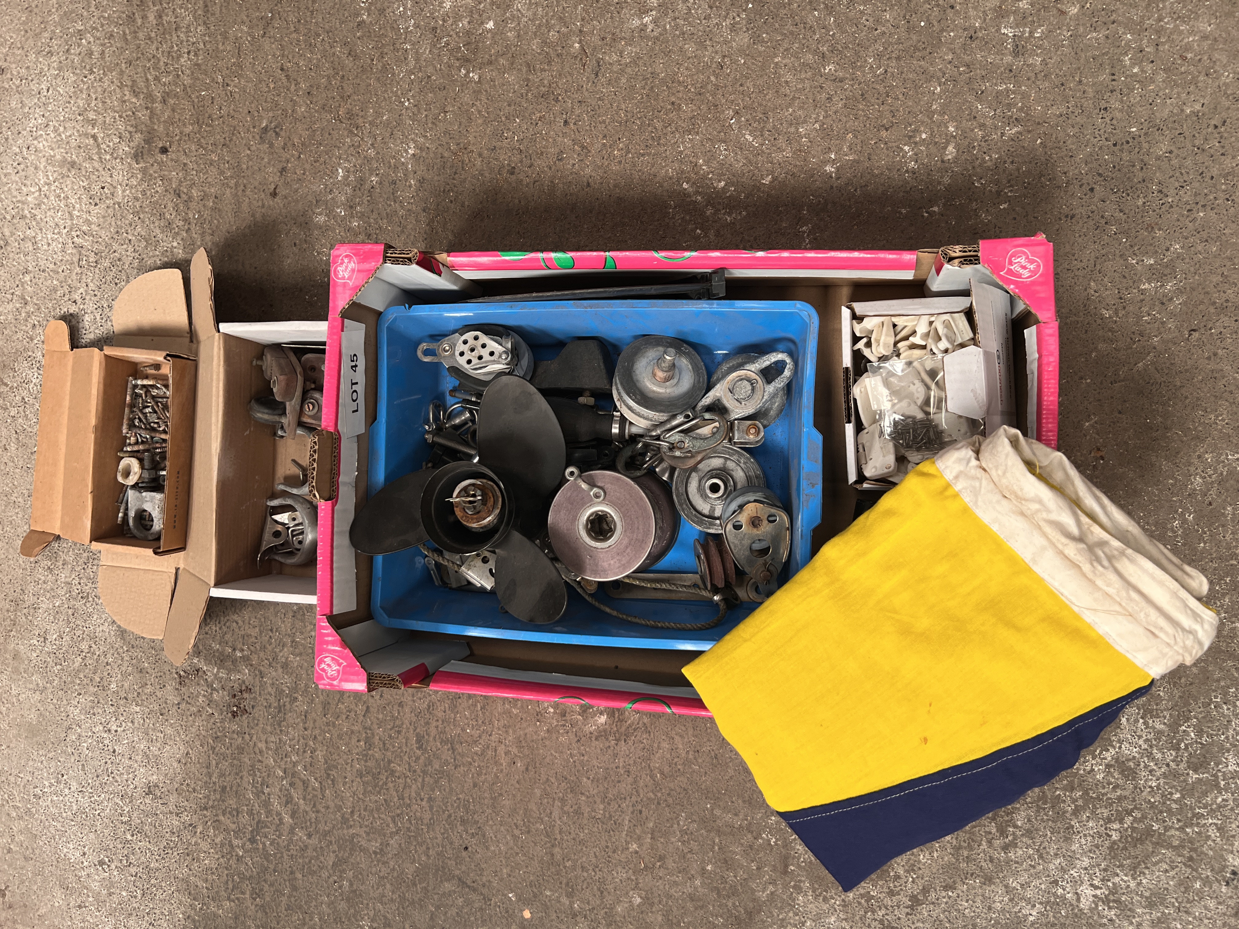 General marine spares winches, Evinrude prop, pulleys and associated marine hardware