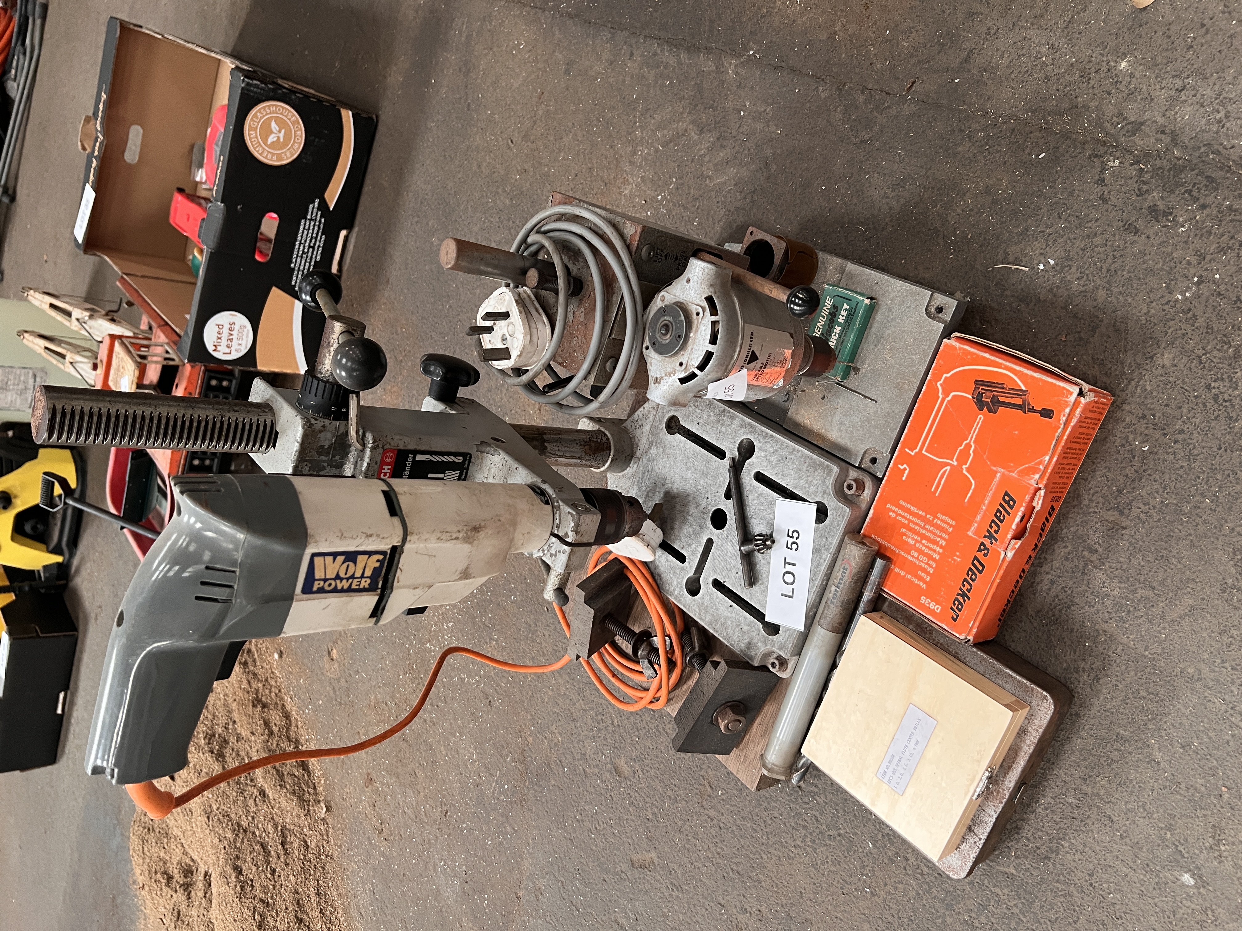 A Wolf 2 speed drill with black and decker work mate mounting + high speed PCB bench drill plus Cntr Drills, & Drill Set