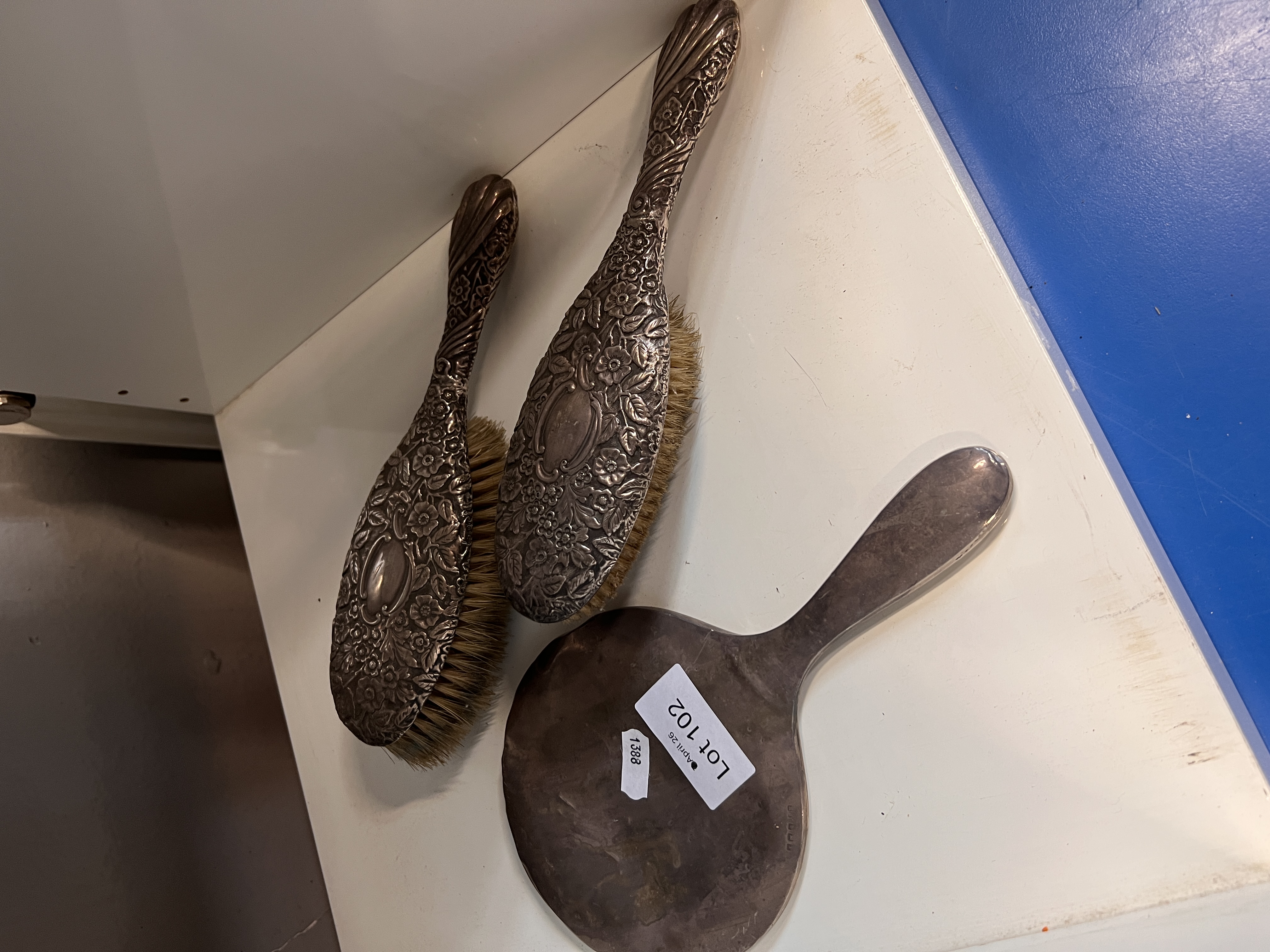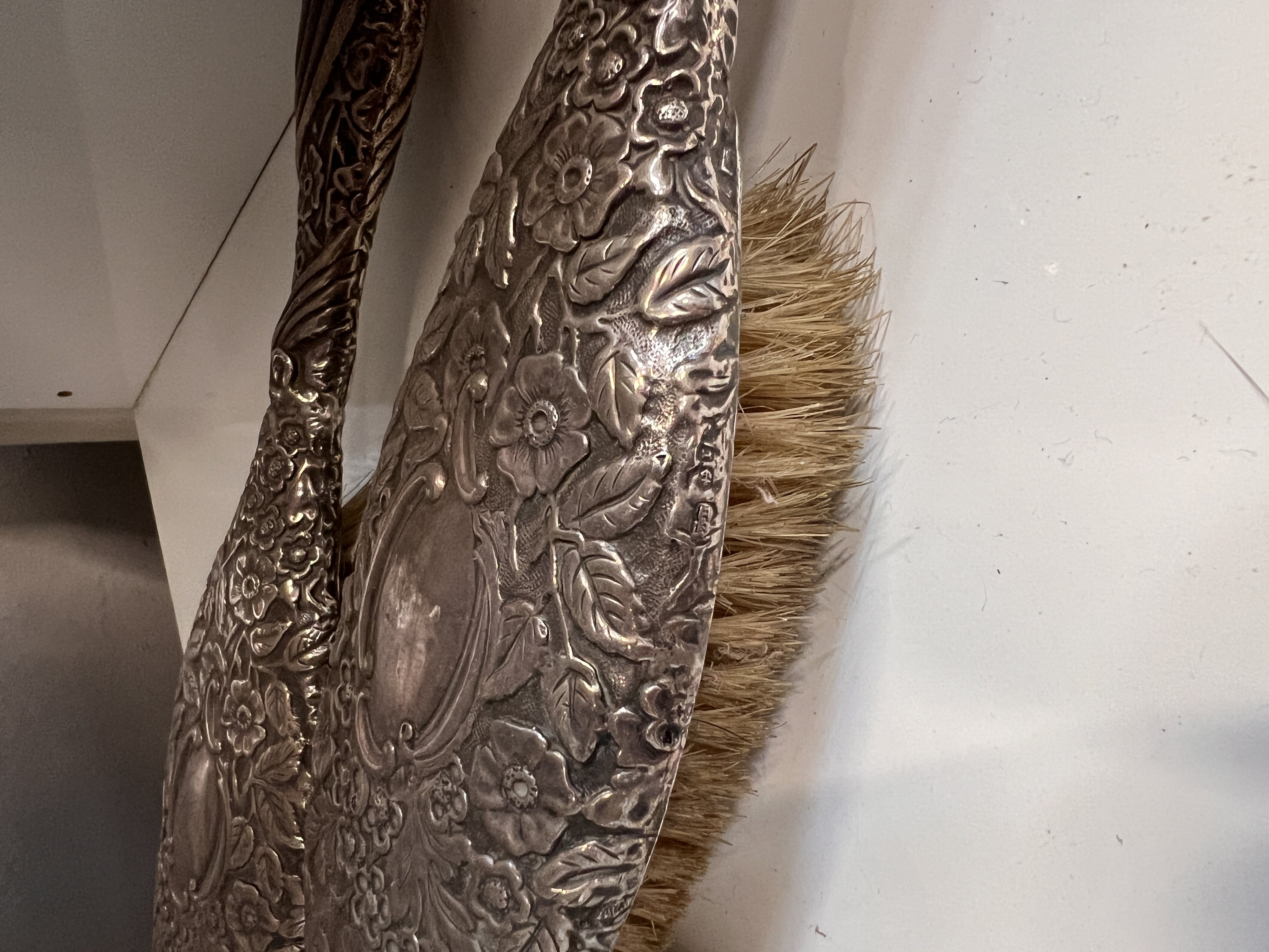 Two vintage HM silver backed brushes having floral decoration with similar silver backed mirror.