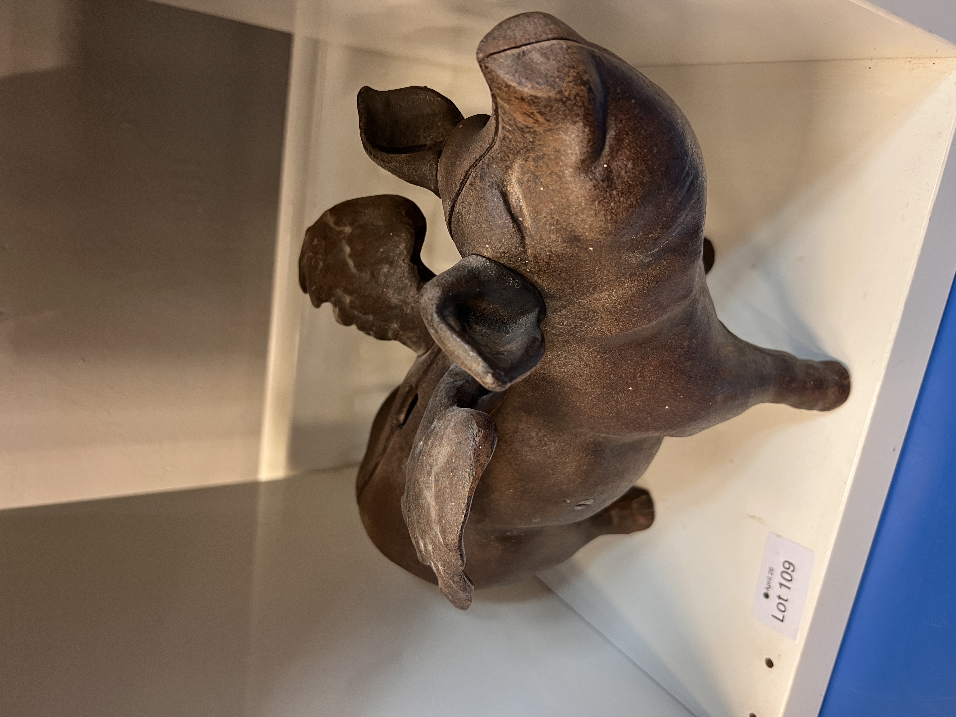 A cast iron flying pig money bank.