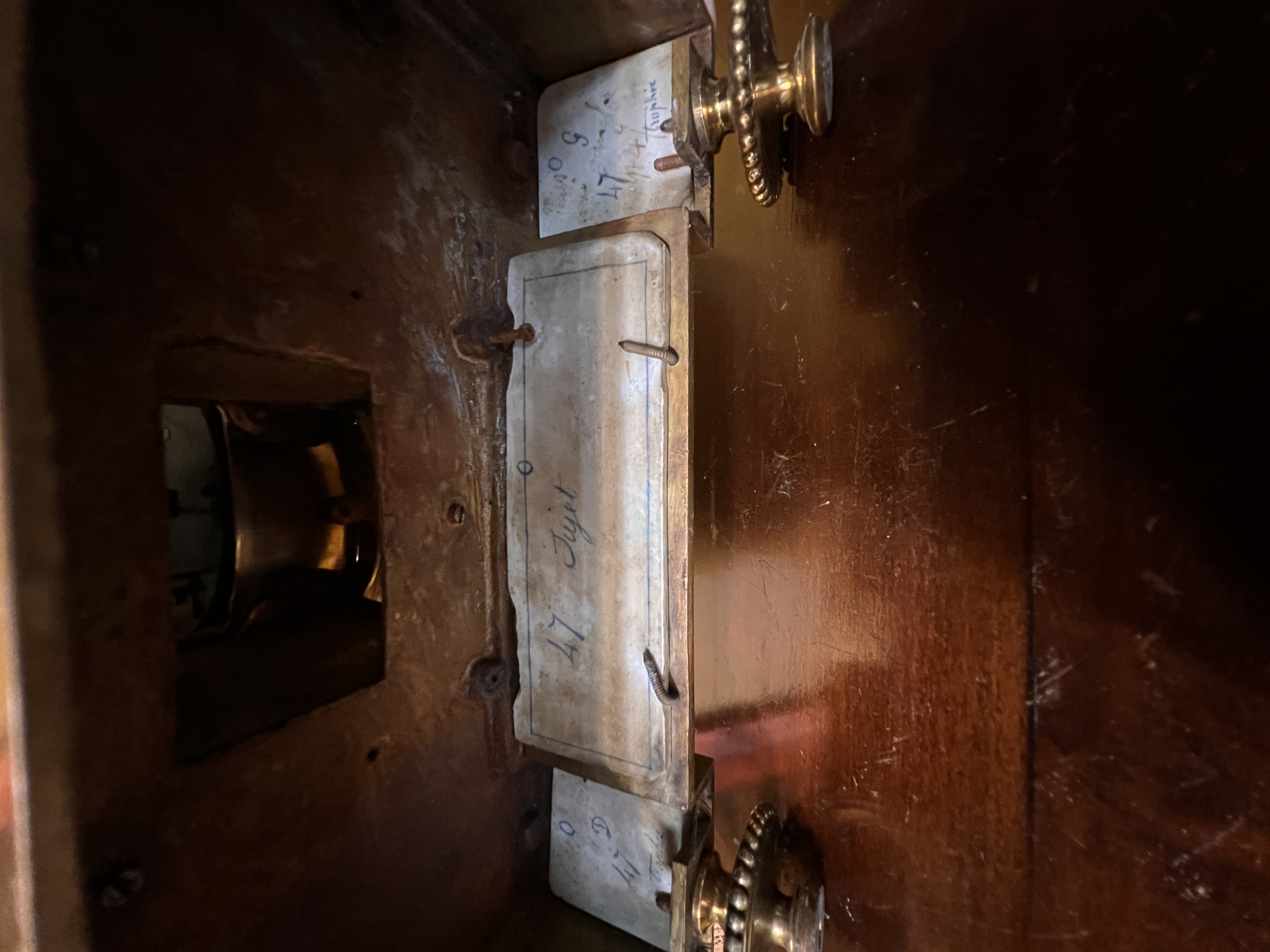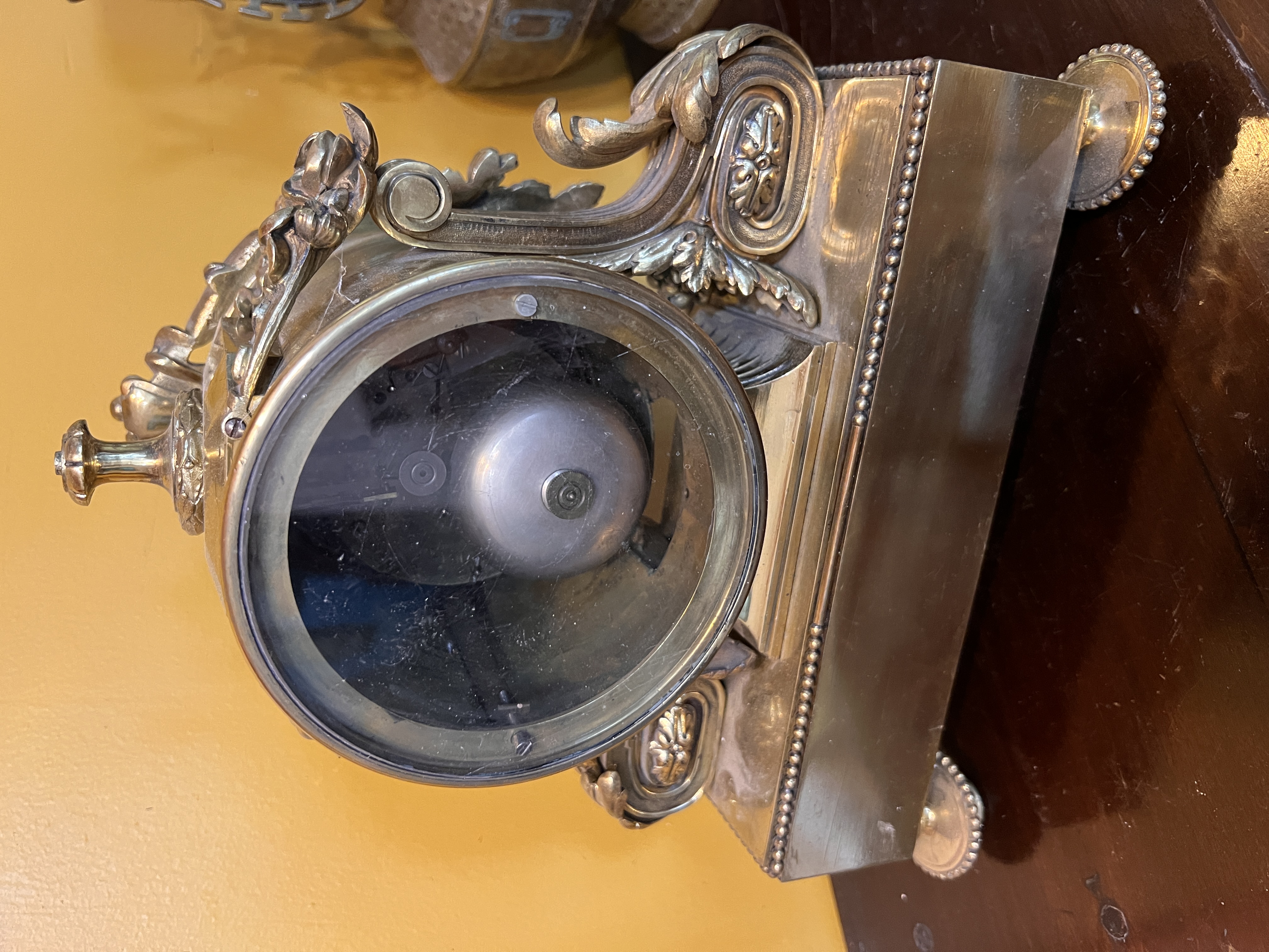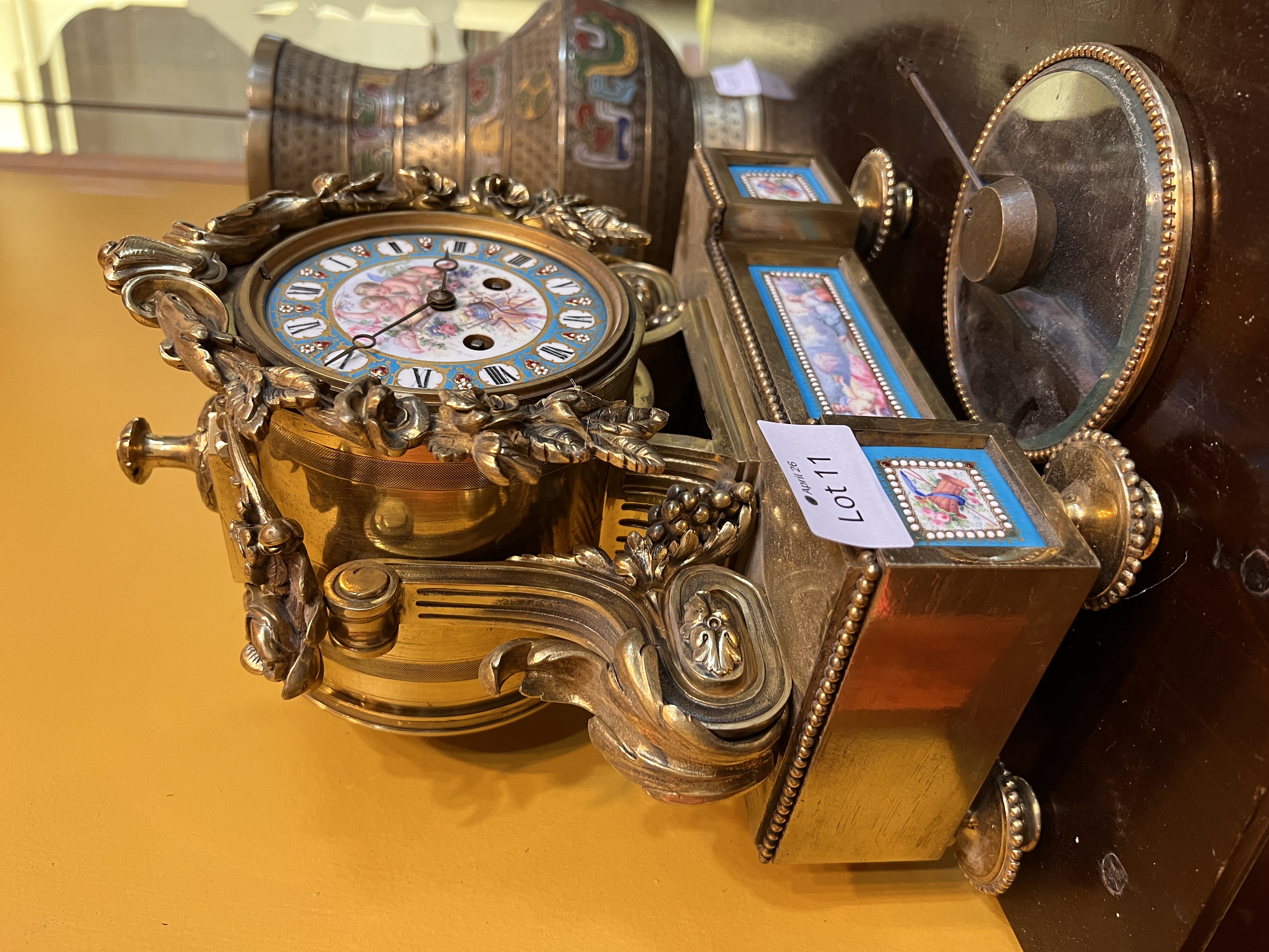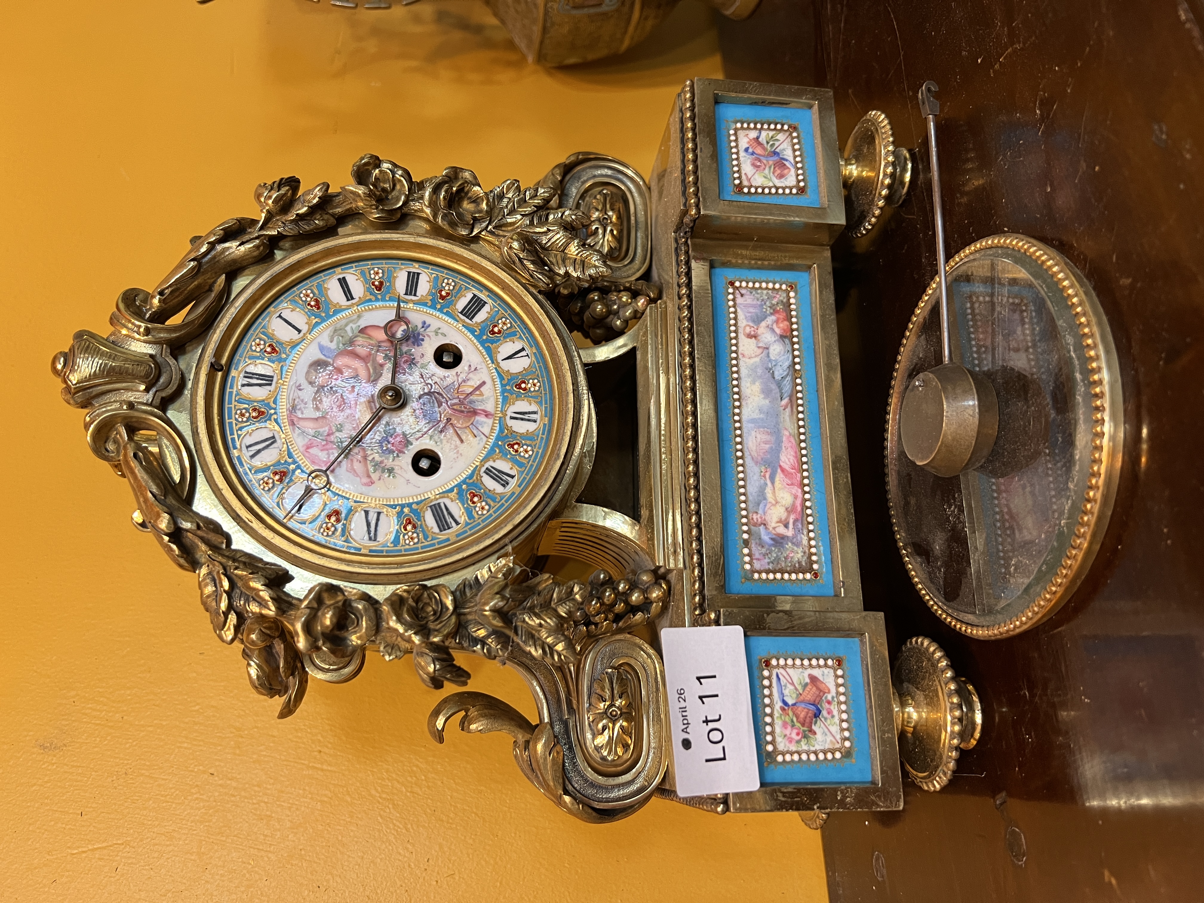 A 19th century French barrel gilt and ormolu cased clock. Having porcelain and enamel decorated face with cherubs in a Sevres style. Panels signed to back. As found.