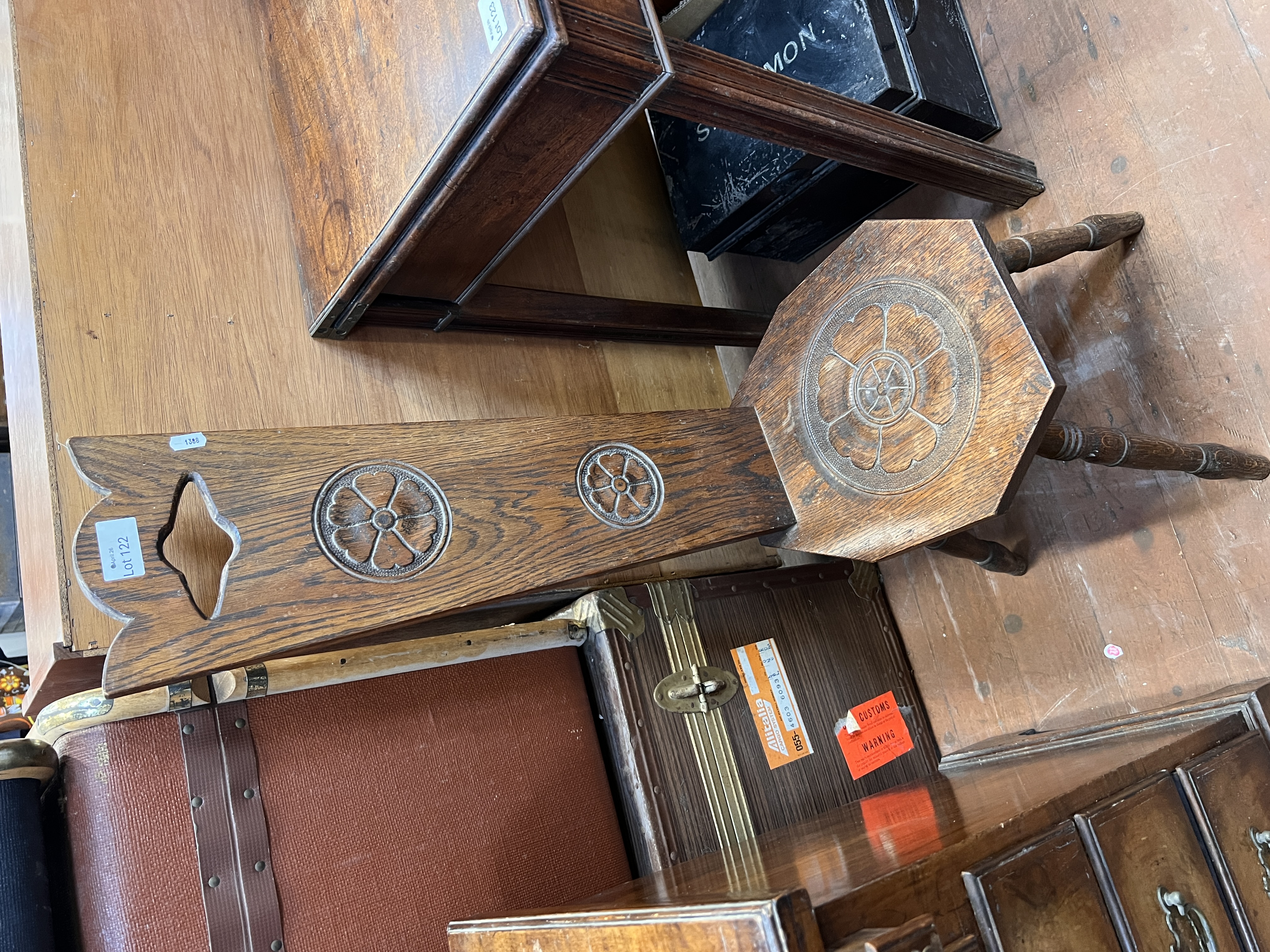 An early 20th century traditional oak framed spinning chair with carved seat and back.