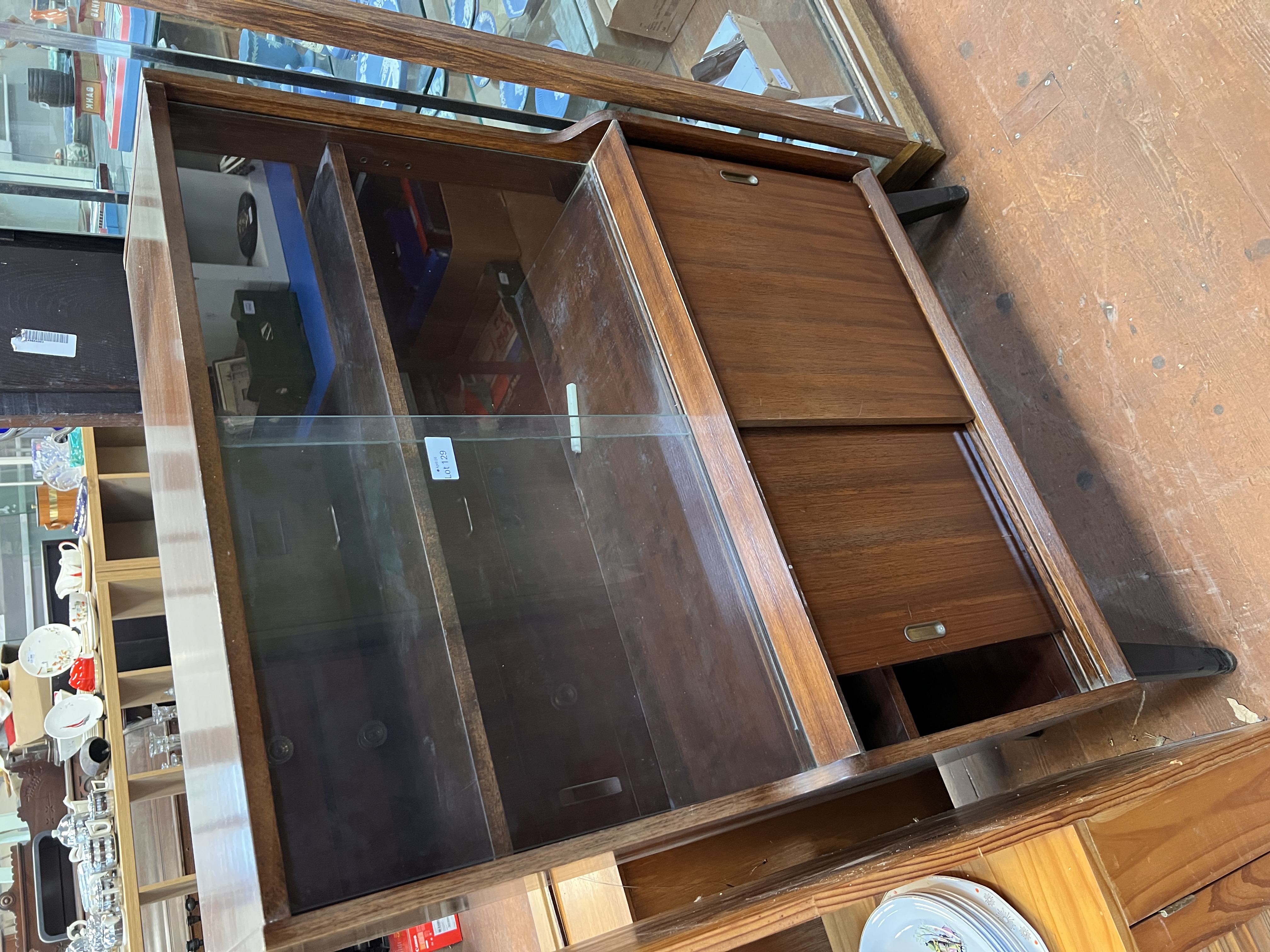 A mid-century teak cupboard and glazed display case.