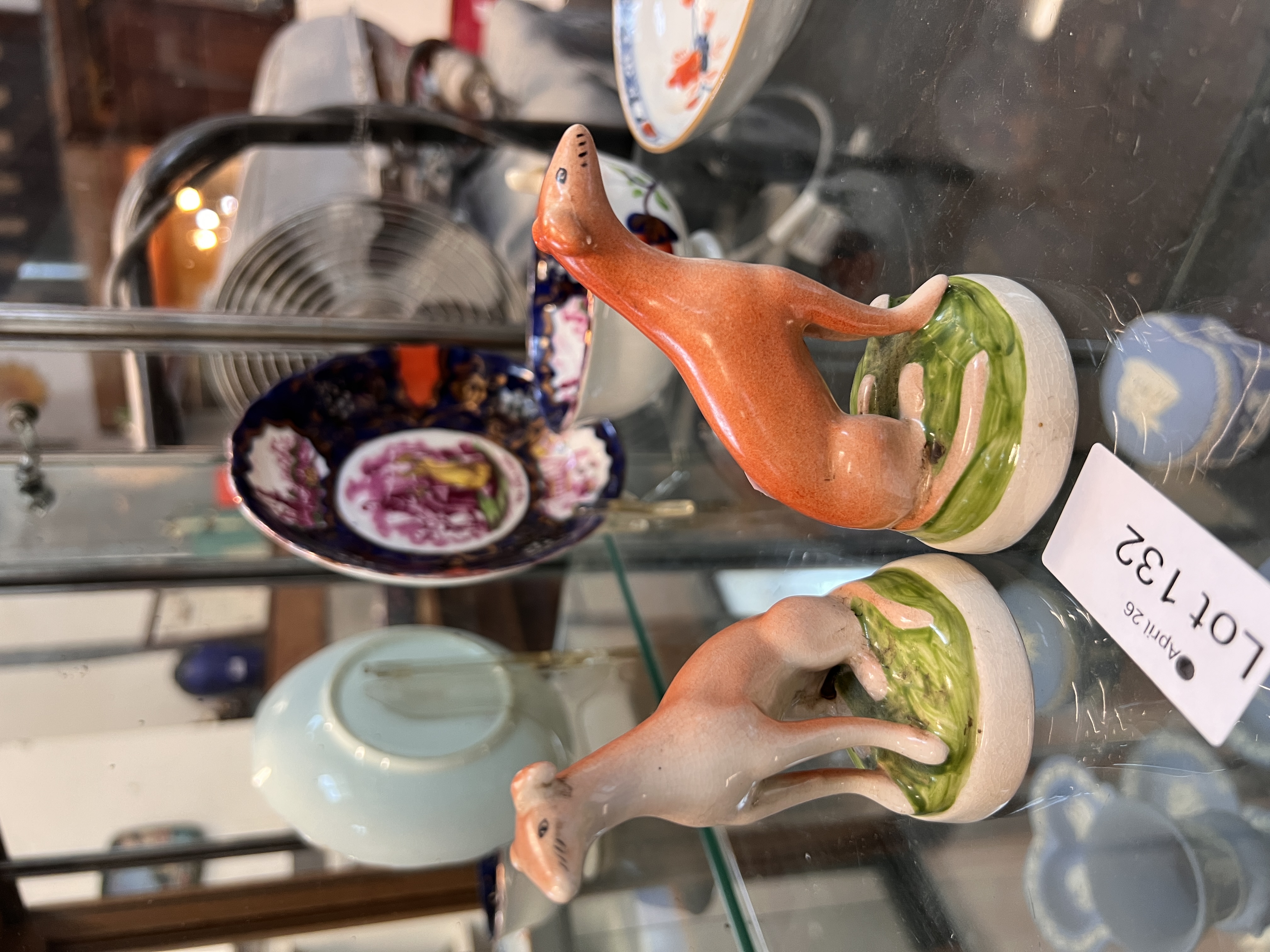 A pair of early 20th century Staffordshire flatback figures of two small hounds.