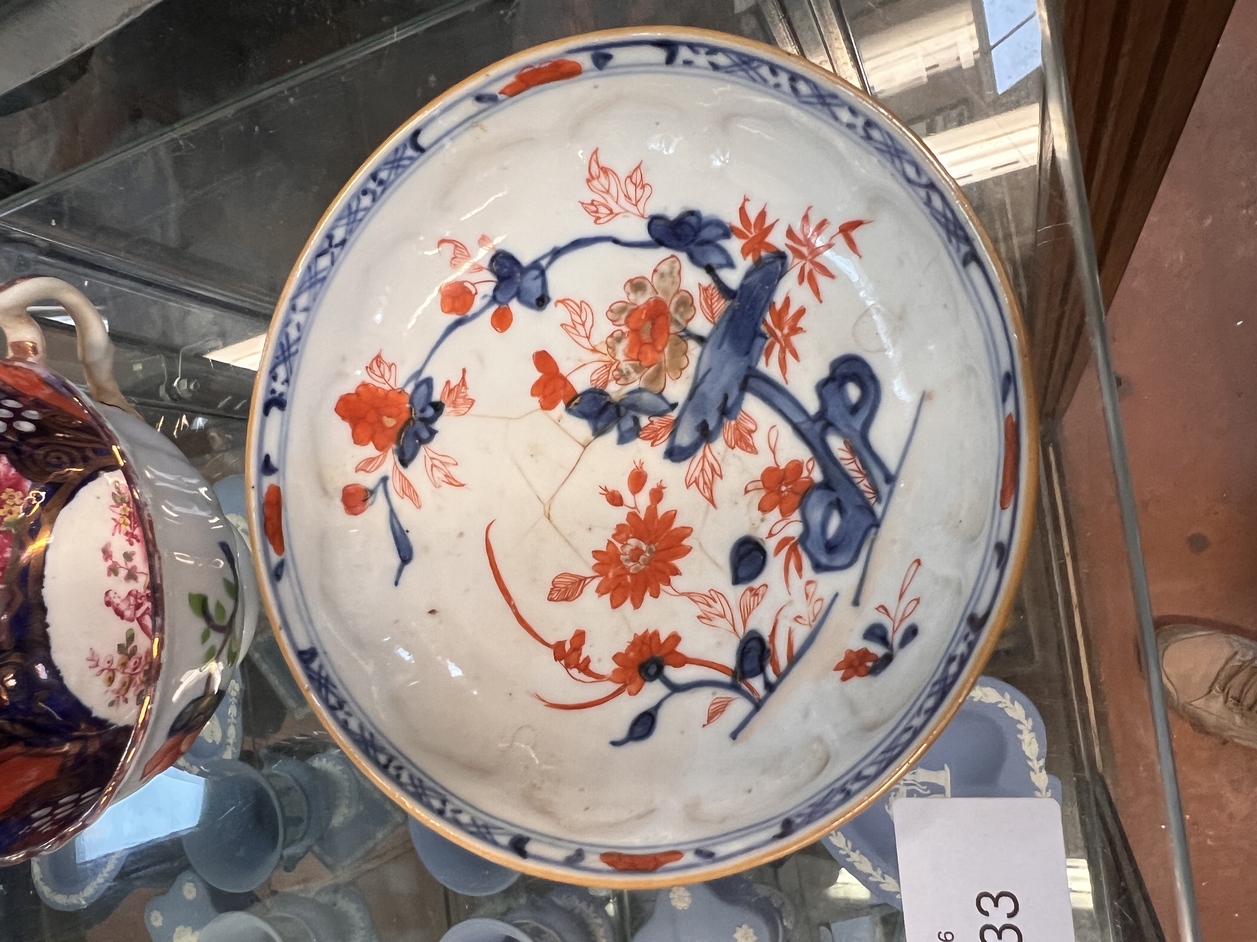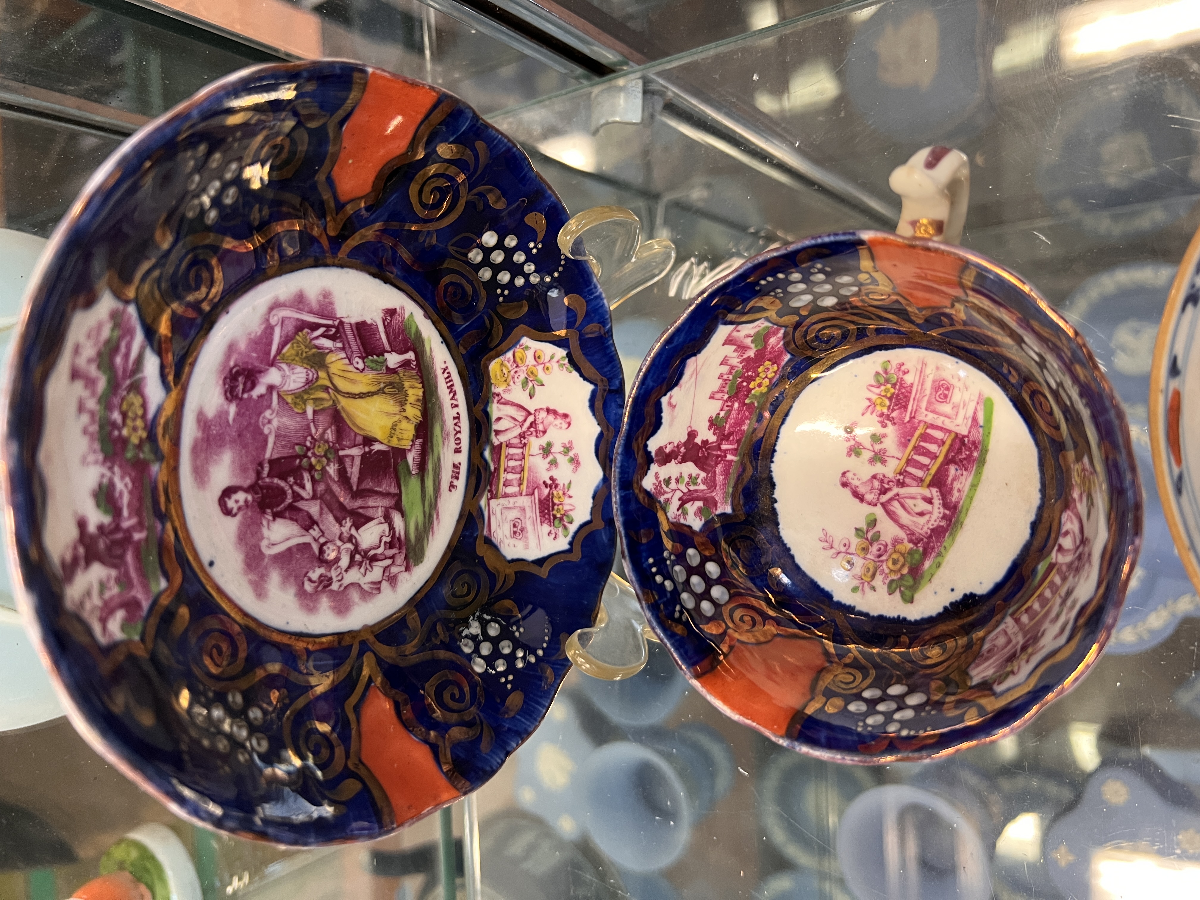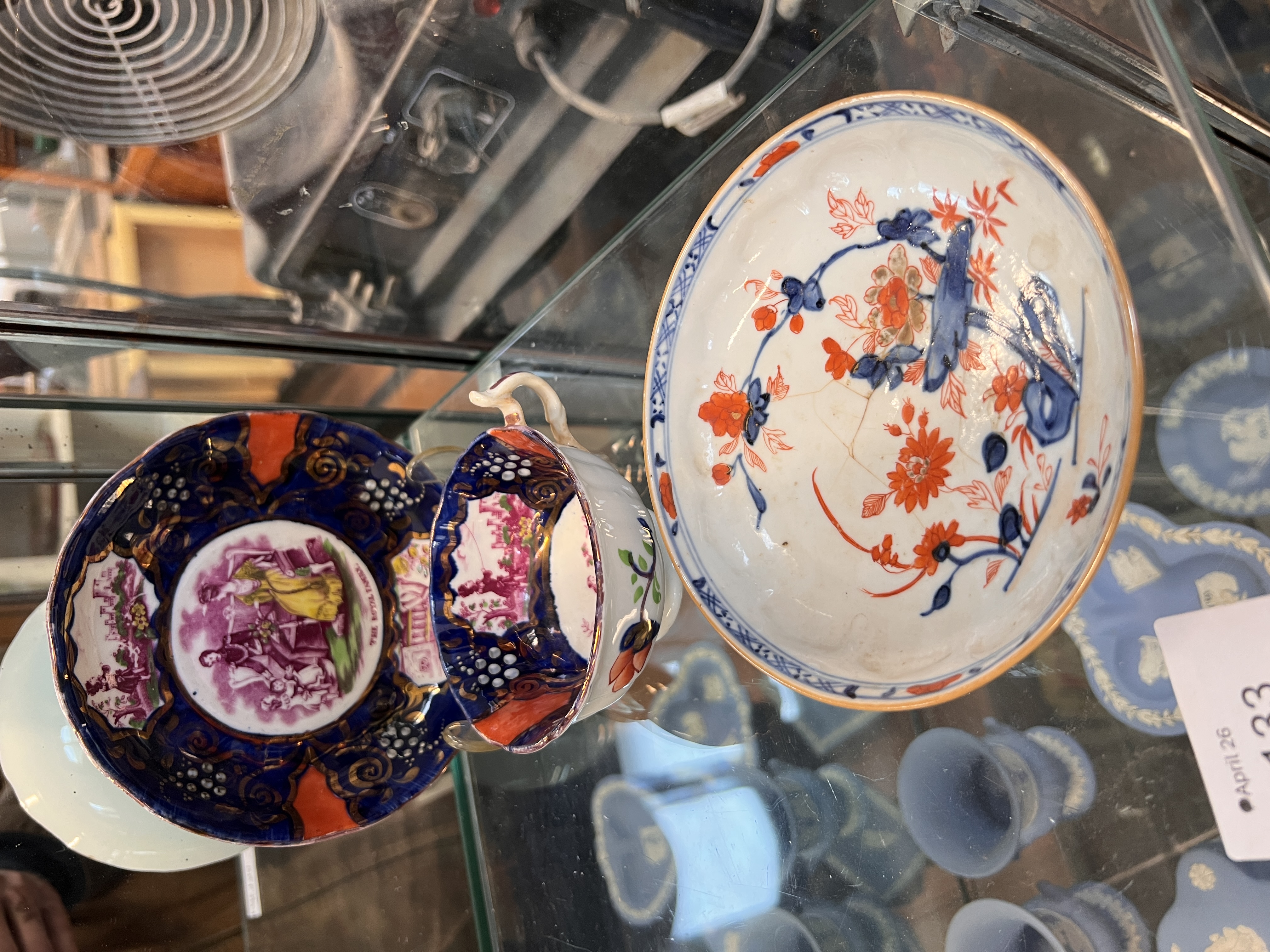 An antique Gaudy Welsh style tea cup and saucer set for the Royal family and a Chinese Porcelain lotus pattern Imari dish.