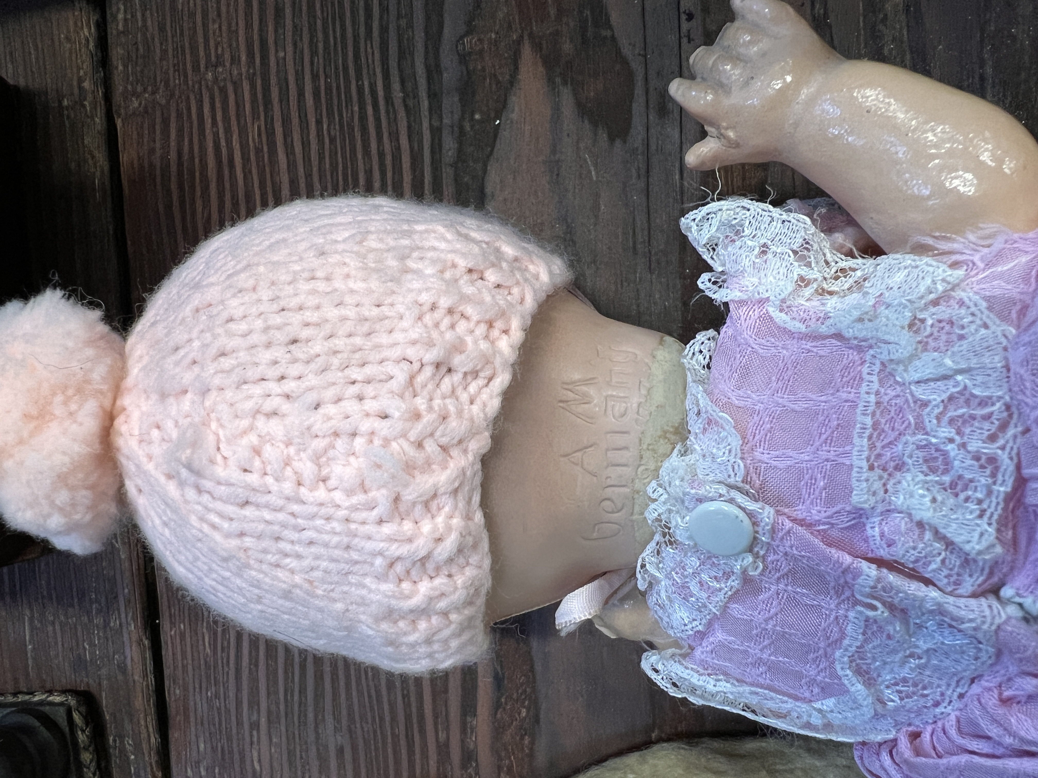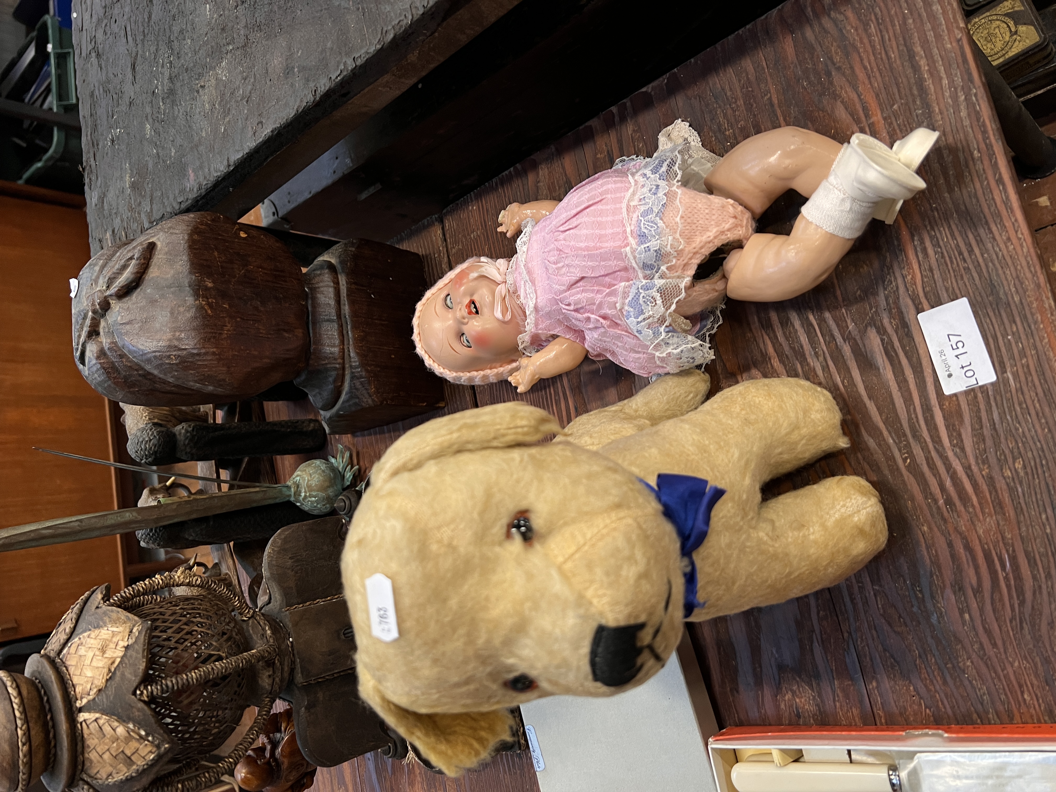 An AM Germany celluloid doll with glass eyes and accompanying soft dog.