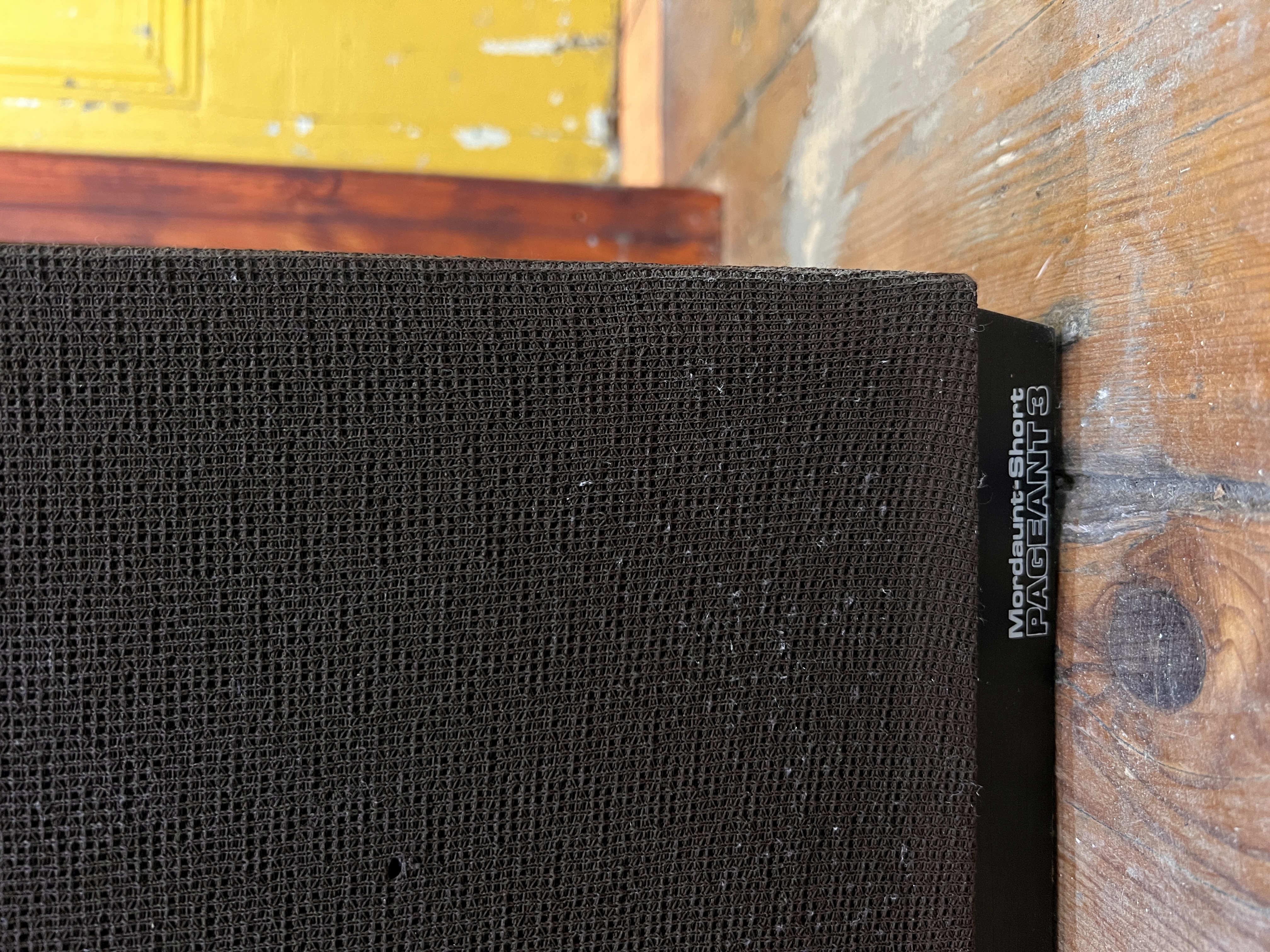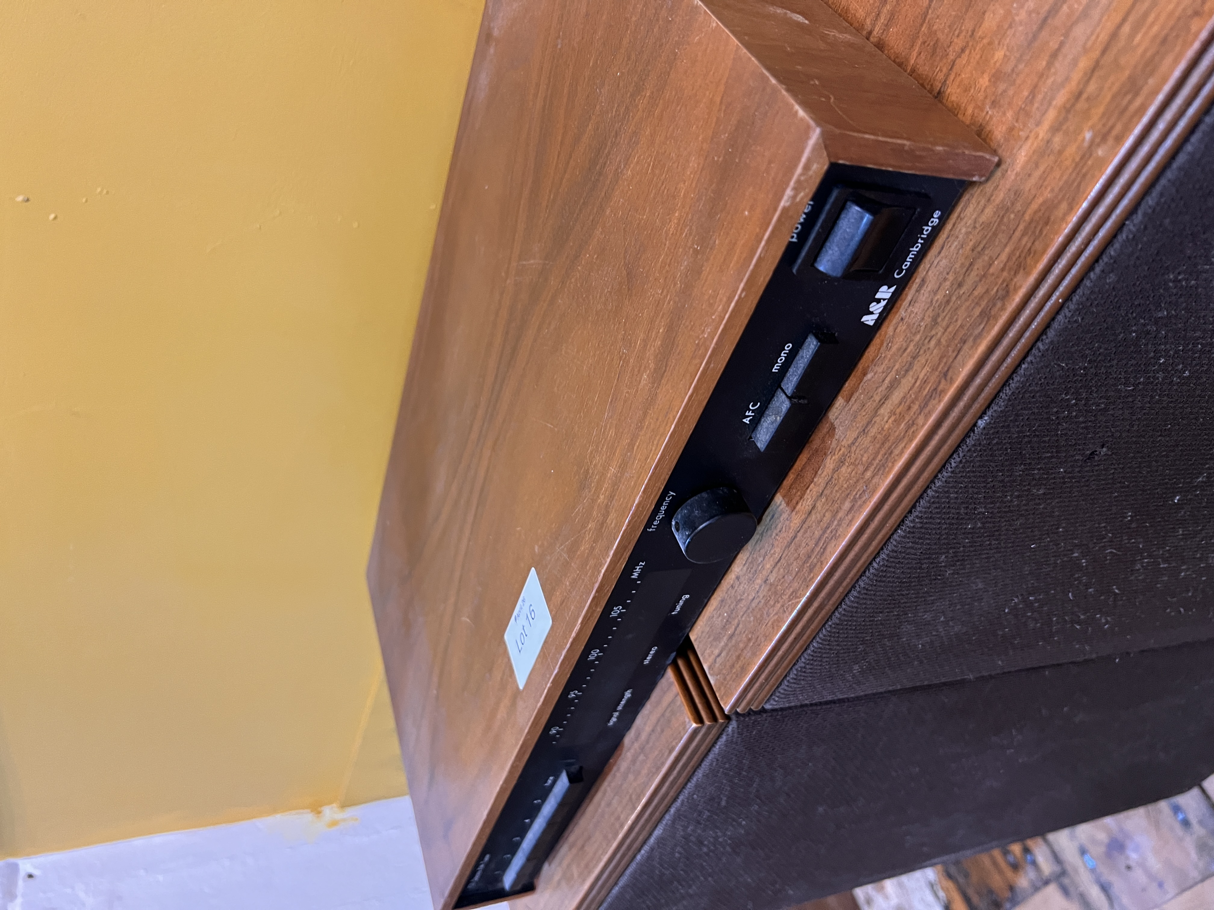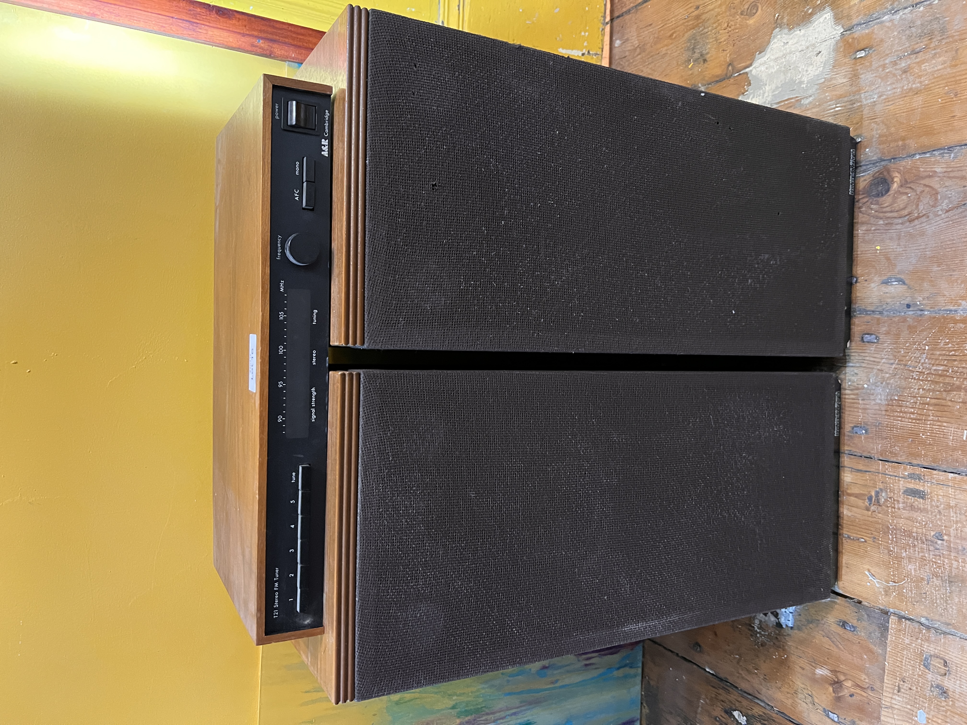 A pair of mid-century teak Mordaunt short Pageant 3 speakers with Cambridge Tuner.