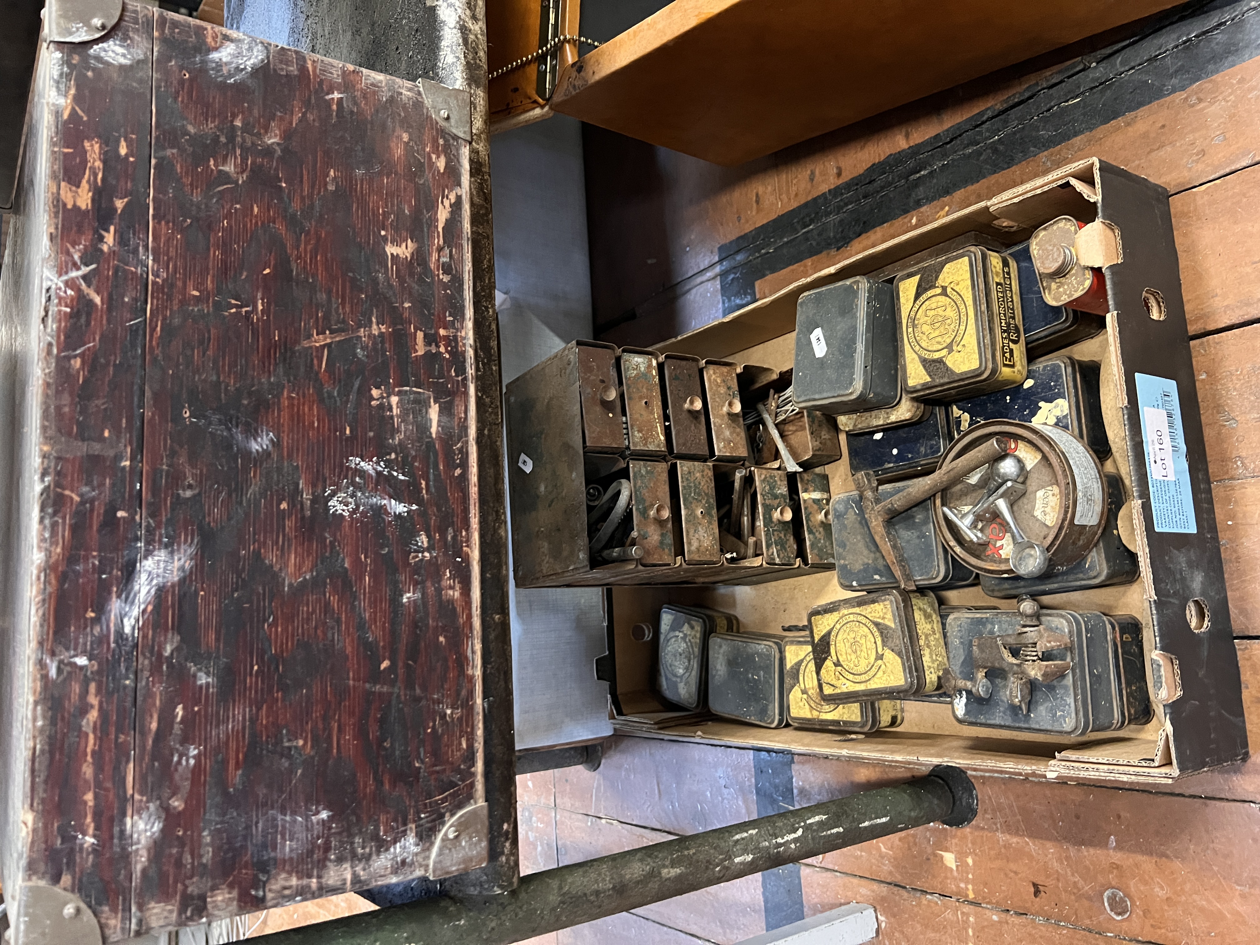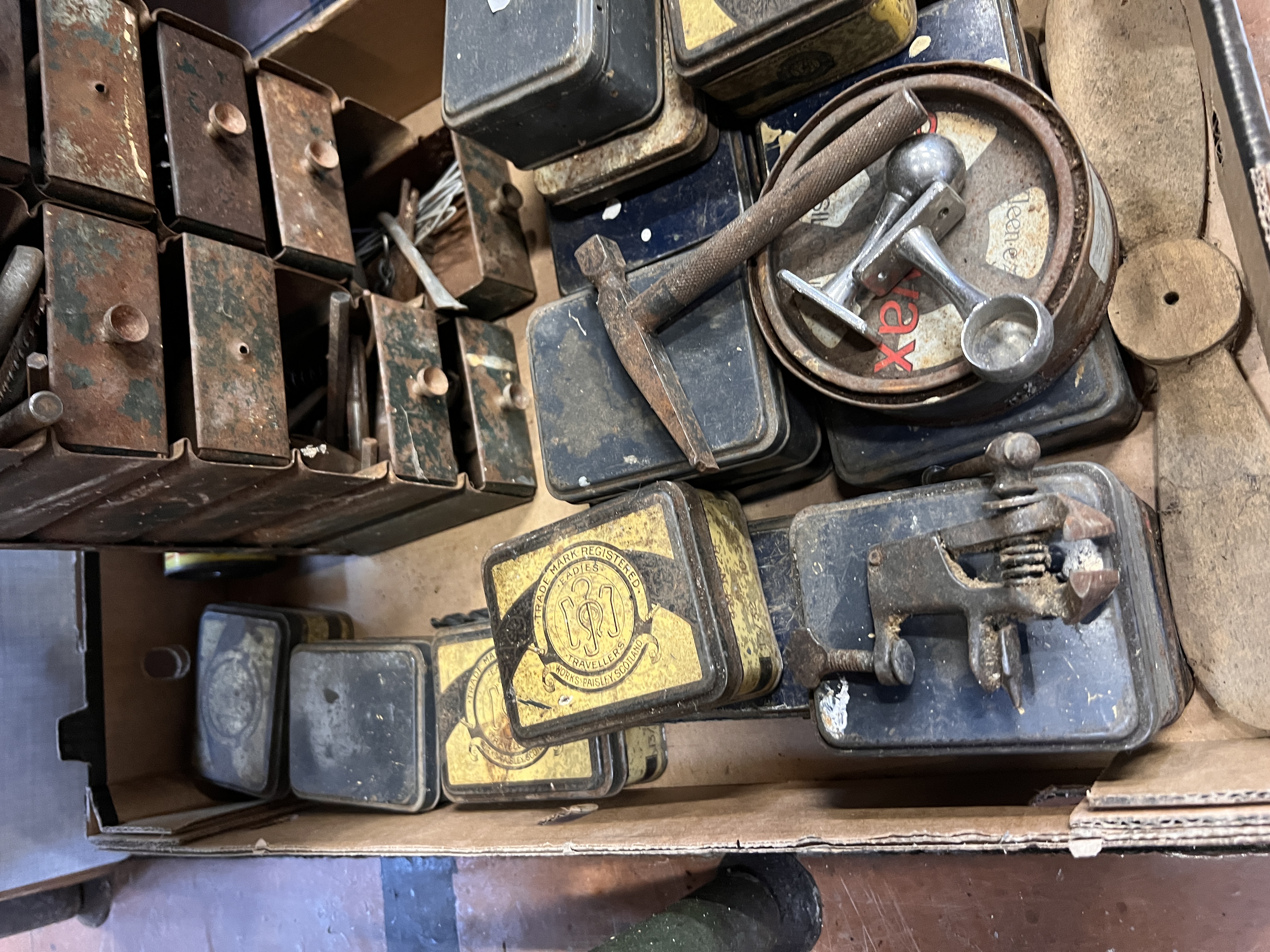 A selection of assorted tins and tools including miniature watchmakers or similar vice.