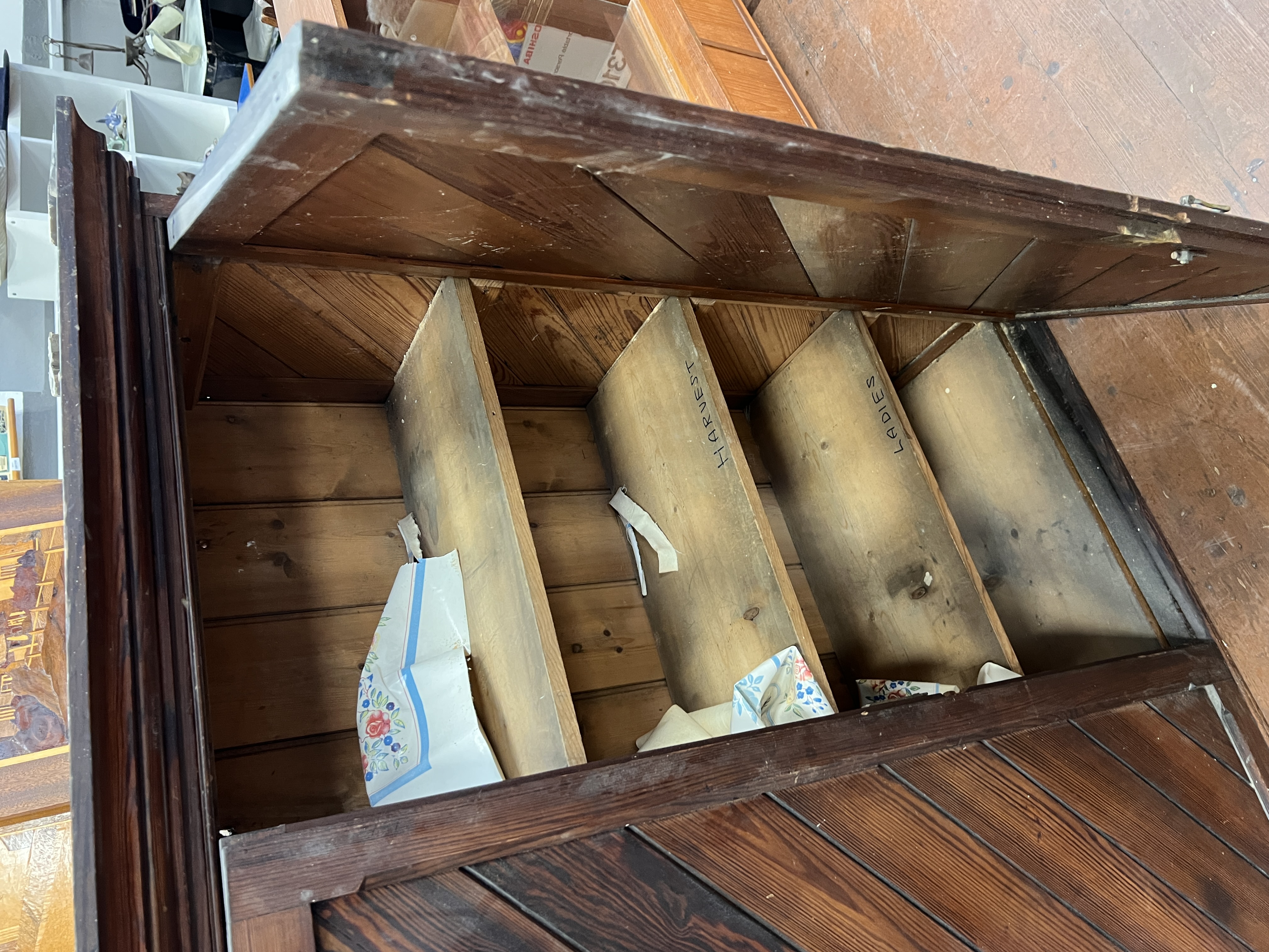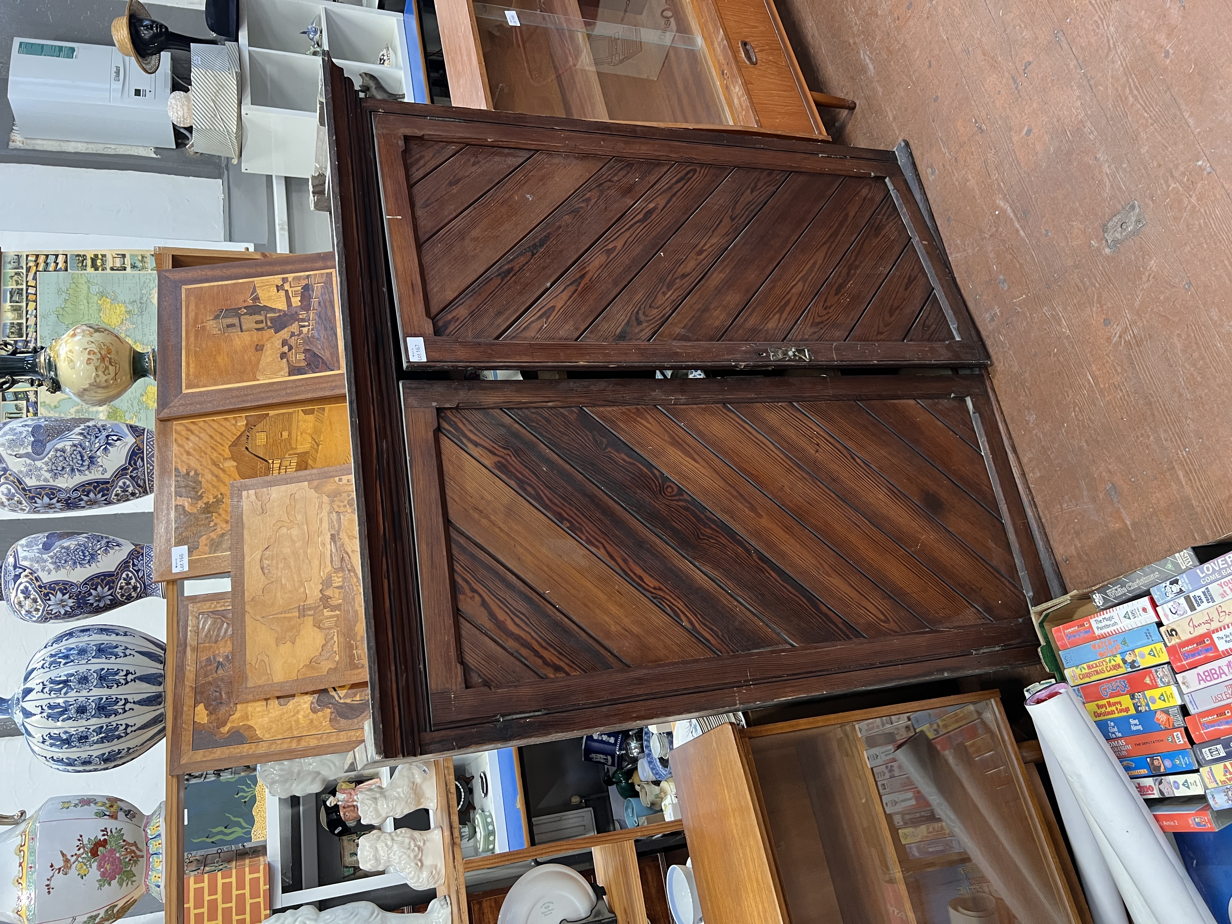 A Victorian pitch pine ecclesiastical church utility cupboard with shelved interior.