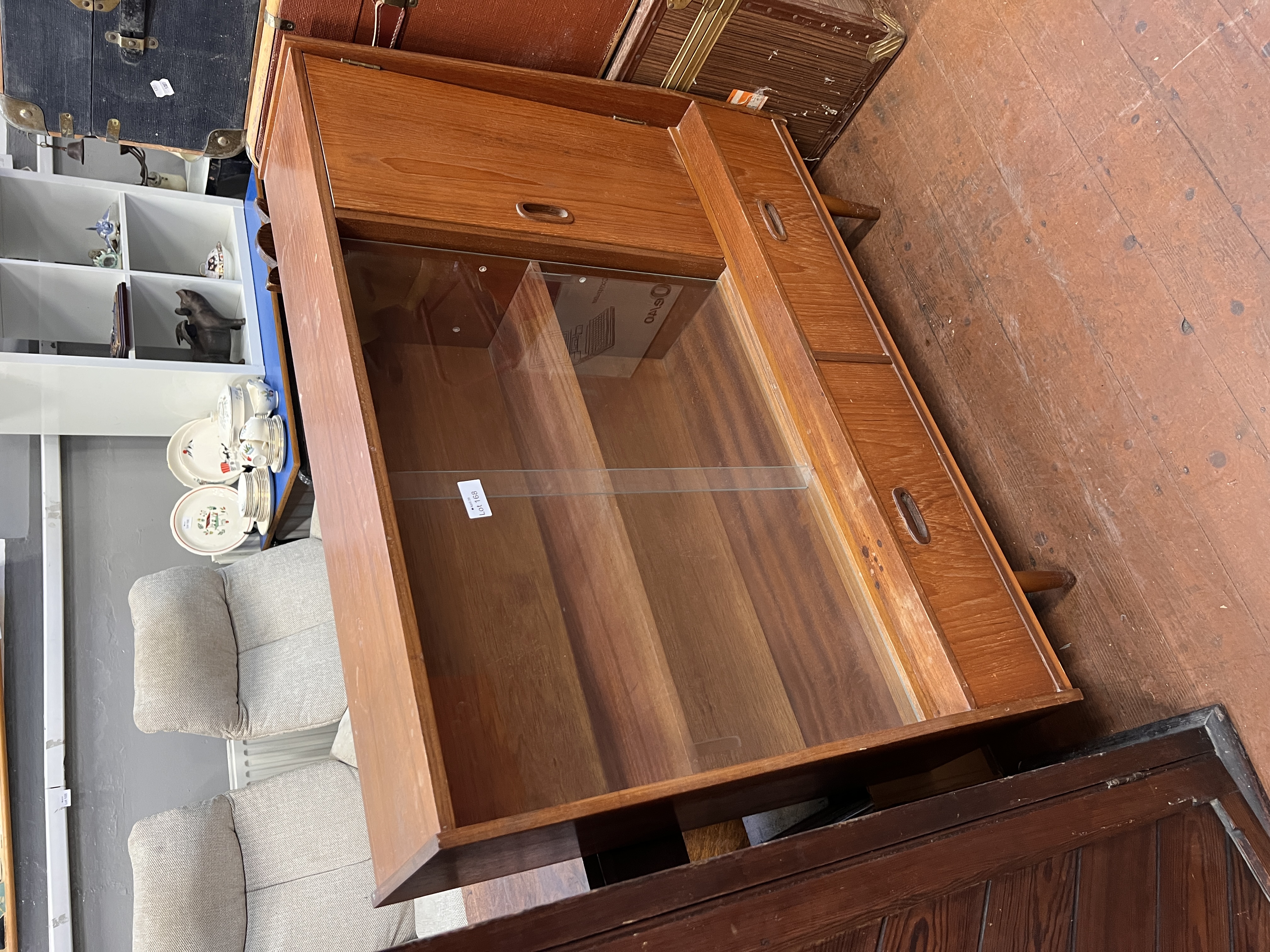 A mid century teak book case and cupboard with double drawers and glazed doors.