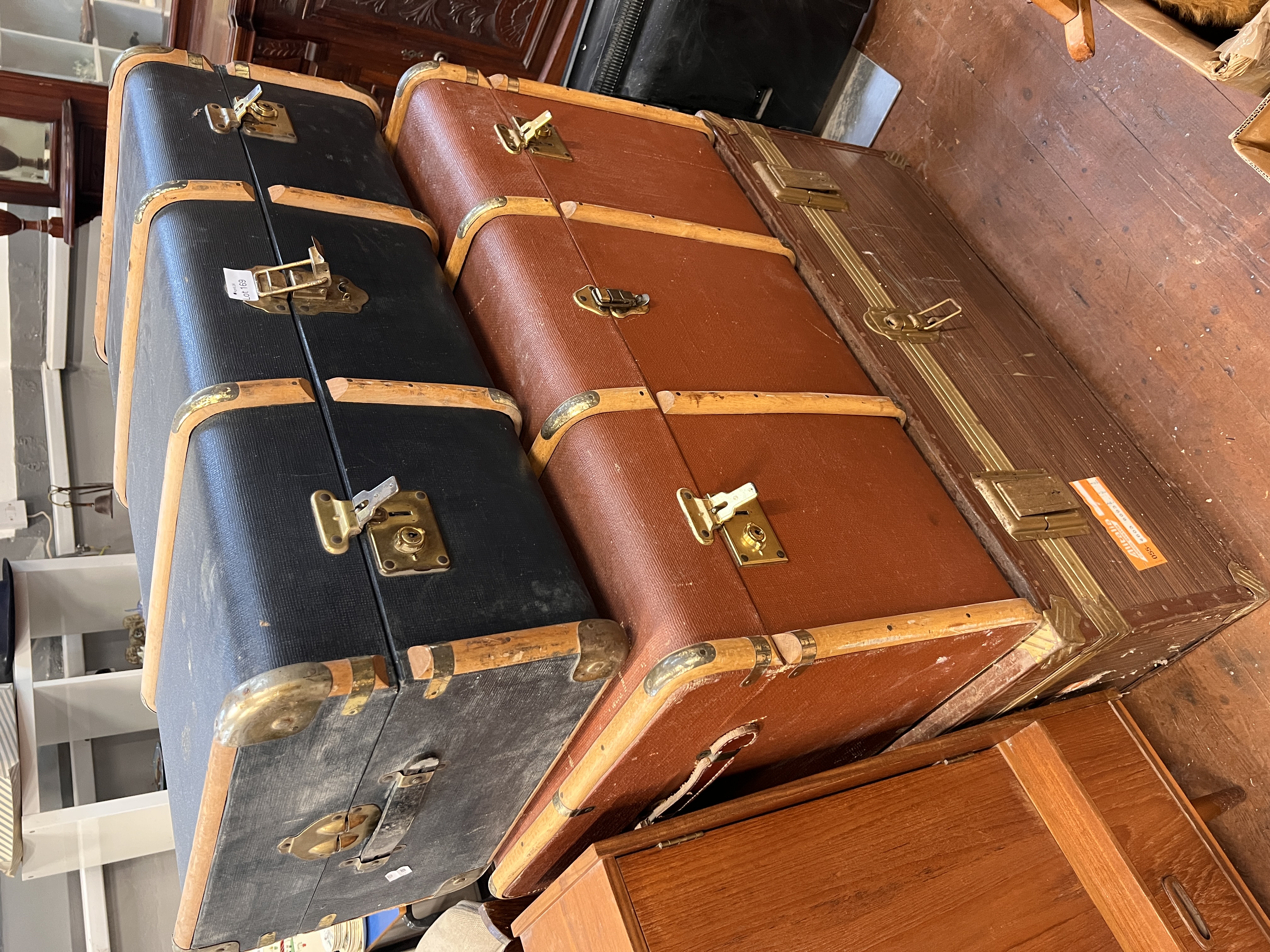 Three large vintage luggage trunks including two canvas steamer trunks.