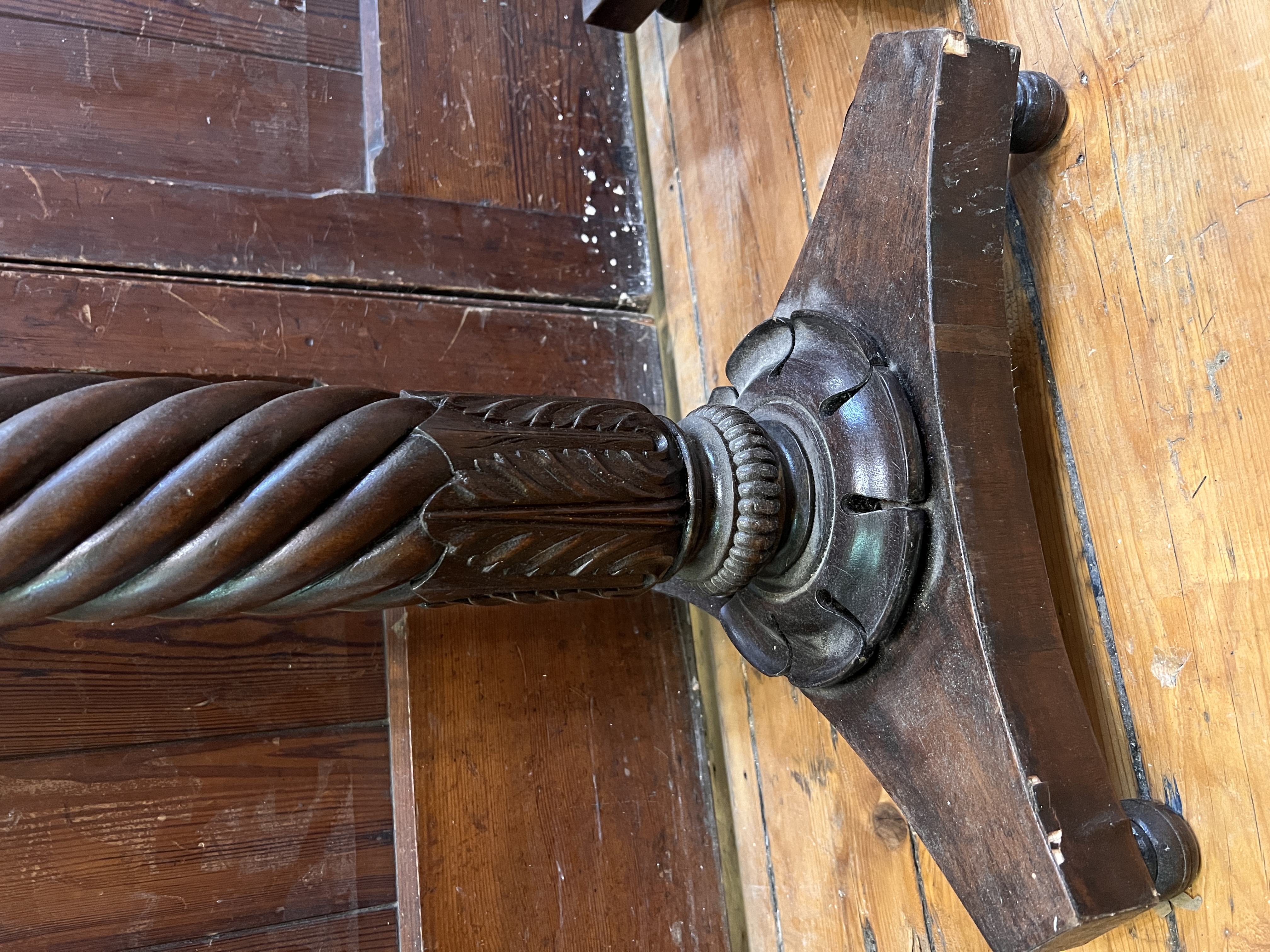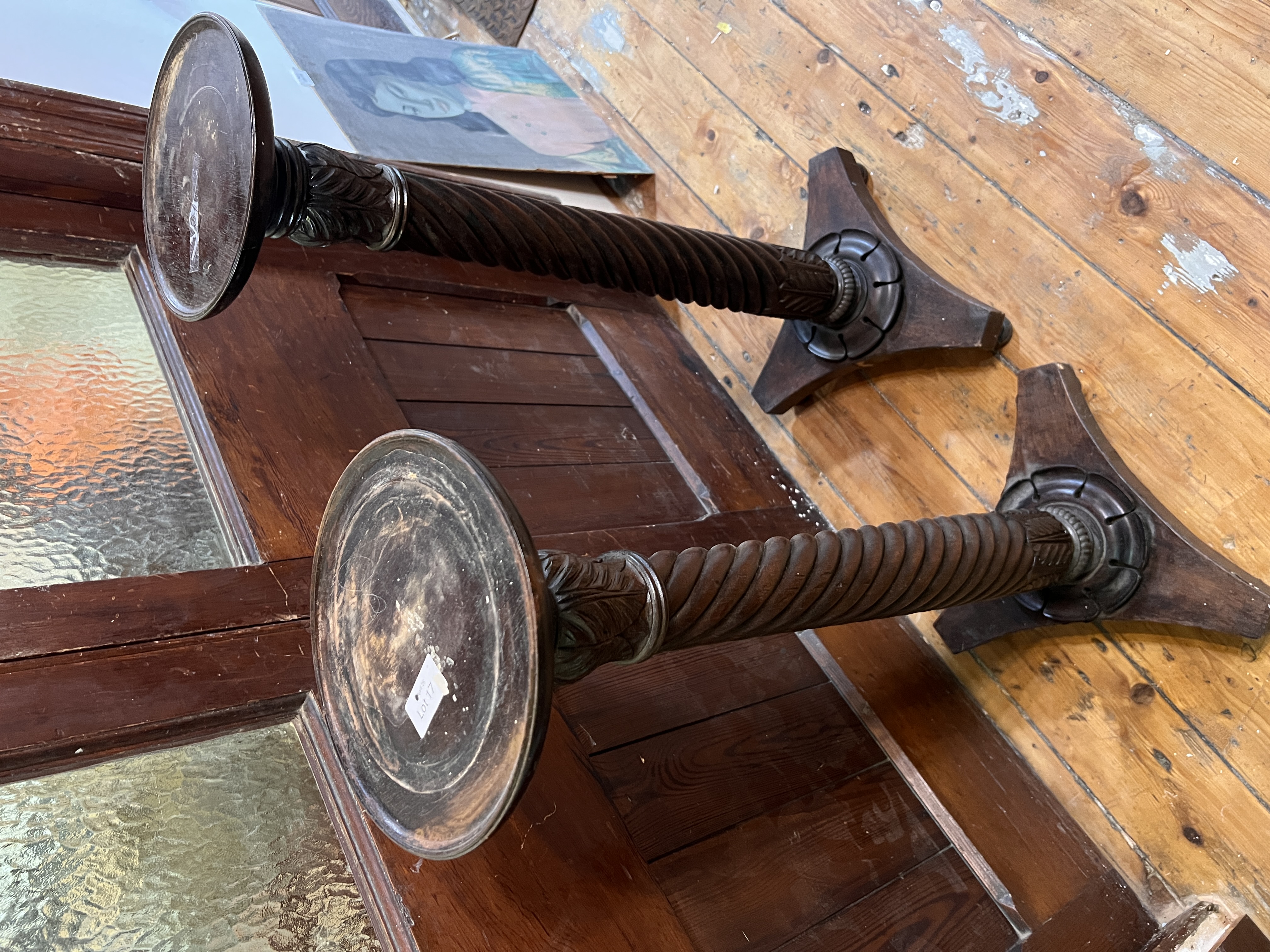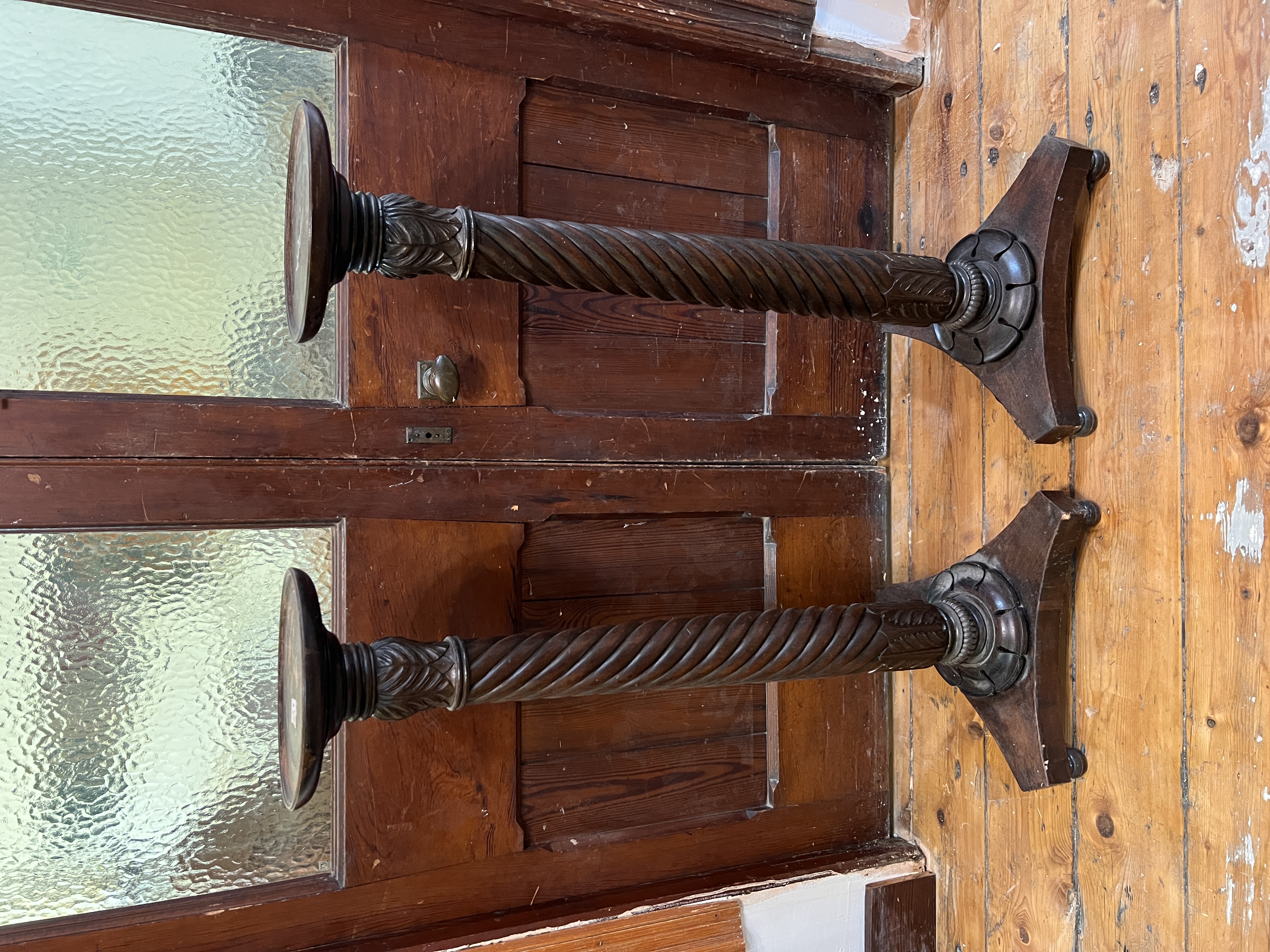 A pair of 20th century torchere stands having carved supports with tripod bases and acanthus decoration.