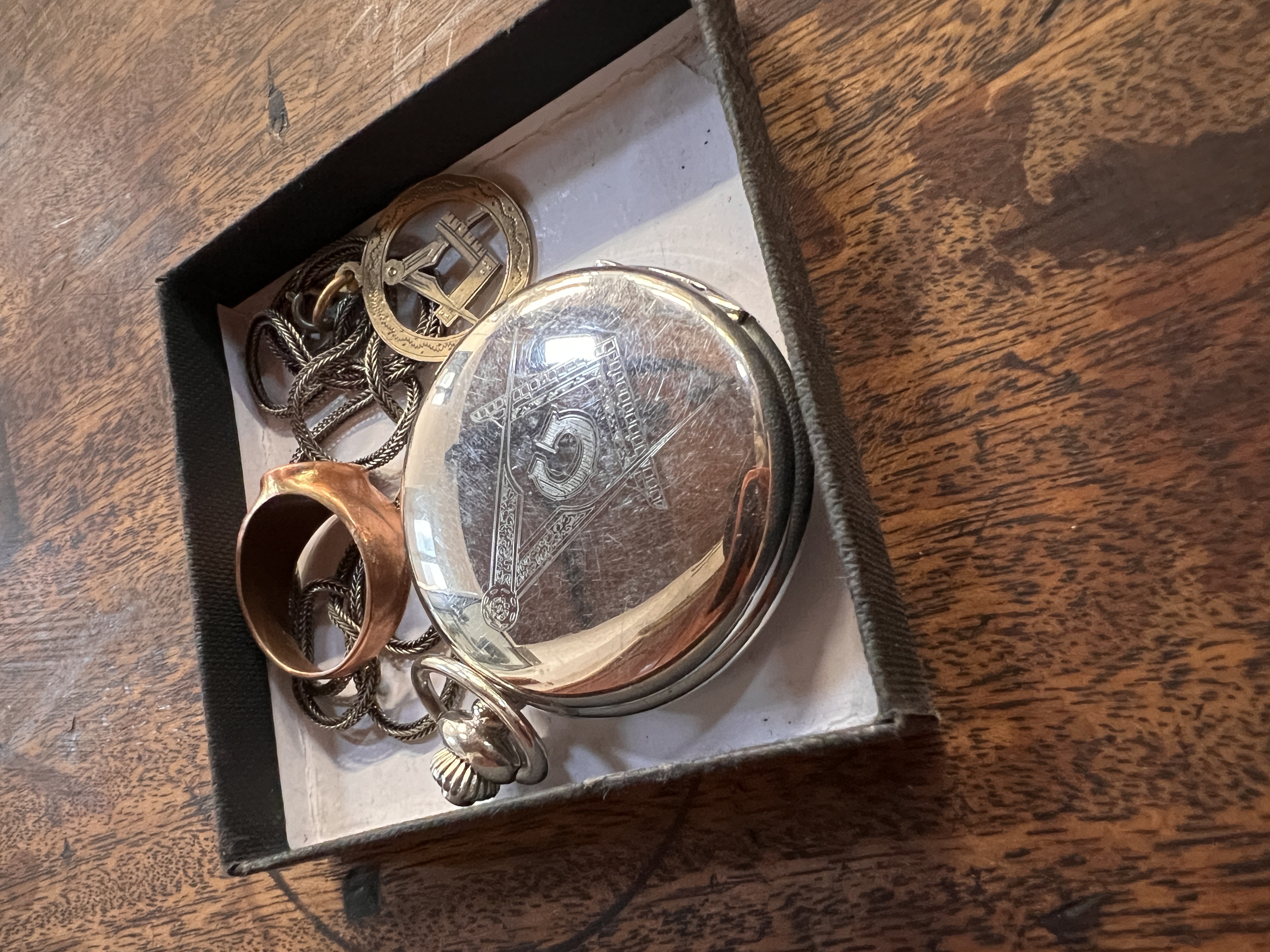 Masonic items including signet ring, necklace and pocket watch.