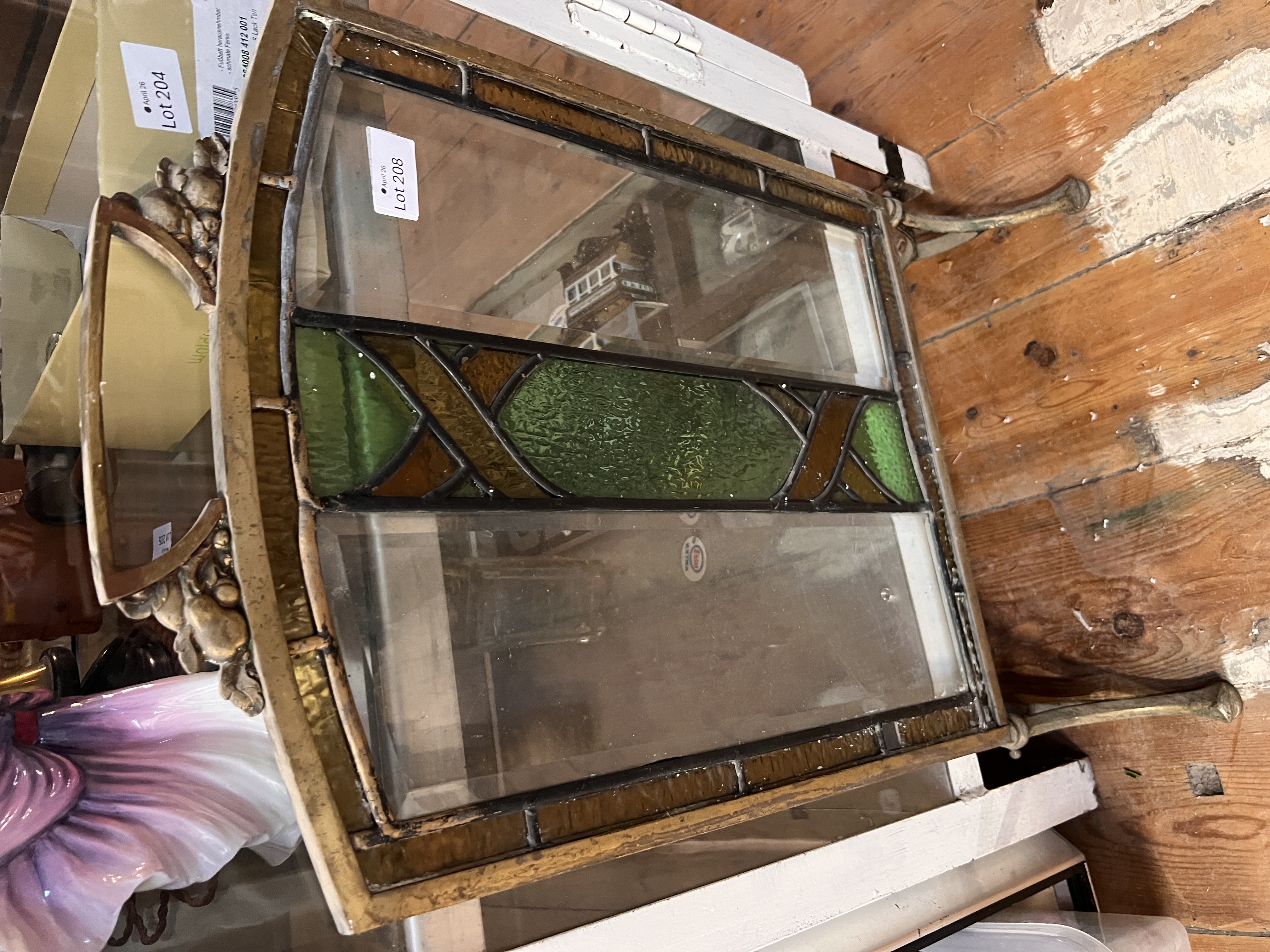 A Victorian Arts and Crafts style fire guard, bronze cast frame with leaded light glass frame.