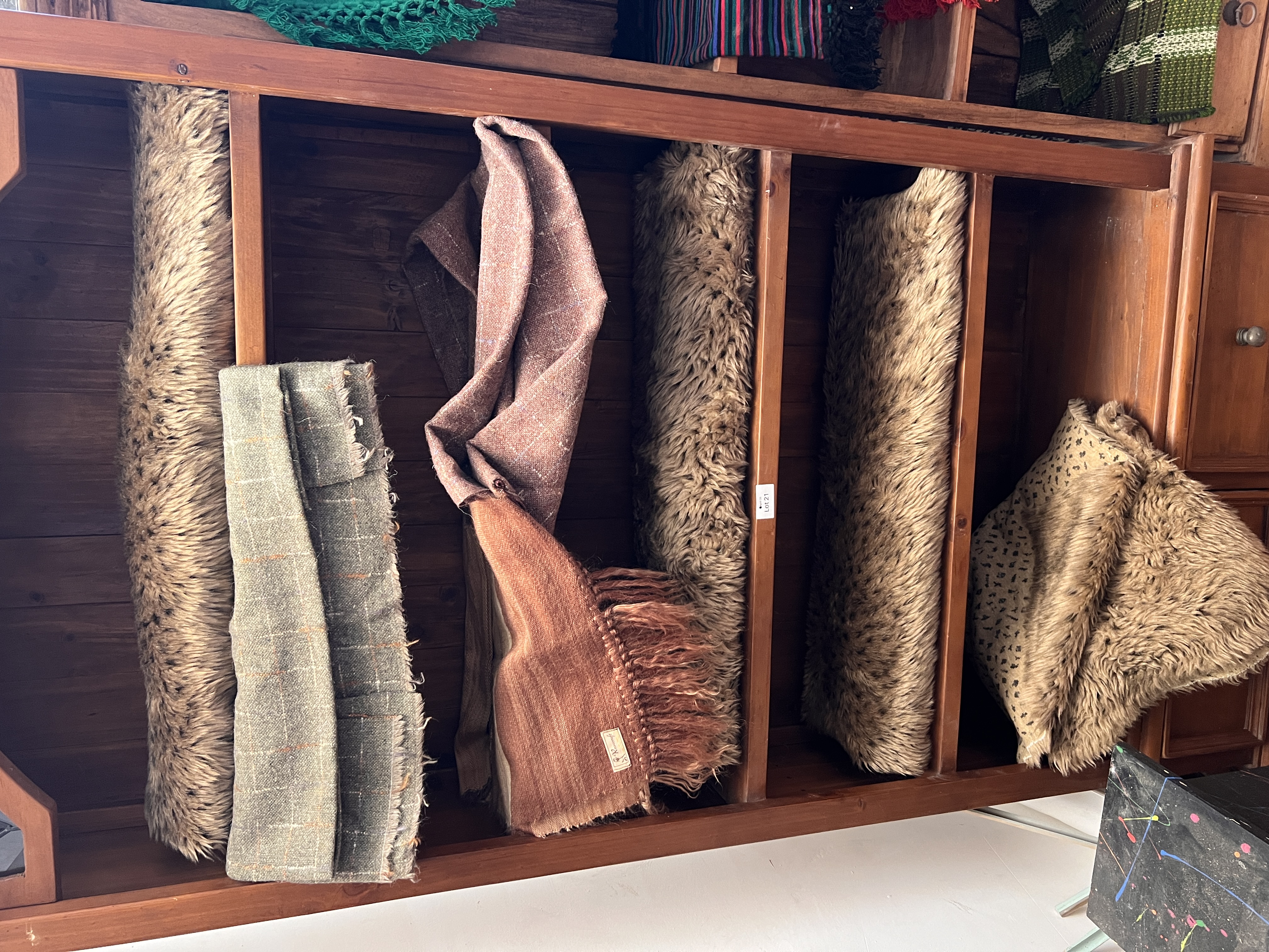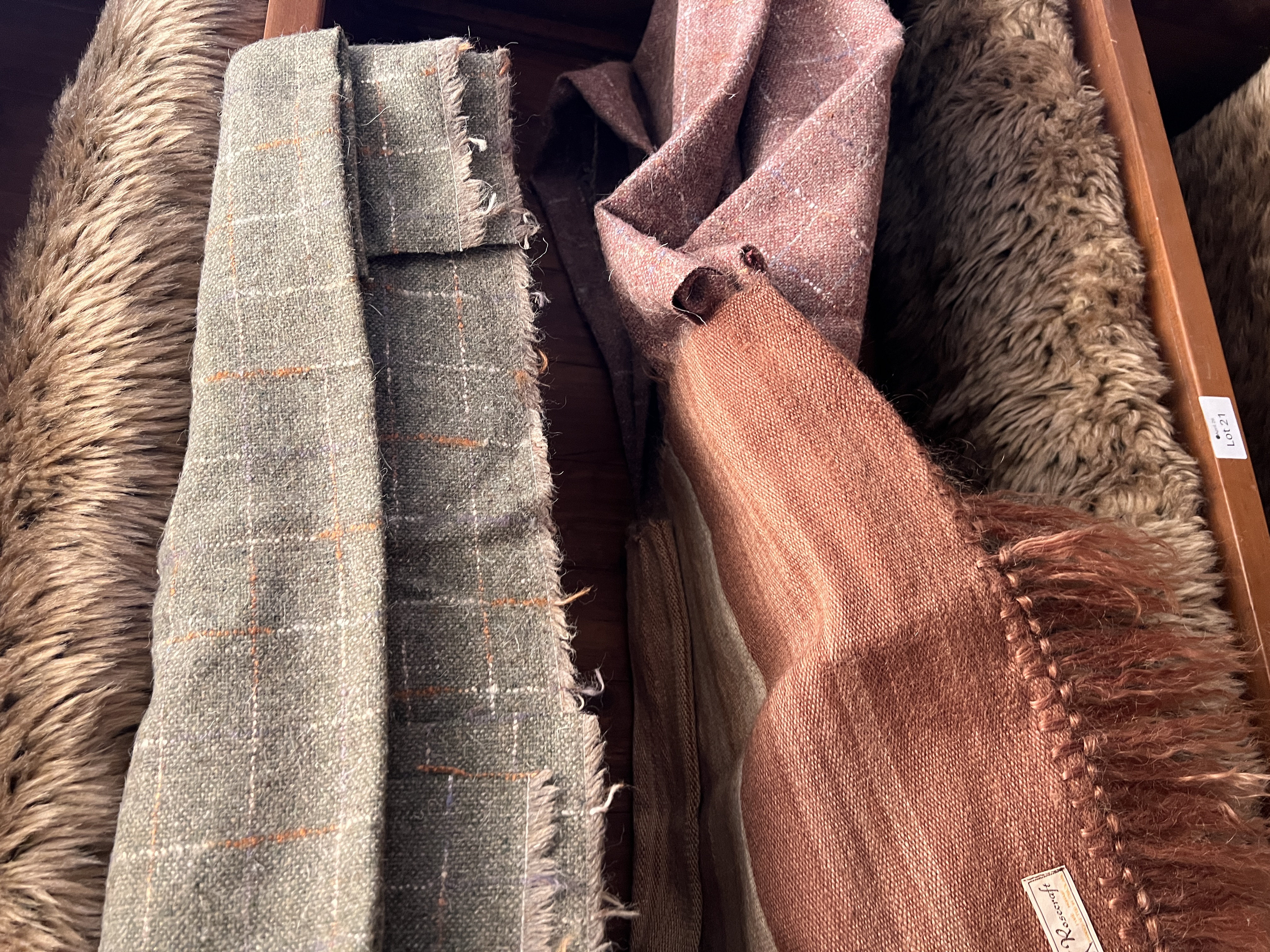 A selection of tweed and fur effect textiles, throws and blankets including Rosecraft.