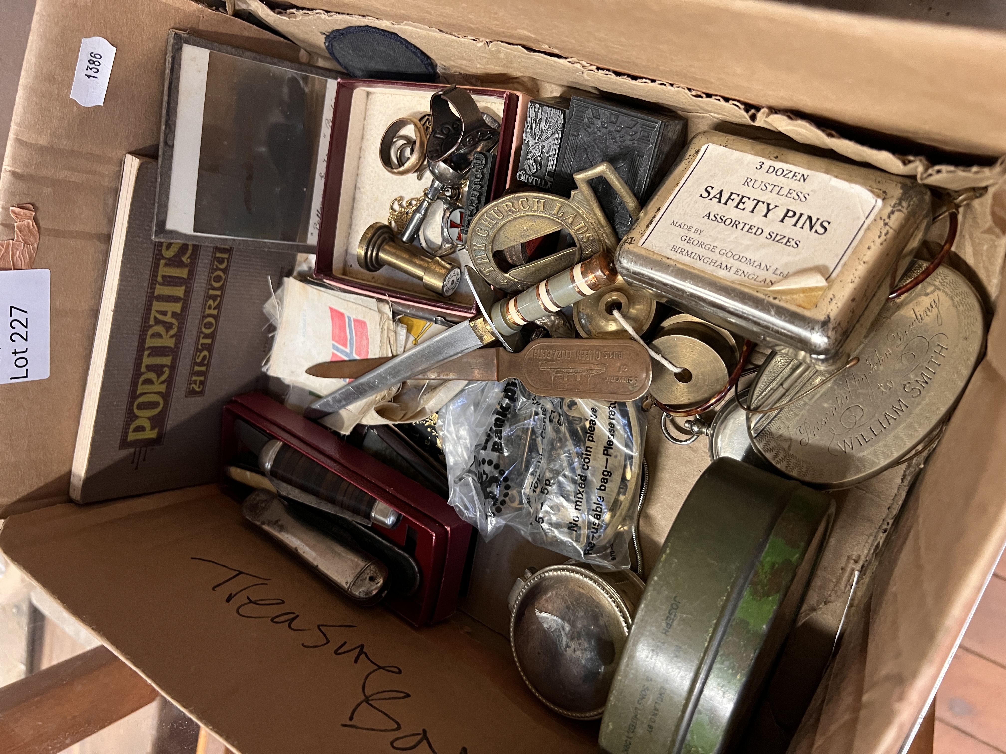 A selection of vintage curios and collectables including pocket and pen knives and stamps etc.