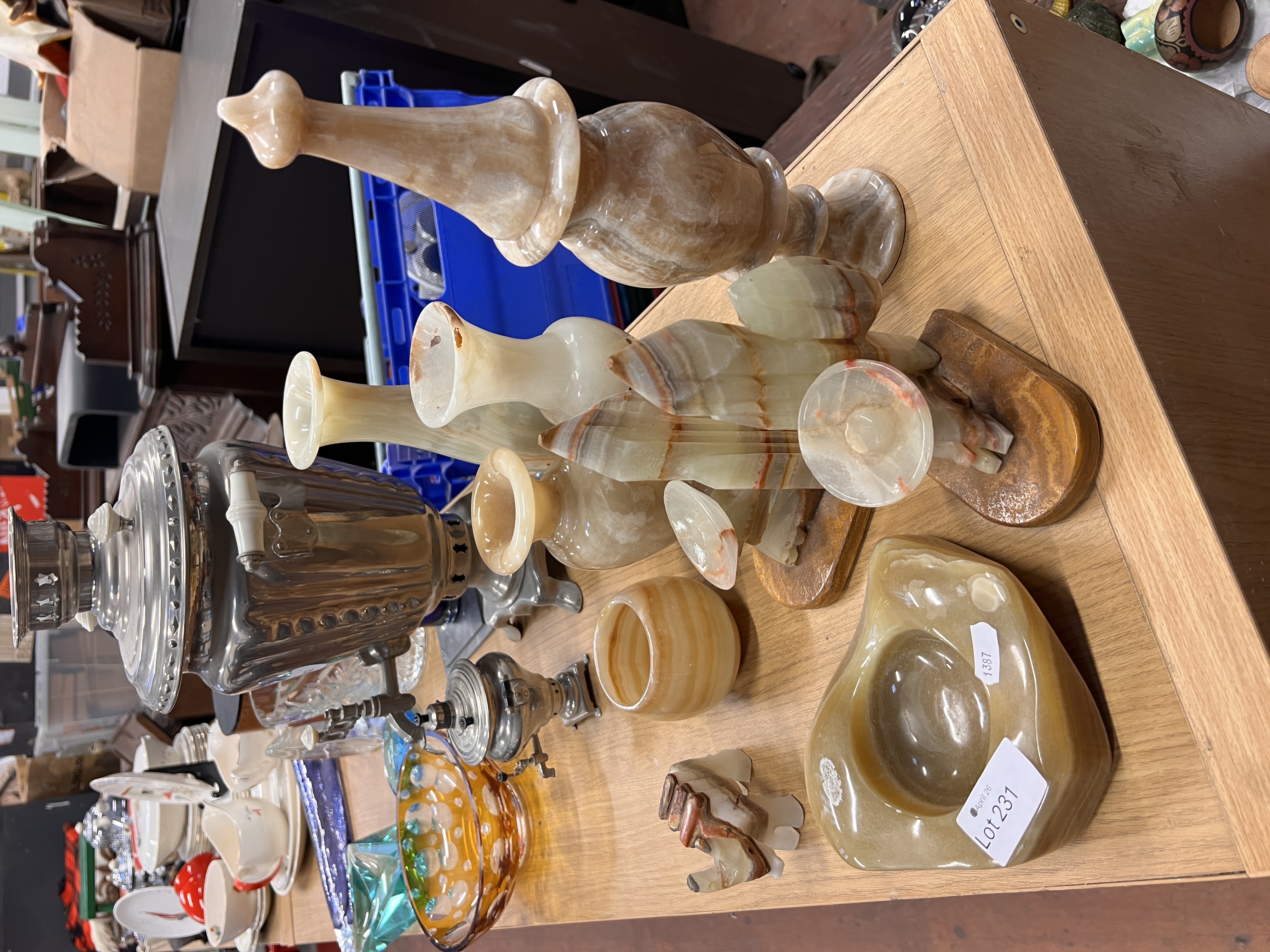 A selection of mid-century onyx stone carved items including bookends and vase.