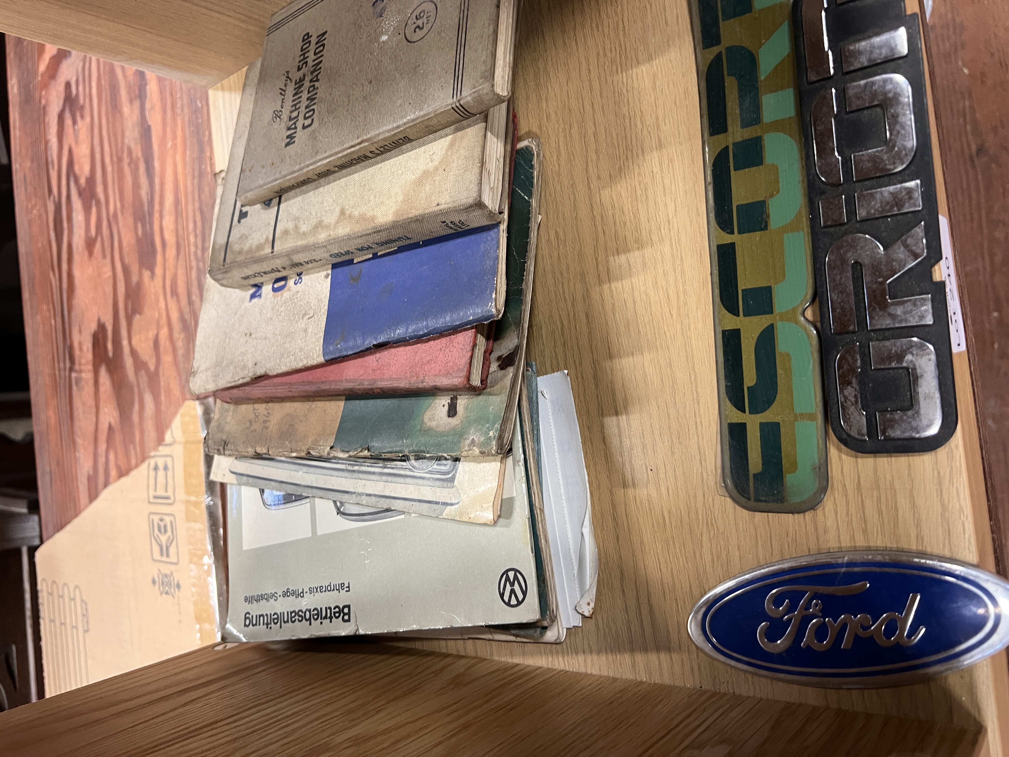 A selection of vintage car and automobile manuals and Ford Escort badge.