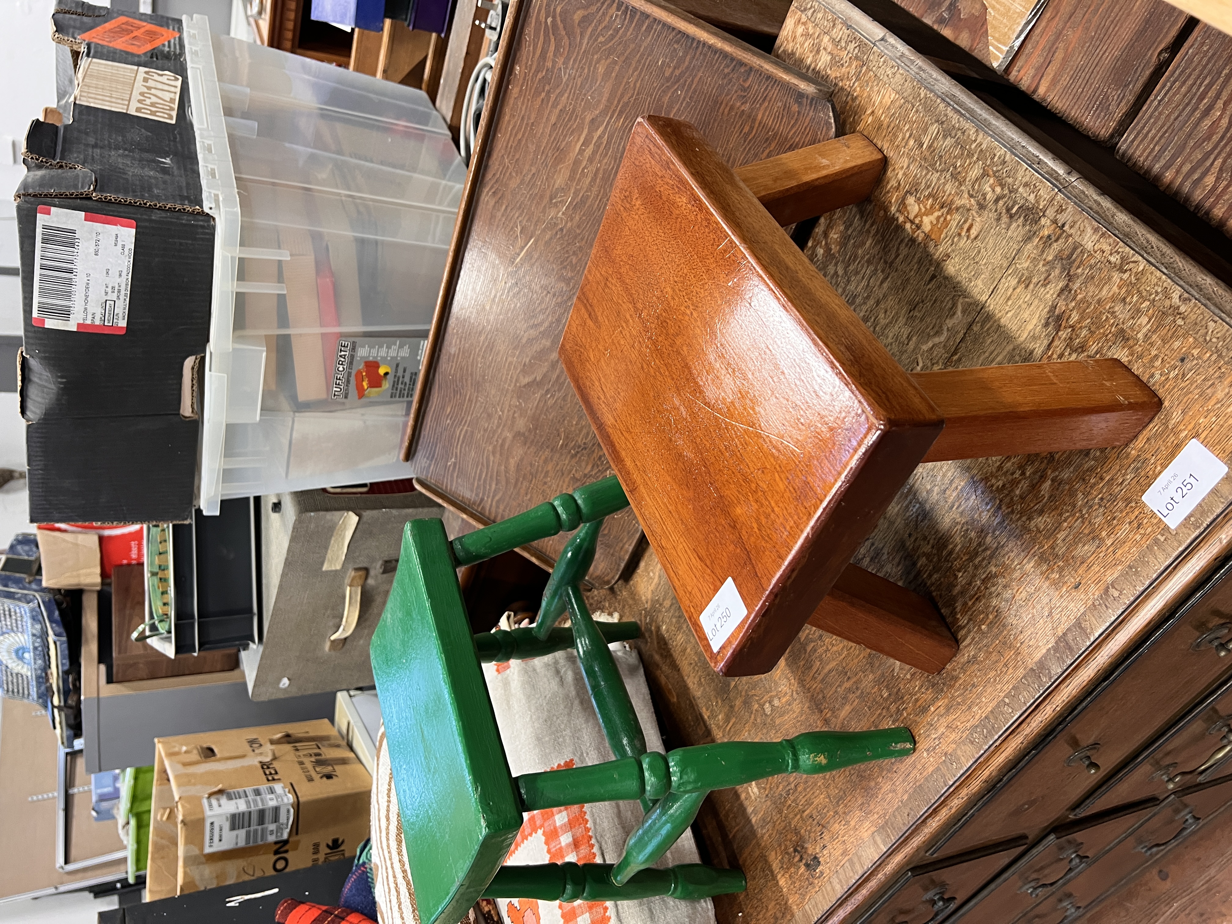Two vintage foot stools and a fold out oak tray.