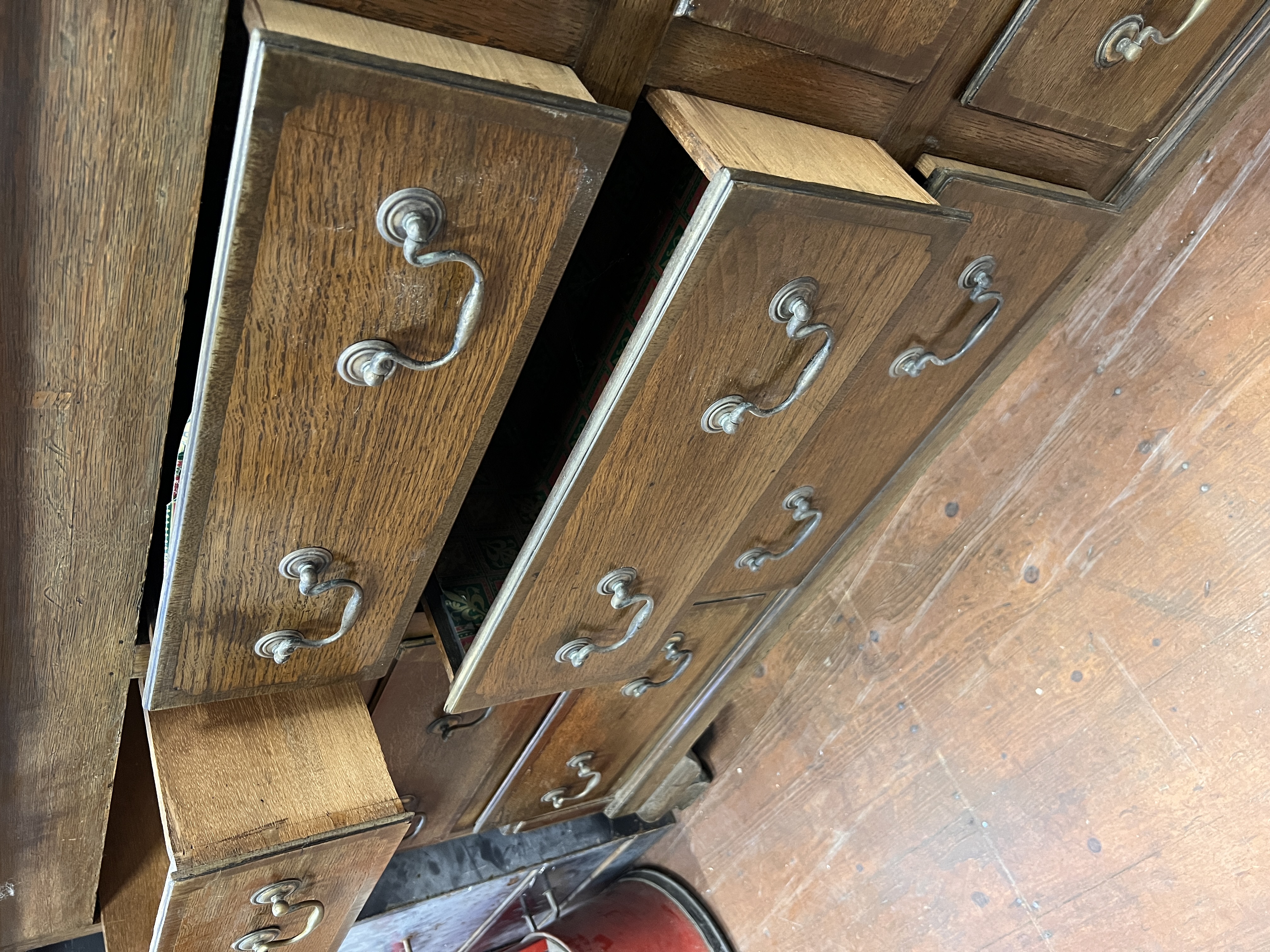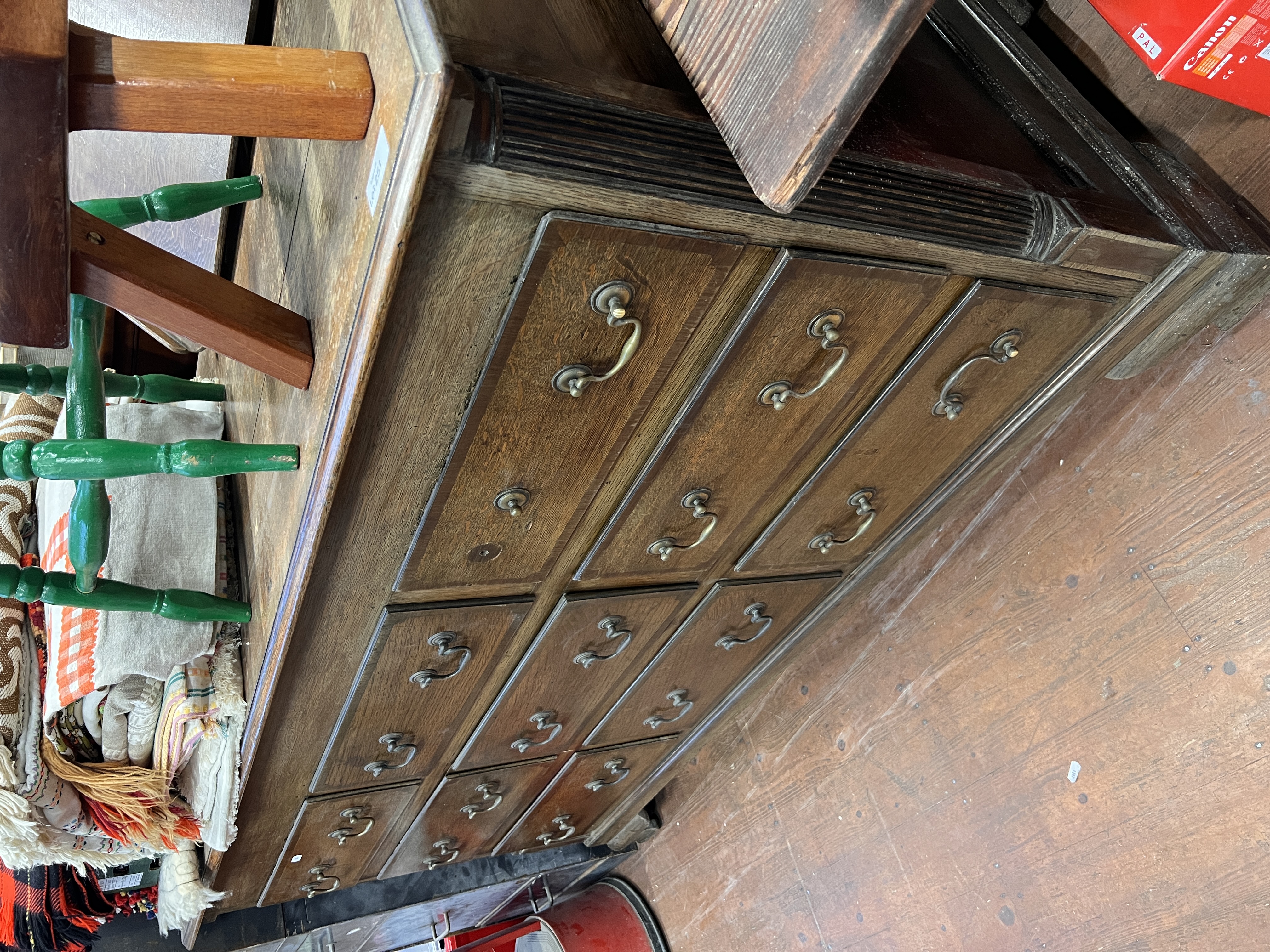 An antique oak mule chest of nine drawers with brass handles.
