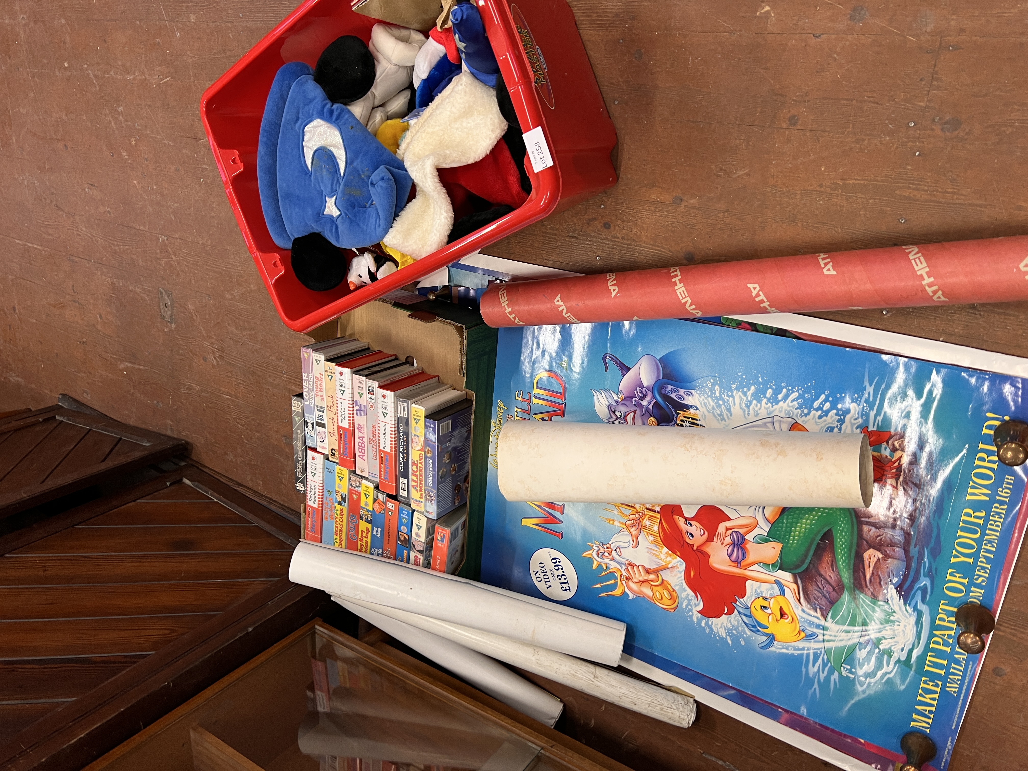 A selection of vintage Disney VHS advertising and similar posters and box of souvenirs and VHS.