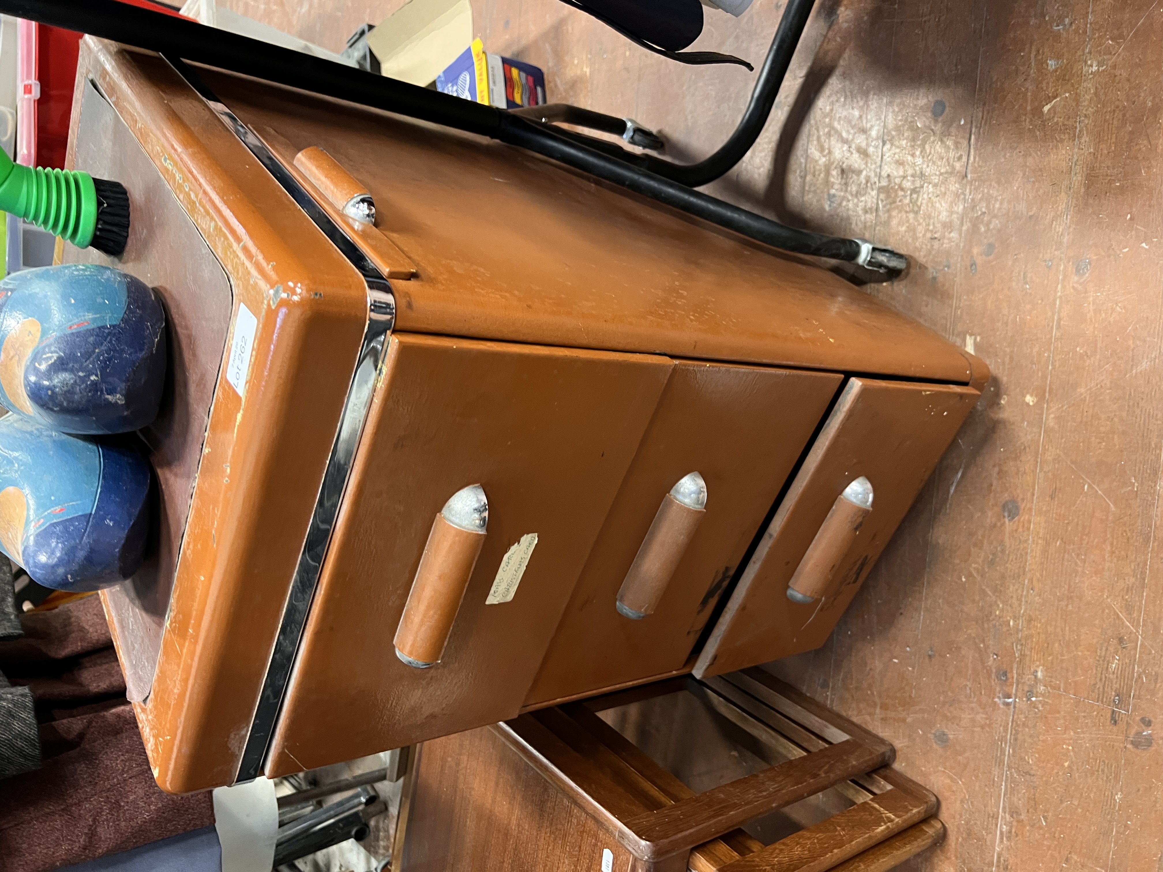 A vintage 1950’s industrial file cabinet with three drawers and side tray.