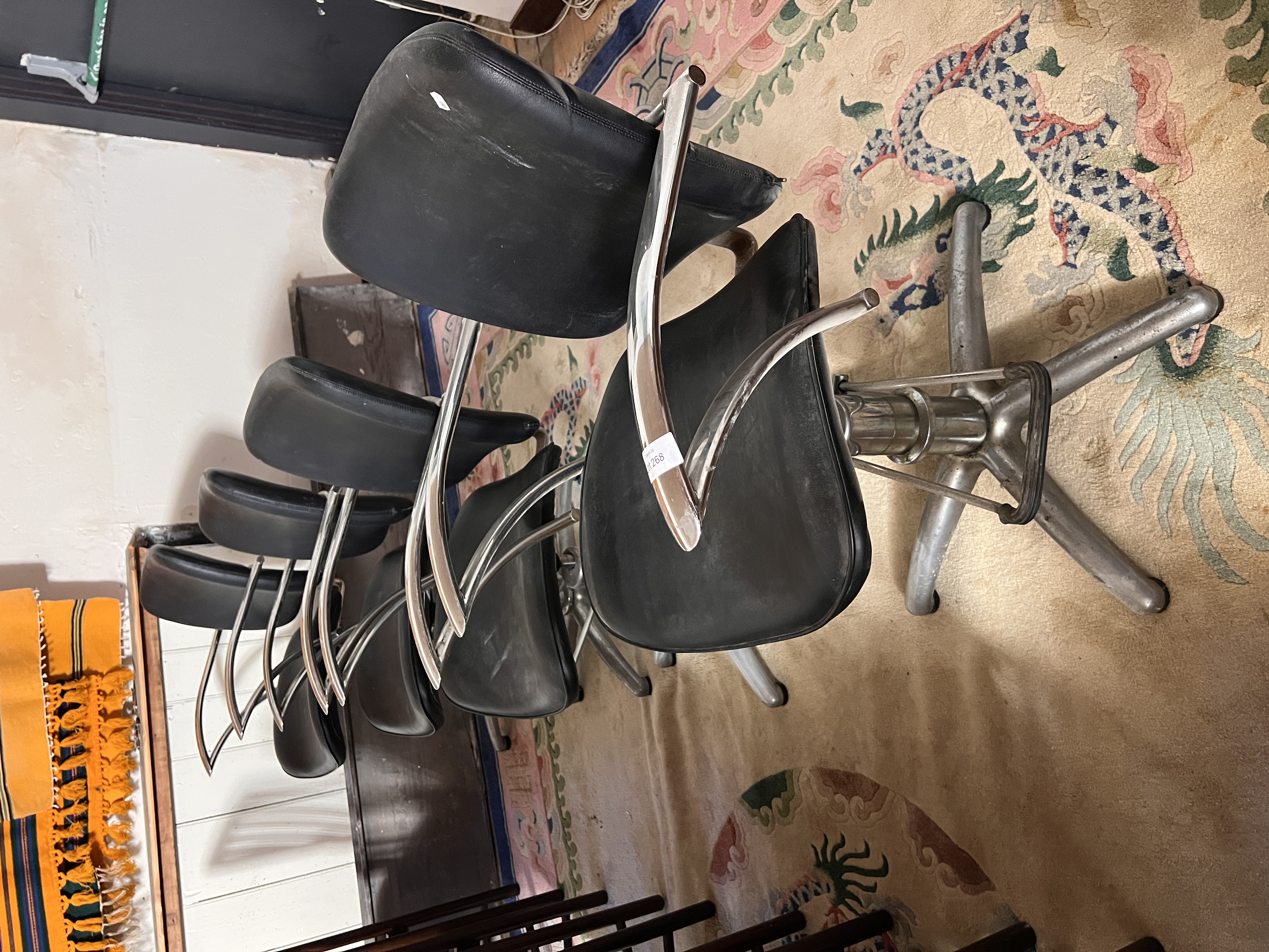 A set of four adjustable barbers or hairdressers chairs with heavy chrome frame and leather seats.