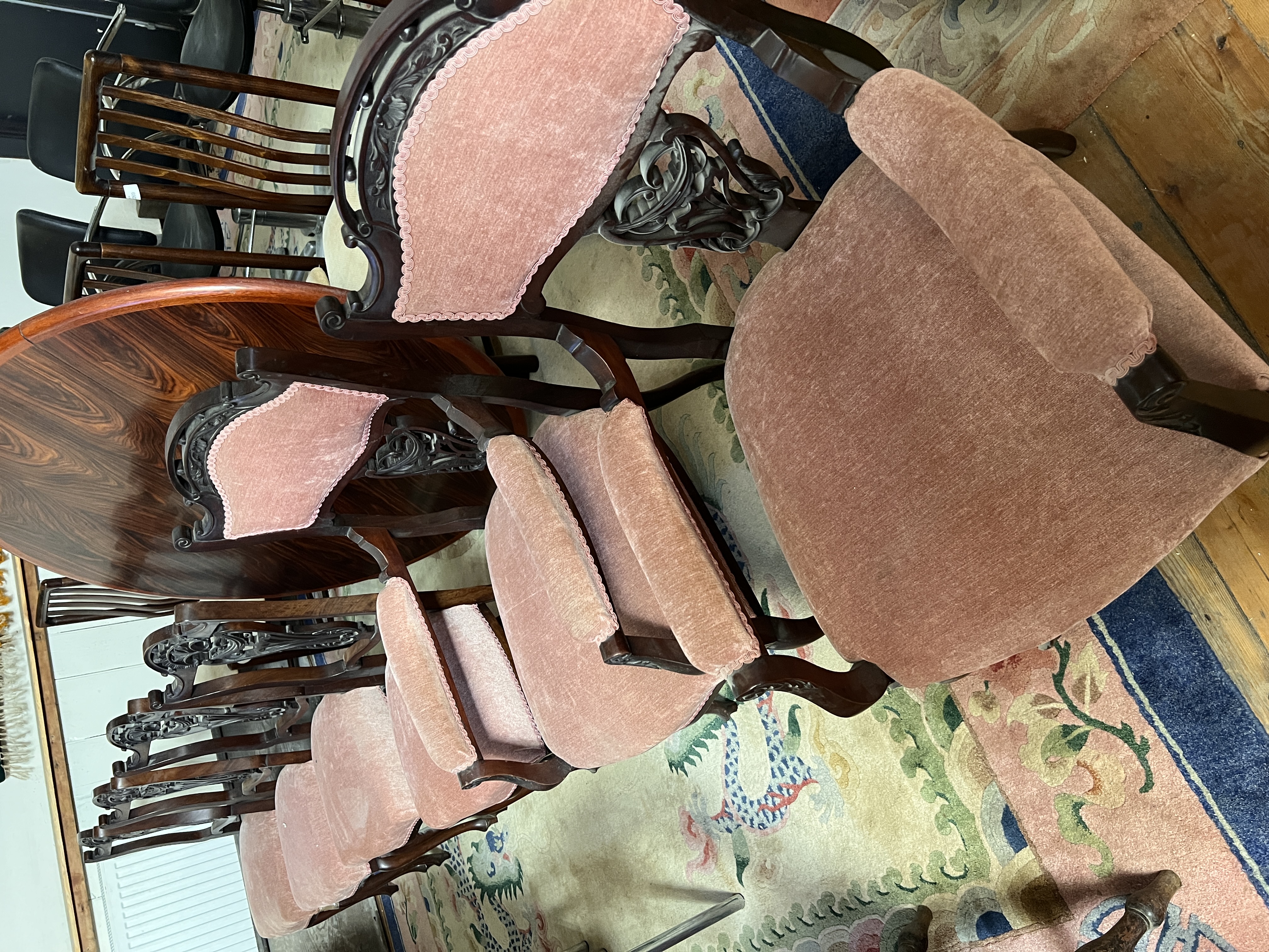 A set of six Victorian mahogany dining chairs with carved frames and backs.