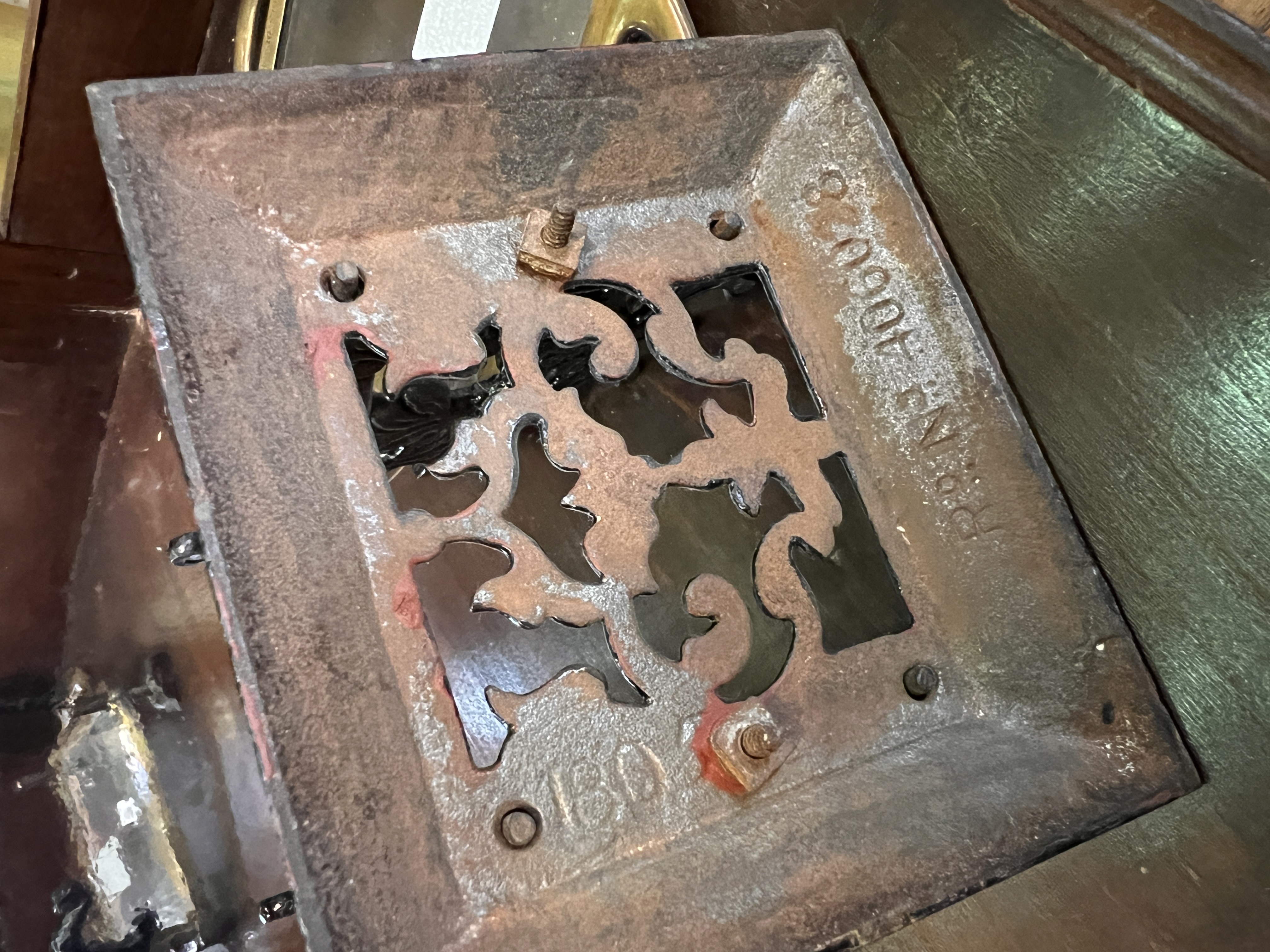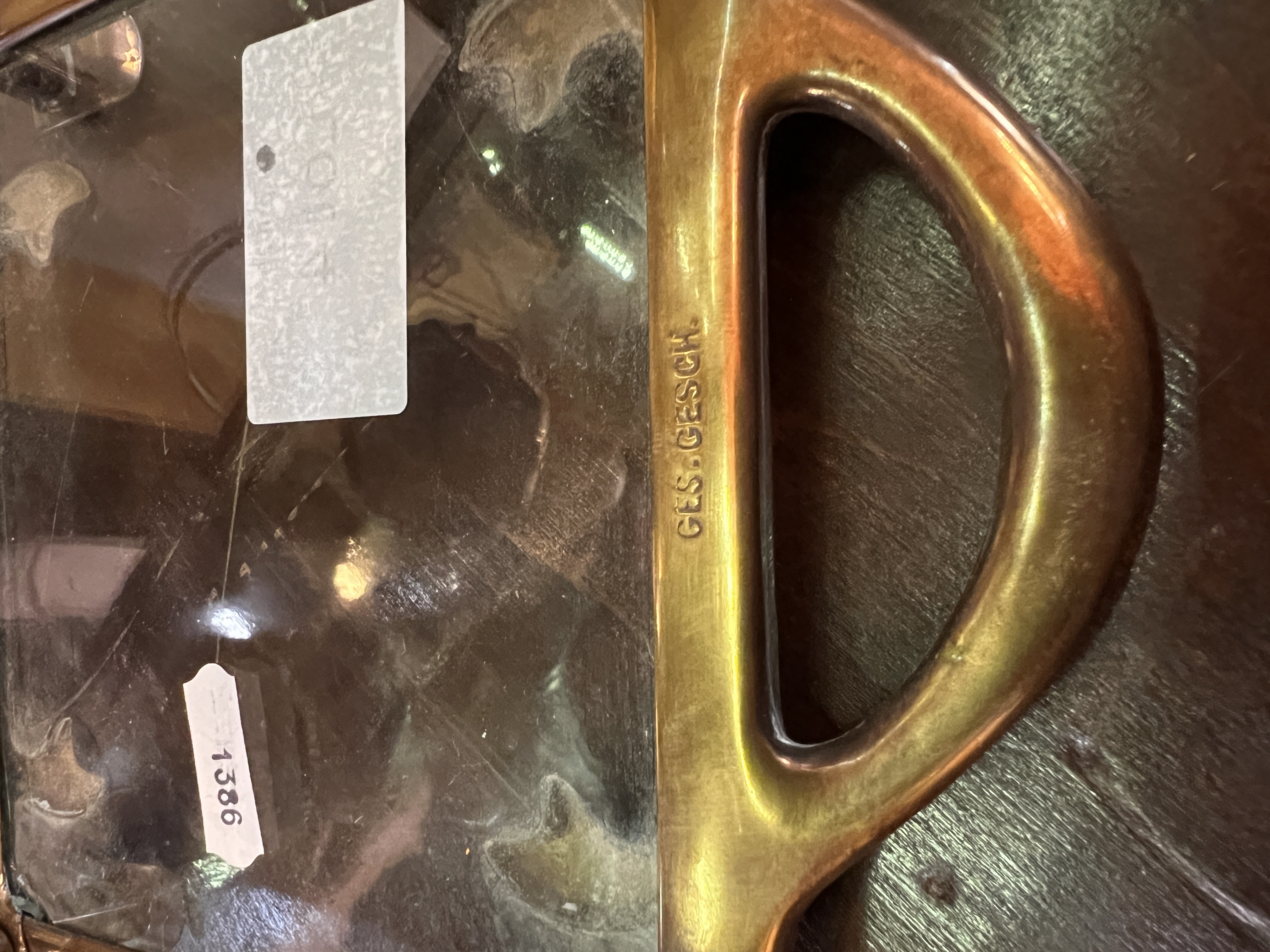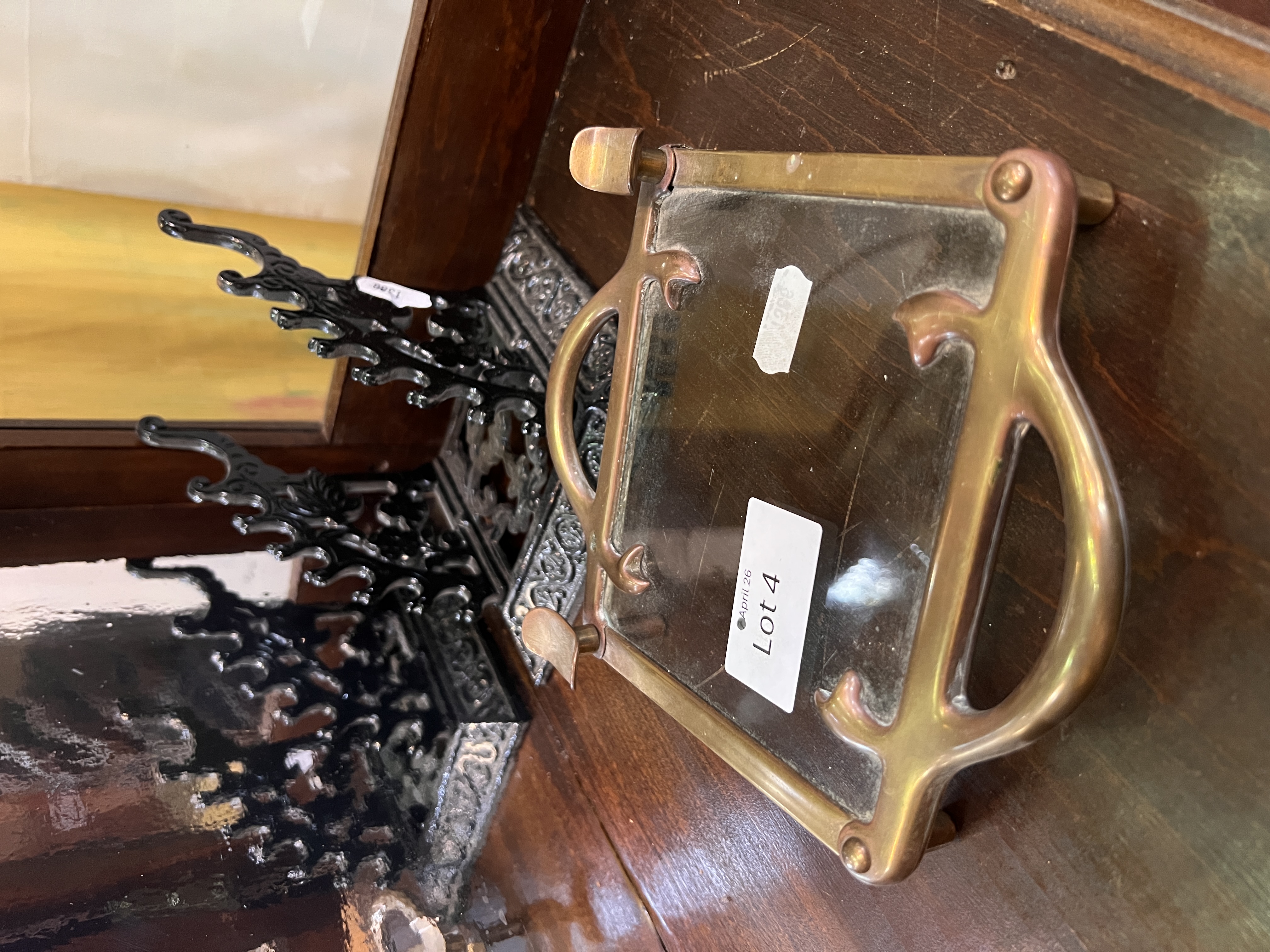 An Art Nouveau Ges Gesch brass and glass top desk top pen rest, with a similar cast Victorian pen display.