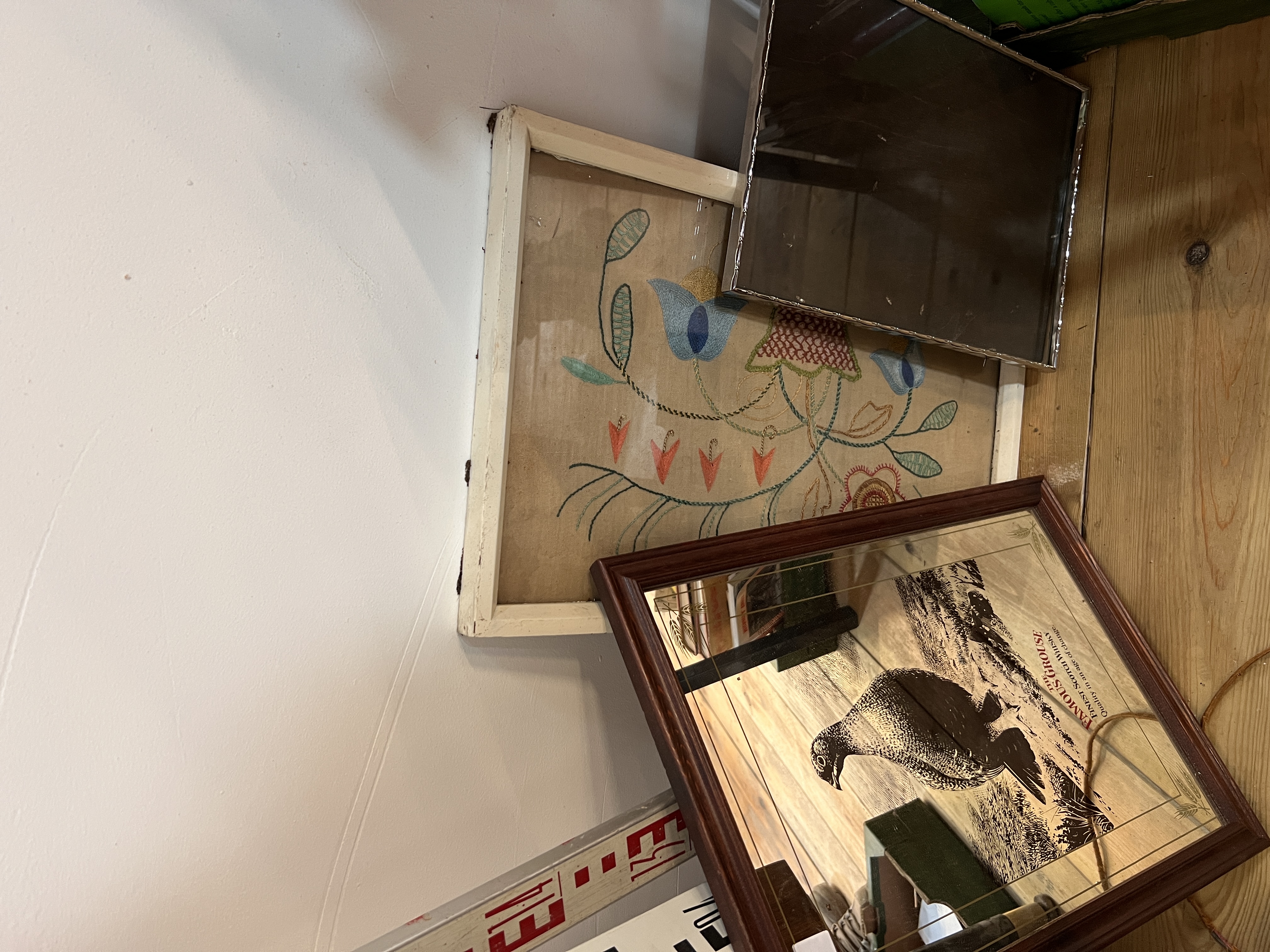 A vintage Famous Grouse advertising mirror with an Art Deco frame and embroidery.